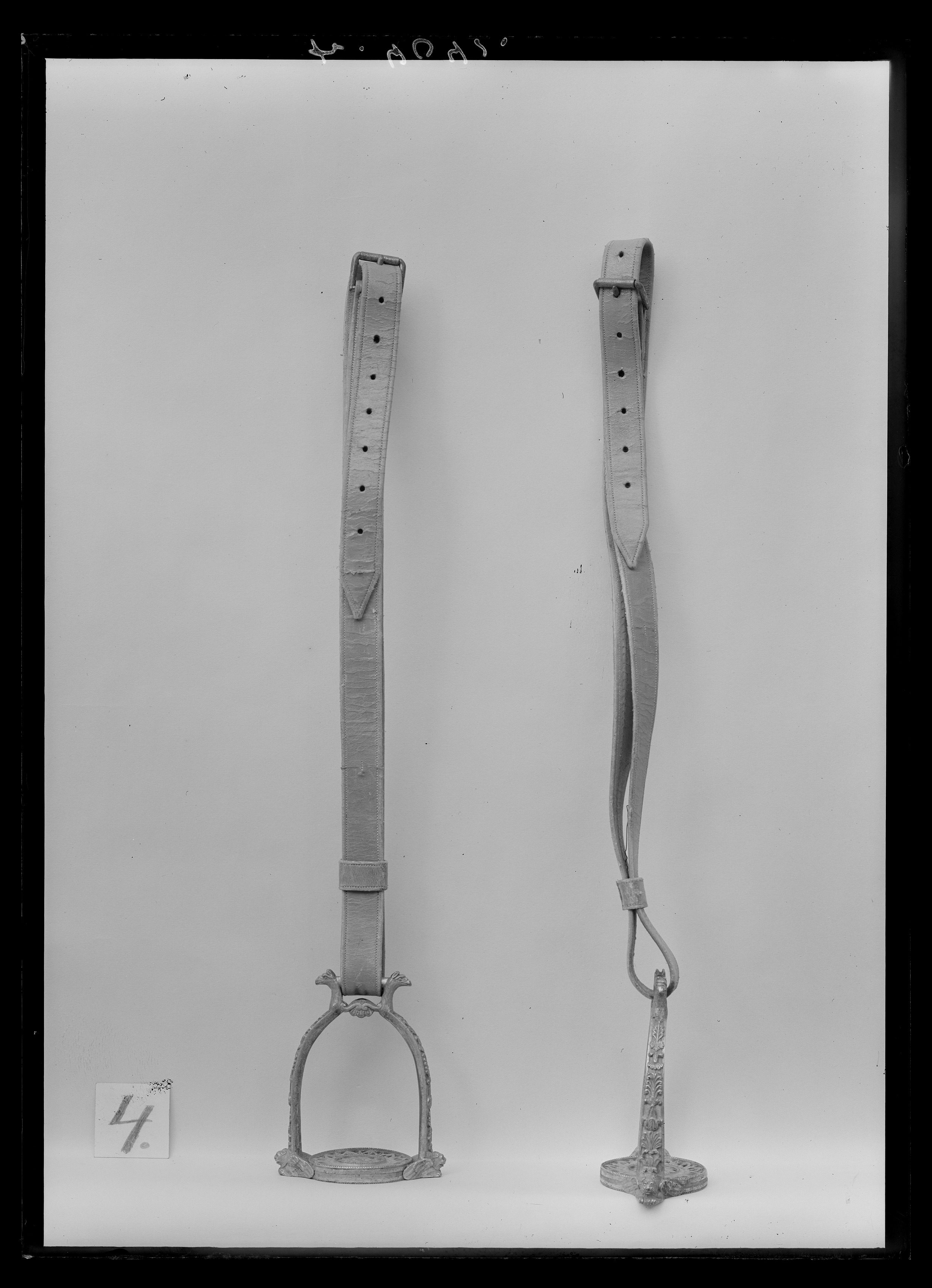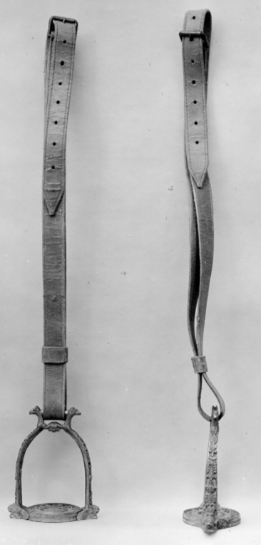 Sigbygel av förgylld mässing med U-formade skänklar, fast rektangulärt remläge i i form av två, från varandra vända ormhuvuden. Skänklarnas utsida med reliefornering i form av blad och palmetter. Nedtill vid trampstödet är skänklarna formade till ett bevingat lejon på var sida. Runt, genombrutet trampstöd i form av två koncentriska ringar. I mitten ett blomornament, utanför detta en bladbård.