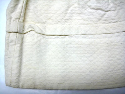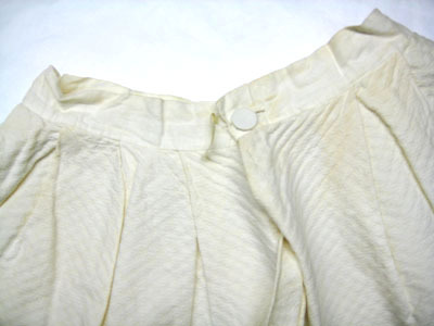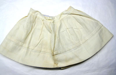Vit kjol sydd i bomull där tyget är vävt i kypert med rombmönster (vit piké) vilket ger tyget en struktur. Linningen är av tunt bomullstyg och är 70 mm bred. Runt kjolen är veck (40 mm breda) fördelade som ger vidd till kjolen. Kjolen knäpps med en knapp som är 15 mm bred och knapphålet är 12 mm bred. Invändigt på varje sida är ett band fastsytt, 150 mm långt och 10 mm brett.