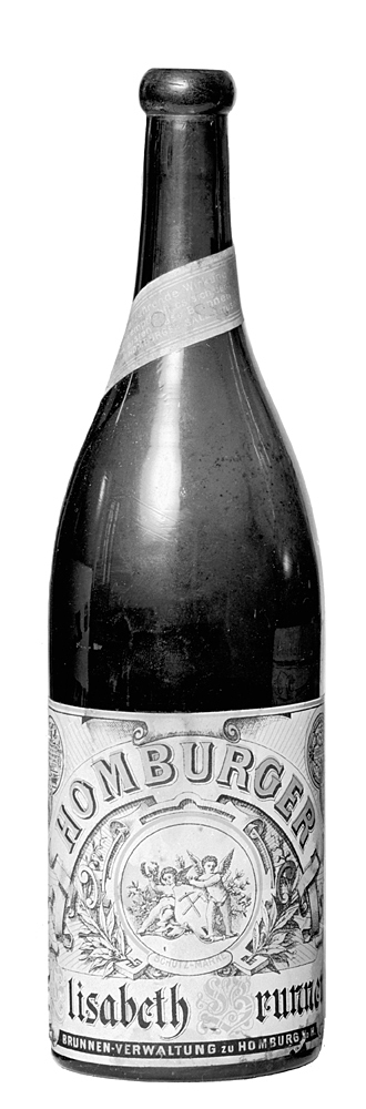 HOMBURGER ELISABETH BRUNNER, Homburg vor der Höhe, tio helbuteljer Av gulgrönt glas. Cylindriska, med sluttande skuldra och lång smal hals med stärkring; bottnen insänkt. Etikett vit, gående runtom, på denna text i svart och rött jämte varumärke och prismedaljer m. m. i svart; på halsen en långsmal etikett, varpå text i vitt mot röd botten. Höjd: 30,2 cm.; diameter: 8,3 cm.