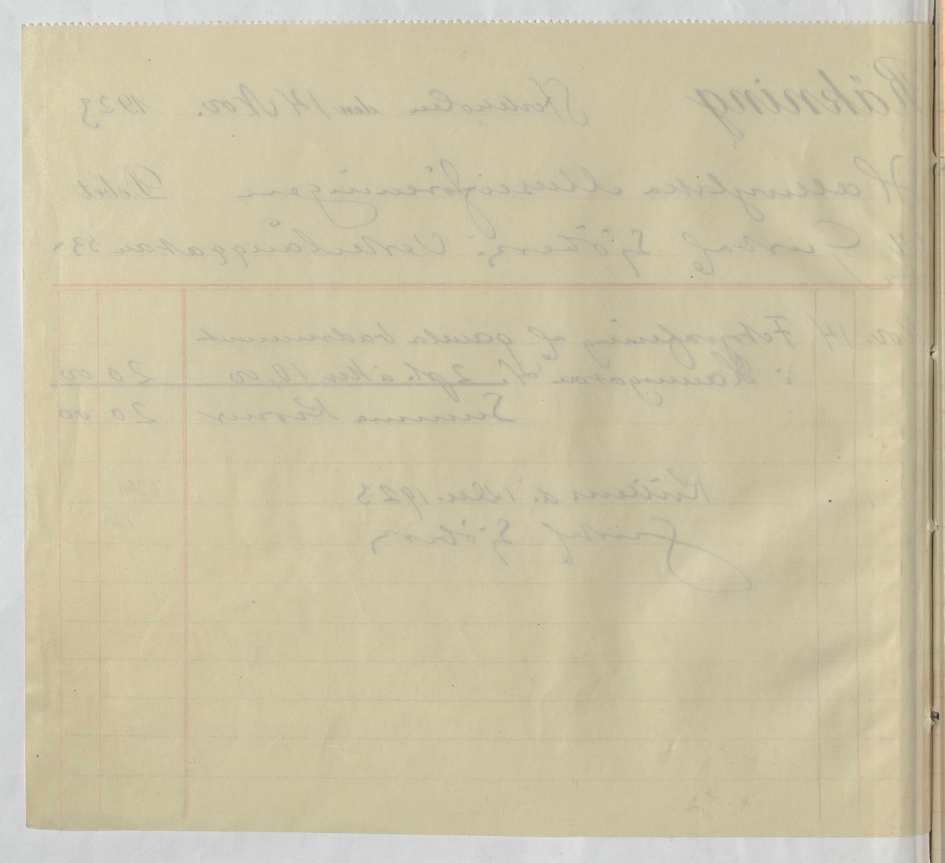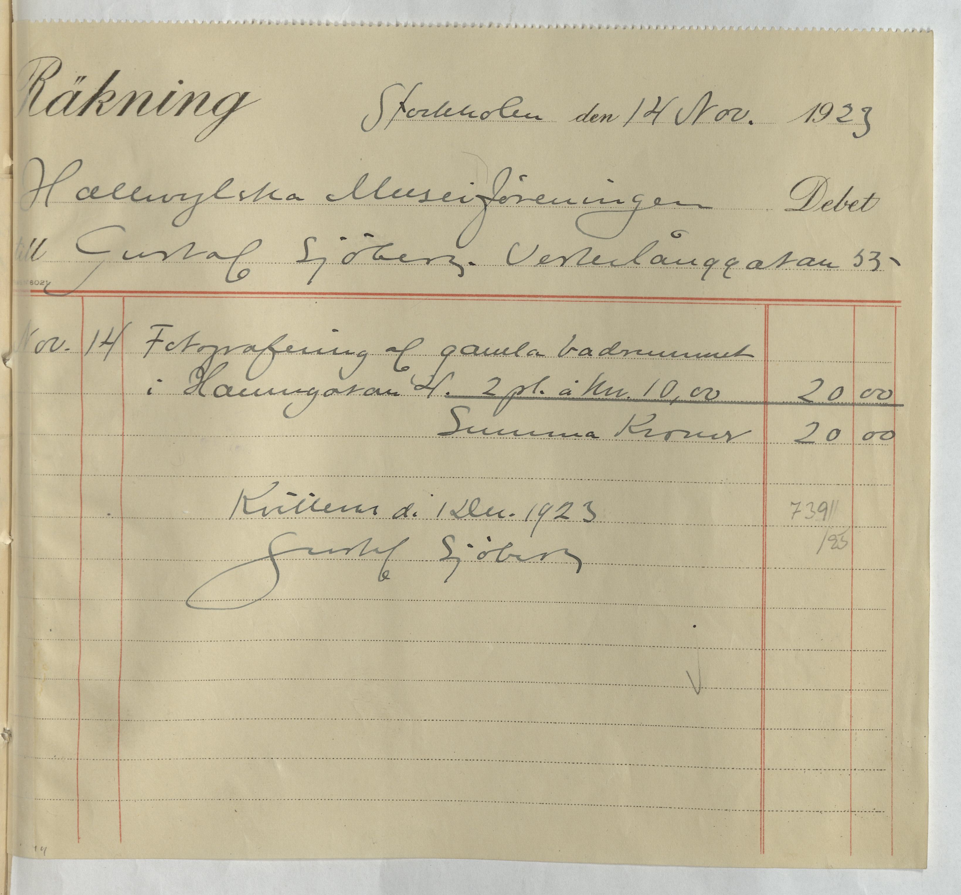 Kvitto från Gustaf Sjöberg. Gällande betalning för hans arbete med fotografering av museisamlingarna. Stockholm, 1923.