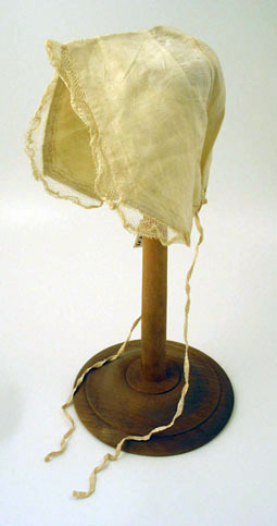 Vit barnmössa av lärft (linne?) med spetskant, 12 mm bred, samt en 6 mm bred broderad dekoration i form av en stiliserad blomsterslinga längs de främre kanterna. Mössan är sydd i två delar med ett bakstycke och ett framstycke som förenas av en söm som löper över bakre delen av hjässan, från öra till öra. Sidokanterna är avfasade nedtill. Förstärkning fram i form av dubbelt tyg, 53 mm bred i mitten upptill. 4 mm breda knytband är fästa bak i nederkanten i ett flätliknande mönster, för att knytas under hakan. Knytbanden går på grund av flätningen att spänna. Långa knytband.