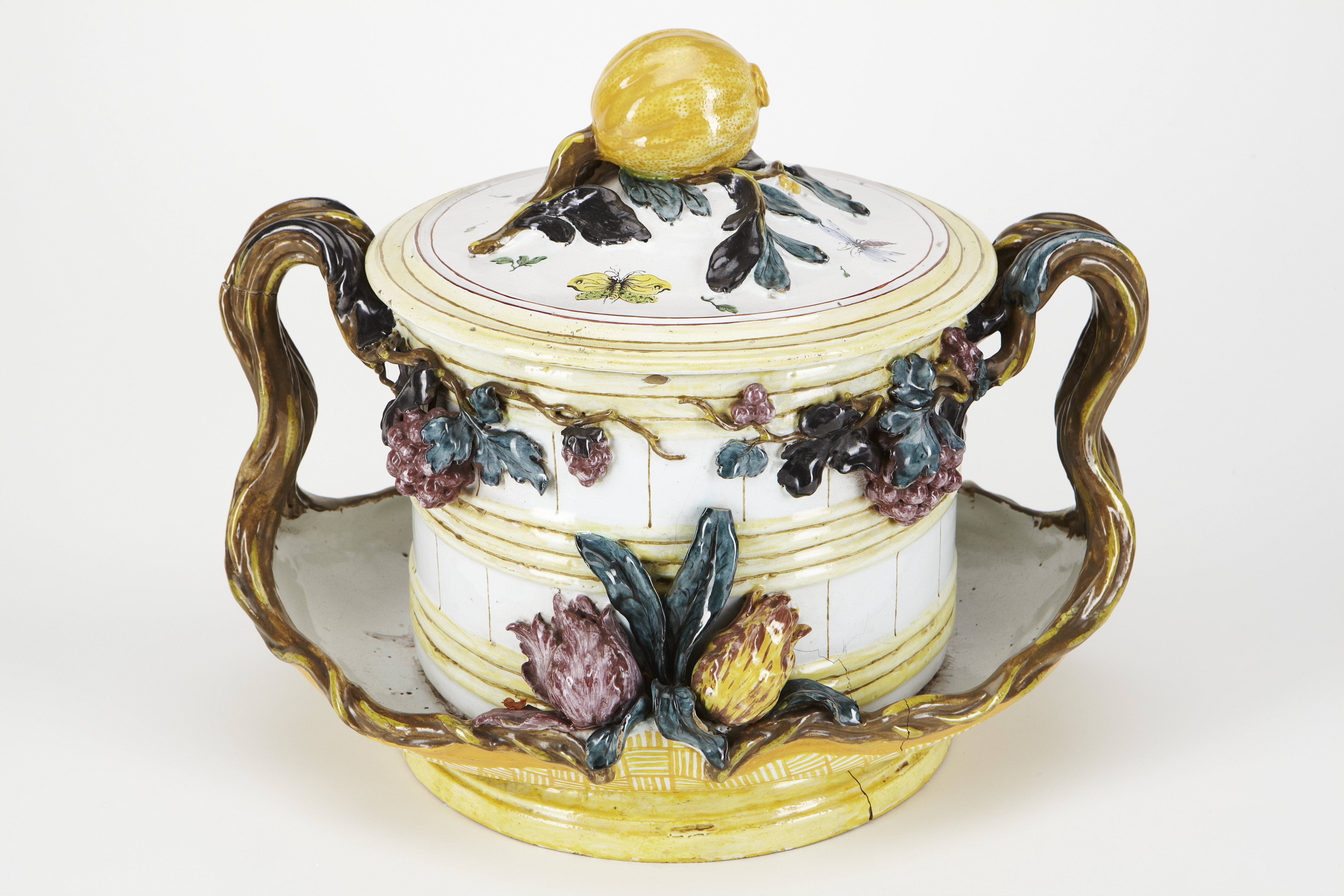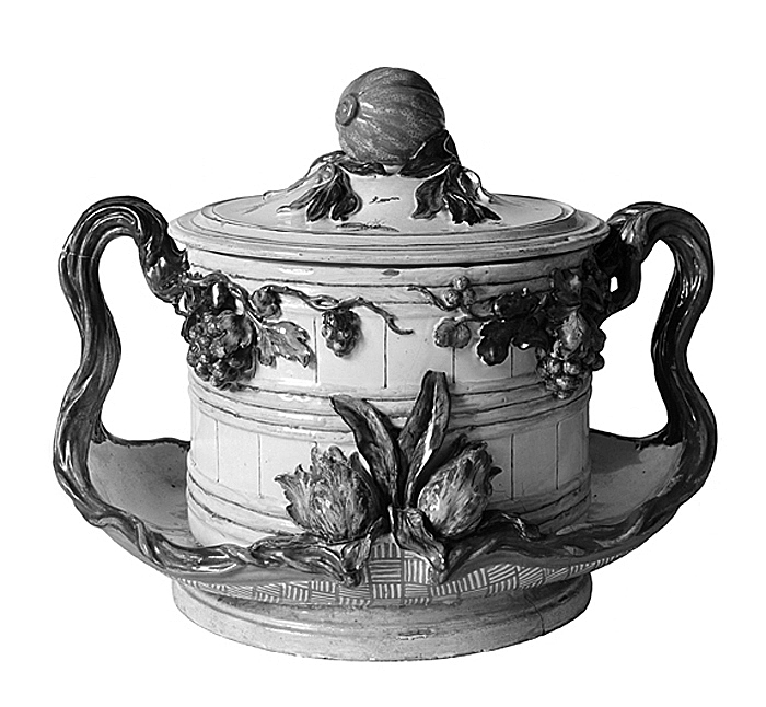 Bål med lock, på fast fat. I form av en laggad balja med tre bandgrupper, fyra band i den mellersta och tre i de övriga, samt med rundat ovalt tvärsnitt; stående på ett avlångt fat med vid lång- och kortsidorna uppviken kant samt på profilerad rund fotkant, kortsidorna dessutom spetsigt utdragna, från vardera utgående upp mot bålens brädd ett vertikalt handtag i form av två jämnlöpande, vid mitten inböjda vinrankor, vilka upptill och nertill svänga åt var sitt håll, de övre följande bräddens utsida, de nedre fatets kant, de förra dessutom med druvklasar och löv i fri relief; på vardera sidan av fatets kant mellan handtagen likaledes i fri relief två tulpaner jämte blad, på ena sidan en vänd uppåt och en nedåt, på den andra båda uppåt. Dekor: I relief samt i muffelfärger på tennglasyr. Godset blekt gråbrunt. På bottnens utsida en märkning i rödbrunt samt en stämpel. Lock: Runt med uppsvängd mitt och profilerad kant samt rakt nedåtriktad kort sarg. Knopp stor, i form av en citronliknande gul frukt på grönbrun kvist med blad i svartbrunt och grågrönt samt tre ärtliknande småfrukter i gult, det hela i fri relief; på översidan dessutom fem insekter, därav två fjärilar; mellan insekterna strödda blad i grönt. På lockets insida en otydlig märkning i blått. Höjd 31,5 cm, utan lock, höjd med handtag 24 cm. Balja, diameter 23,5-25 cm. Fat, längd 40 cm, bredd 31 cm. Lock, höjd 11 cm, diameter 26 cm.