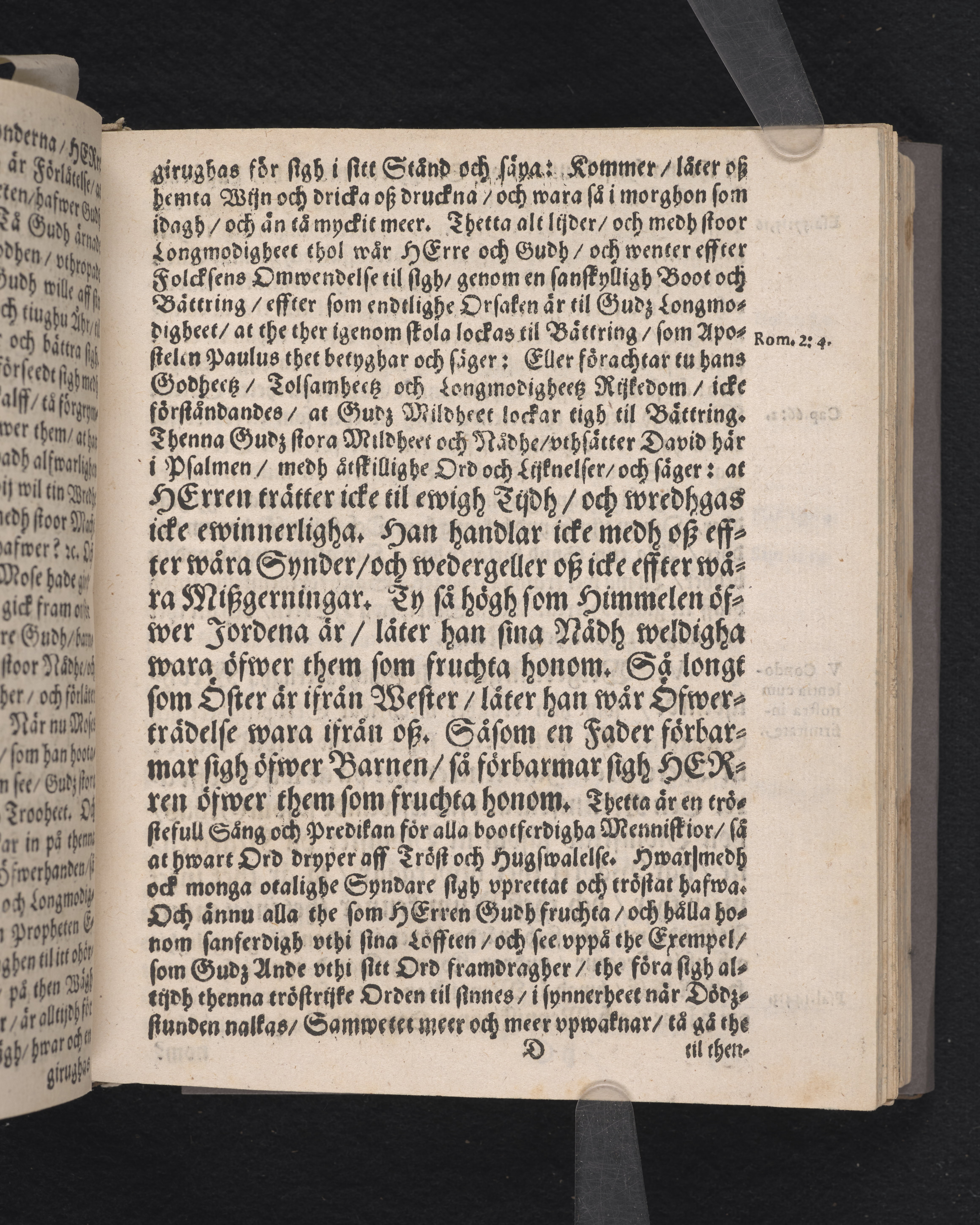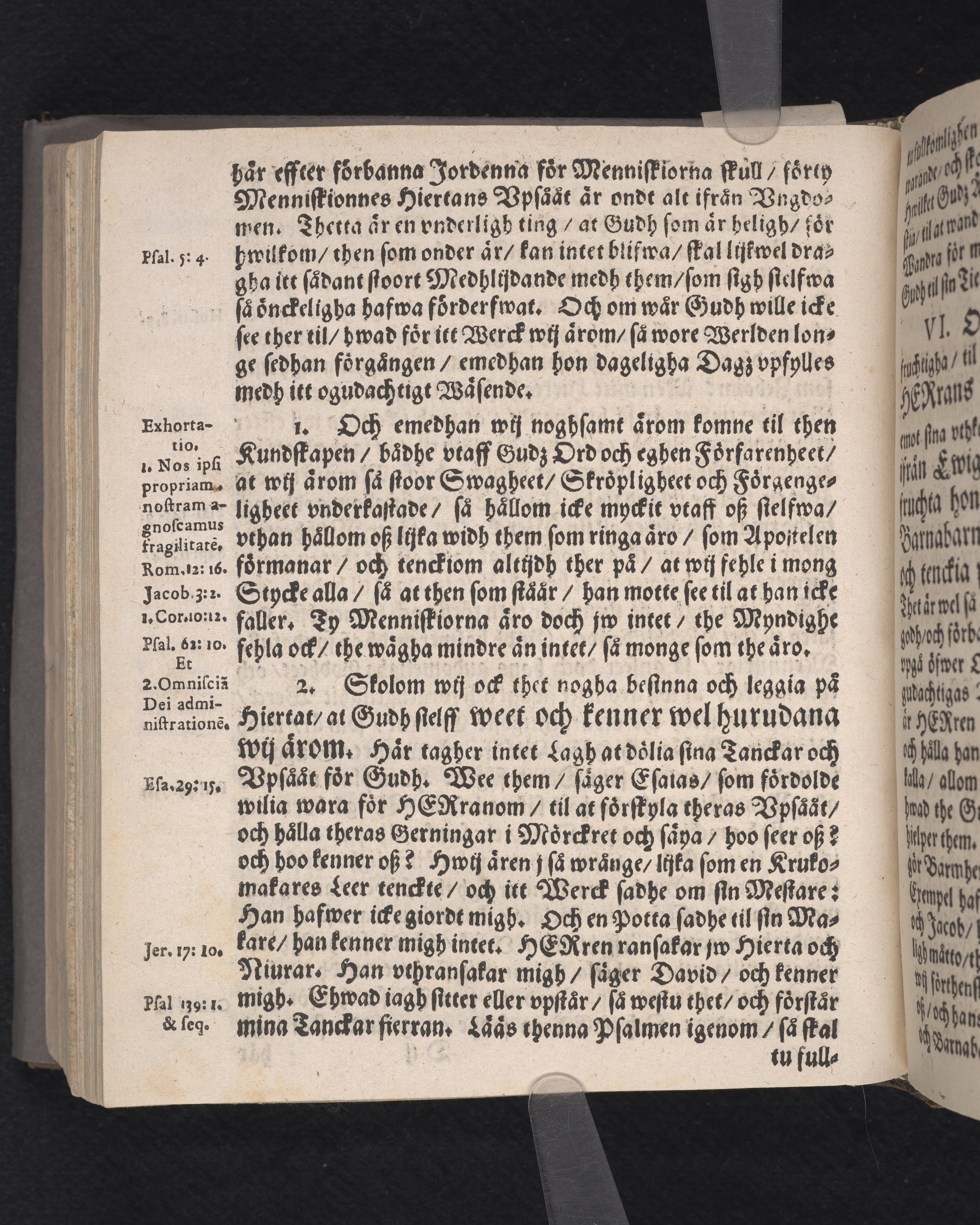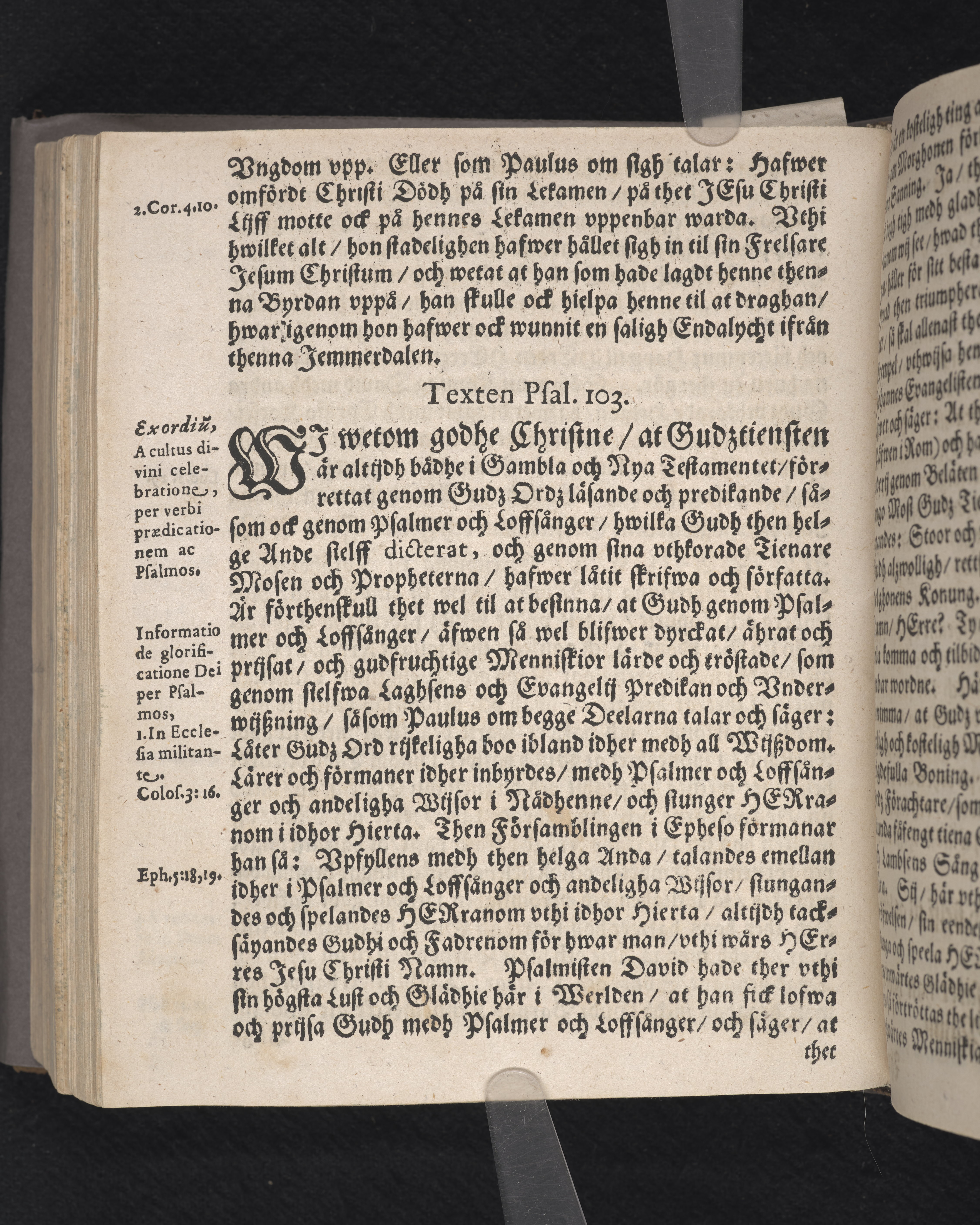 Svärtat helskinnsband av får, fast rygg. Stickade kapitäl. Snitten skurna, stänkfärgade i blått.