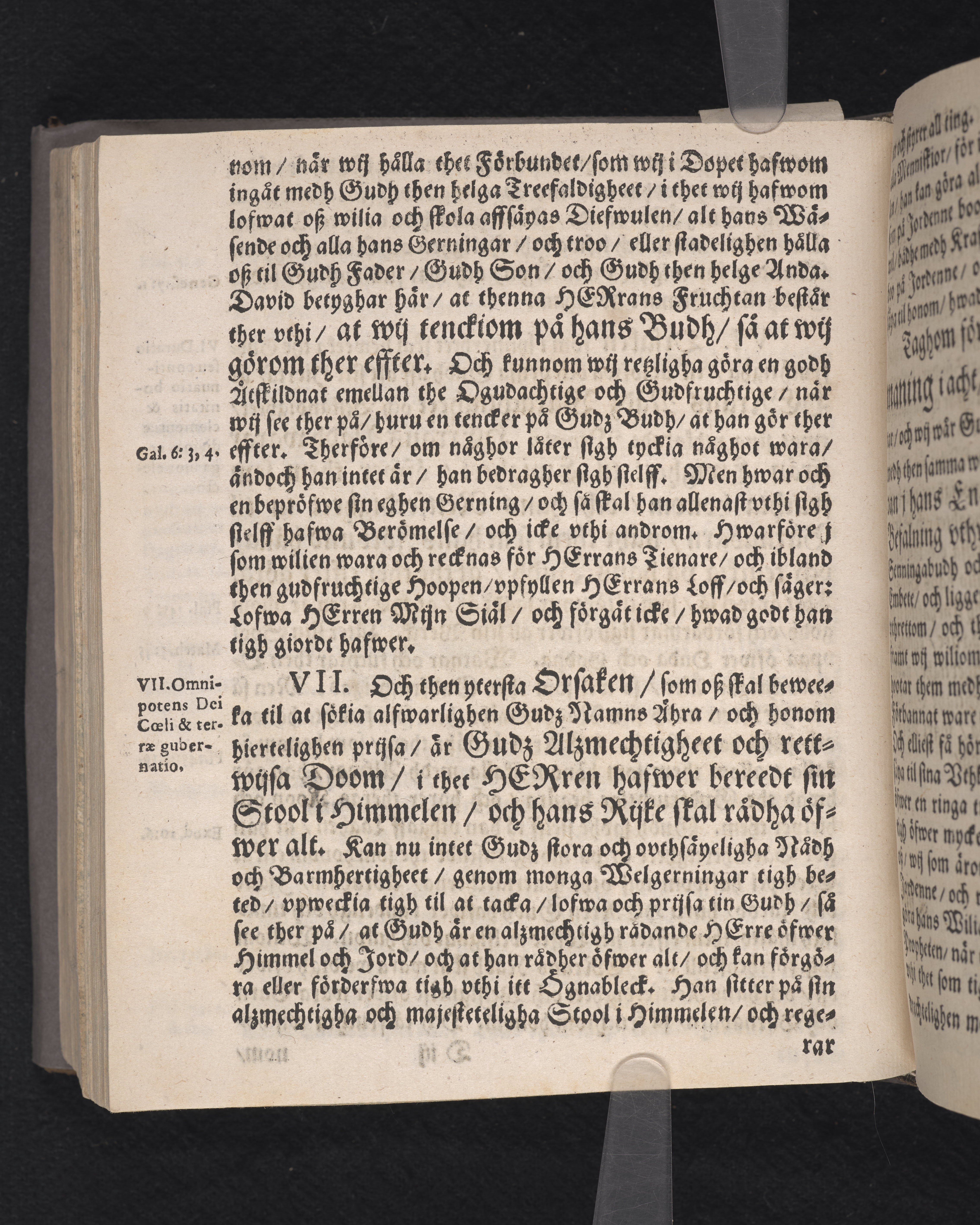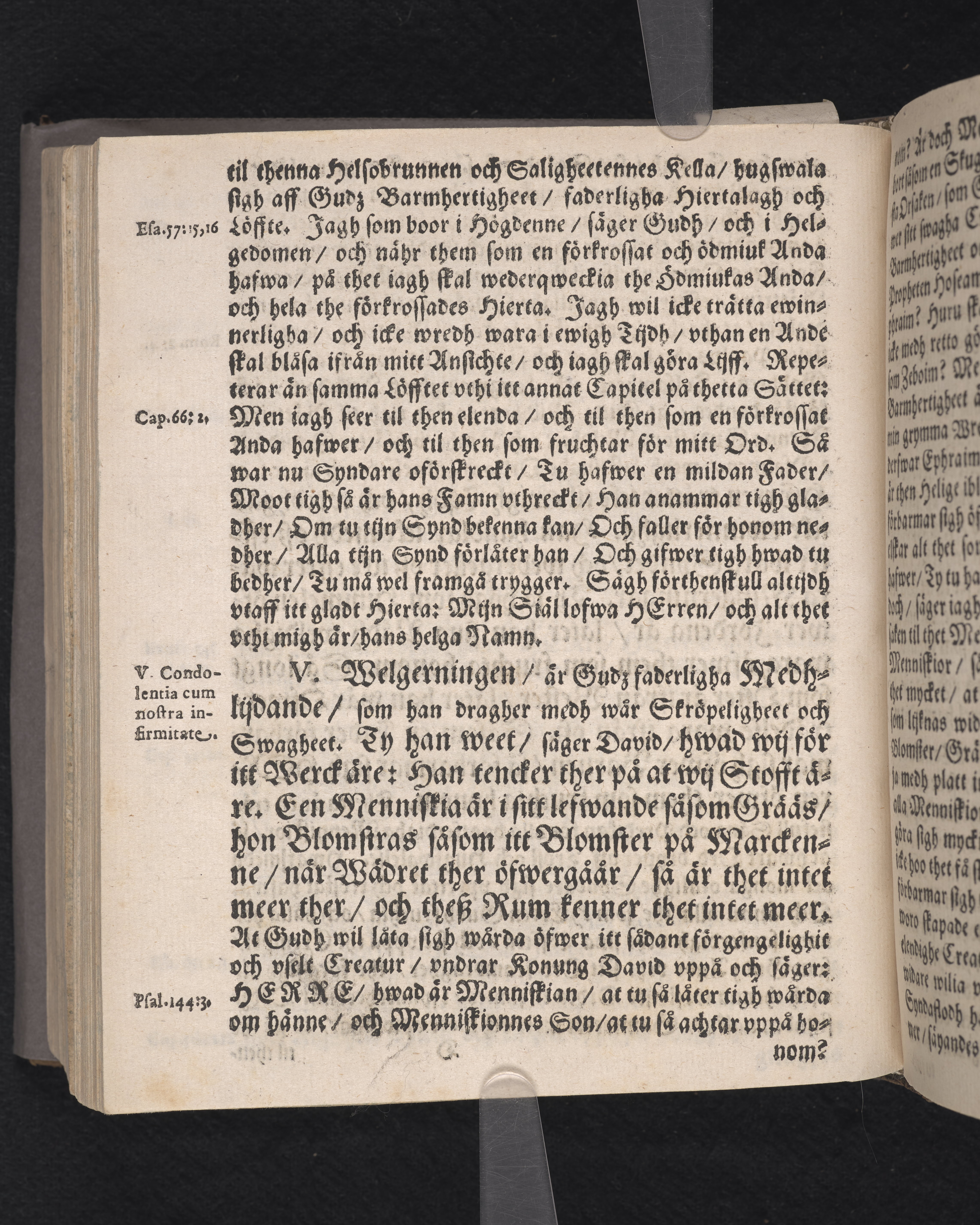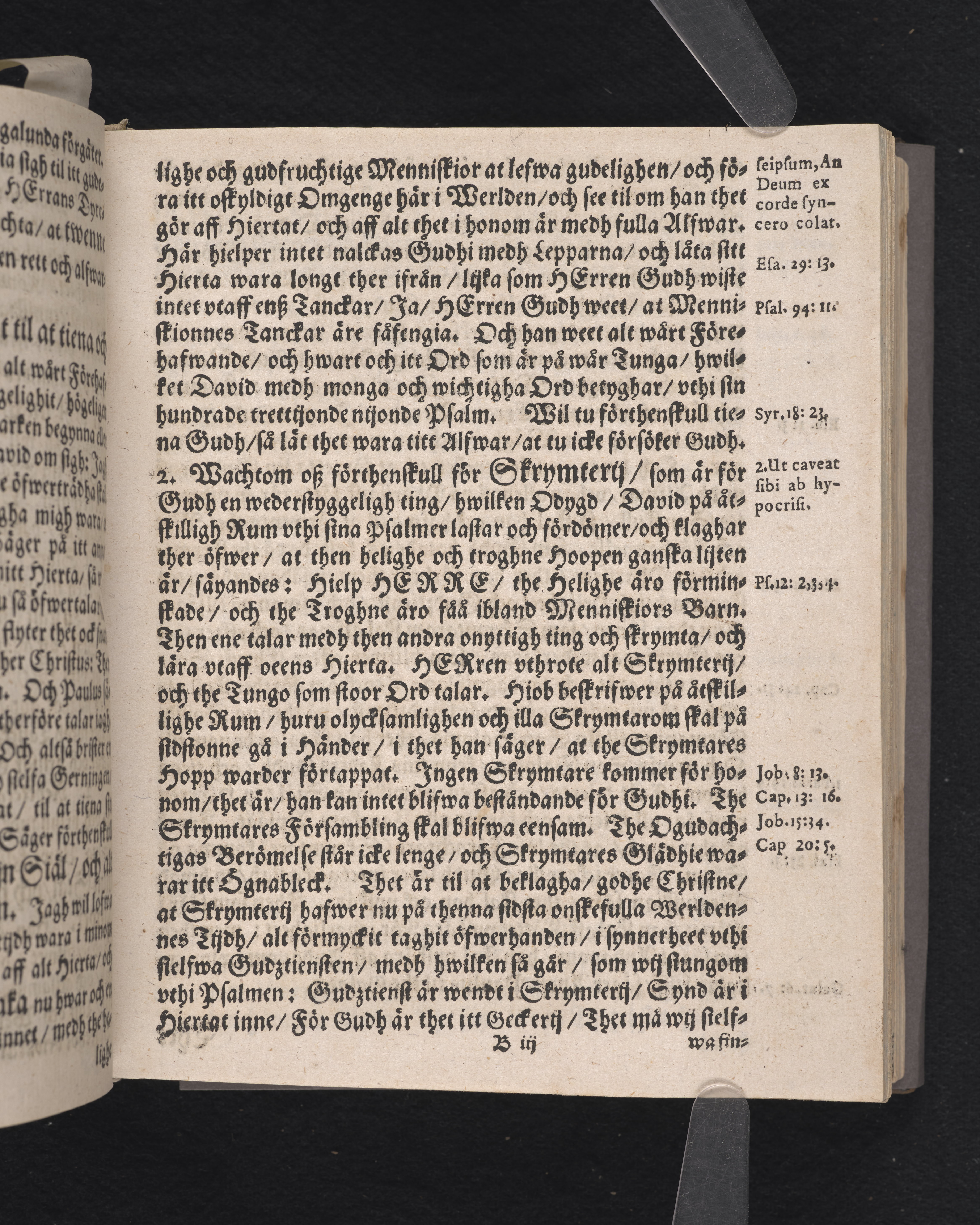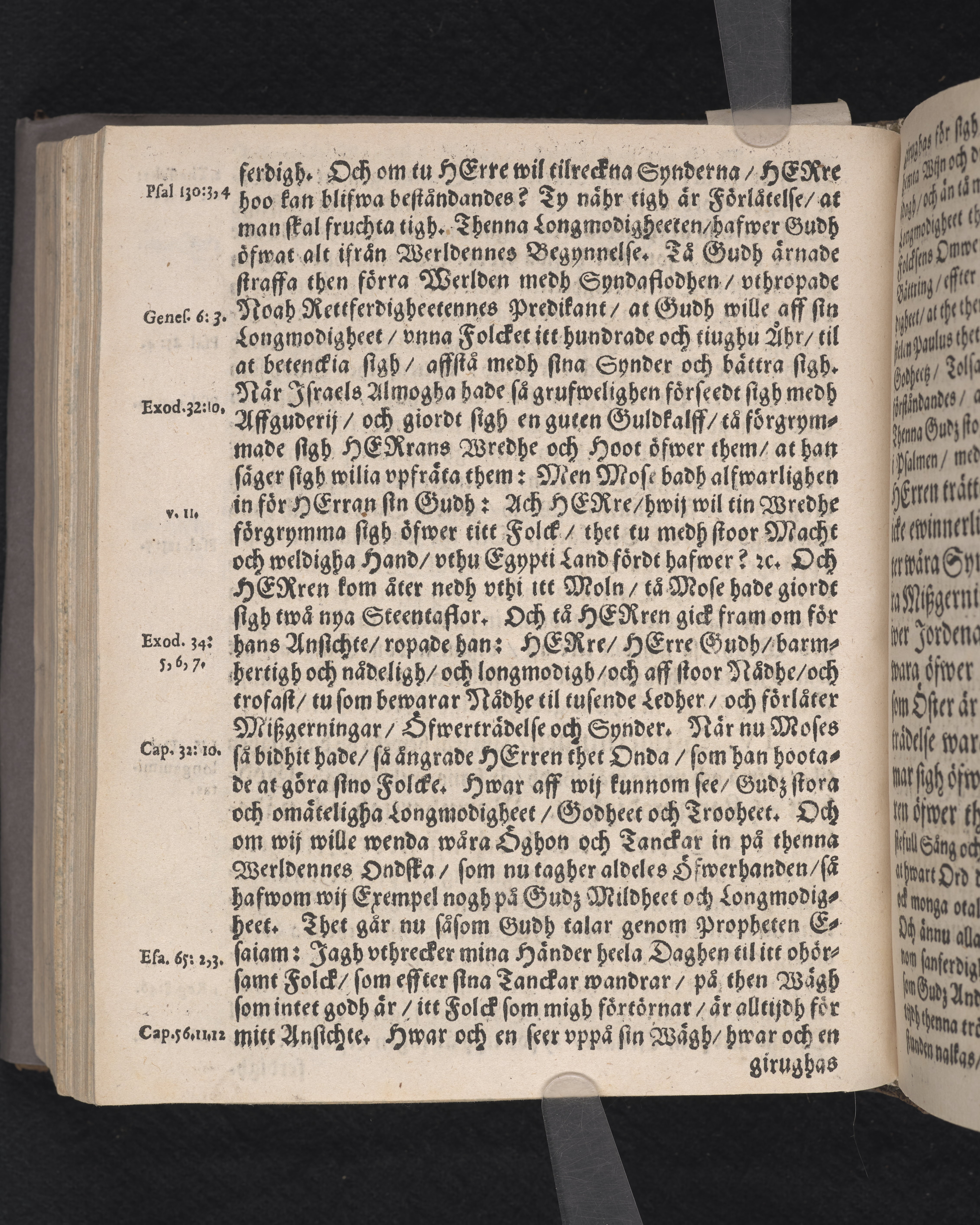 Svärtat helskinnsband av får, fast rygg. Stickade kapitäl. Snitten skurna, stänkfärgade i blått.