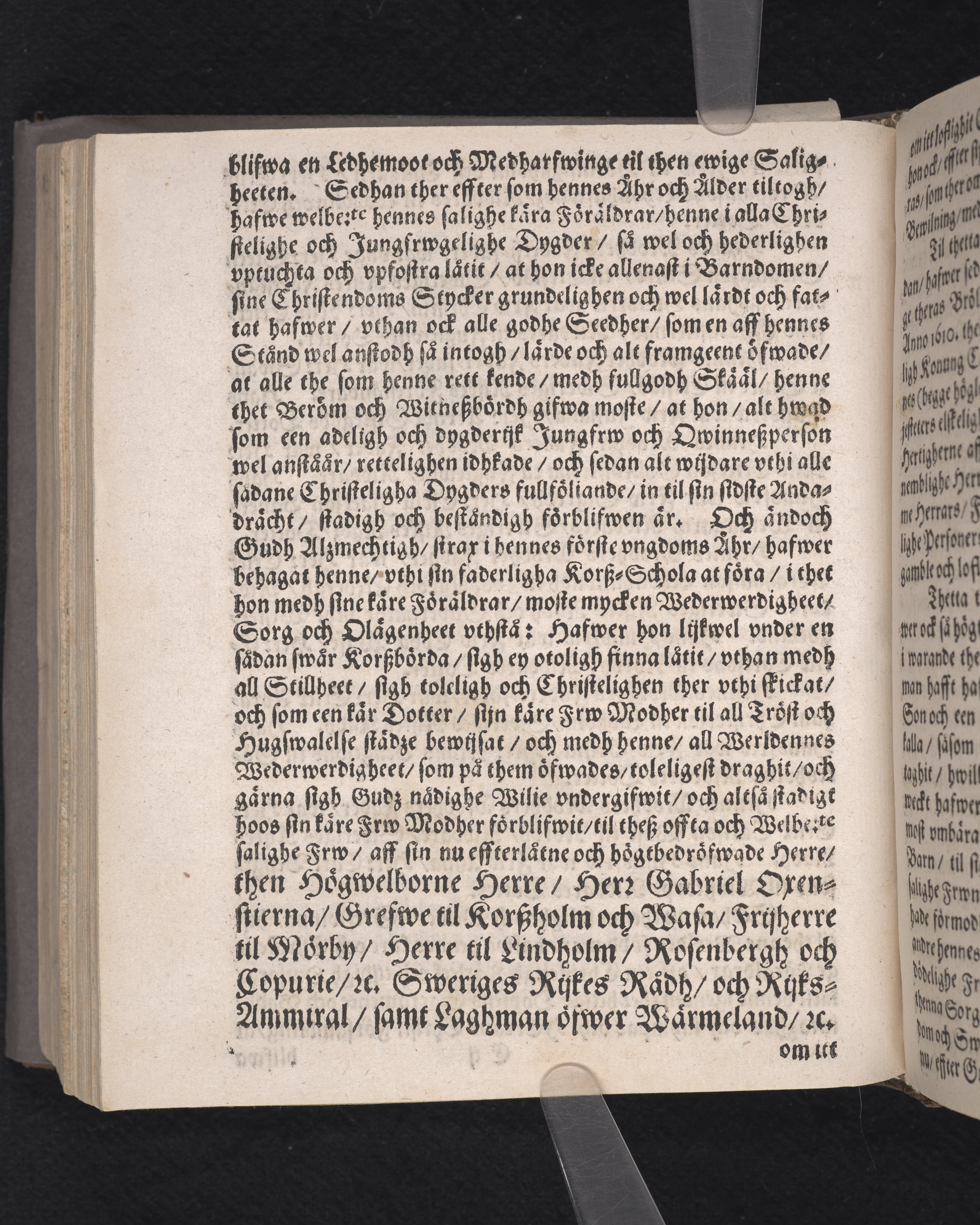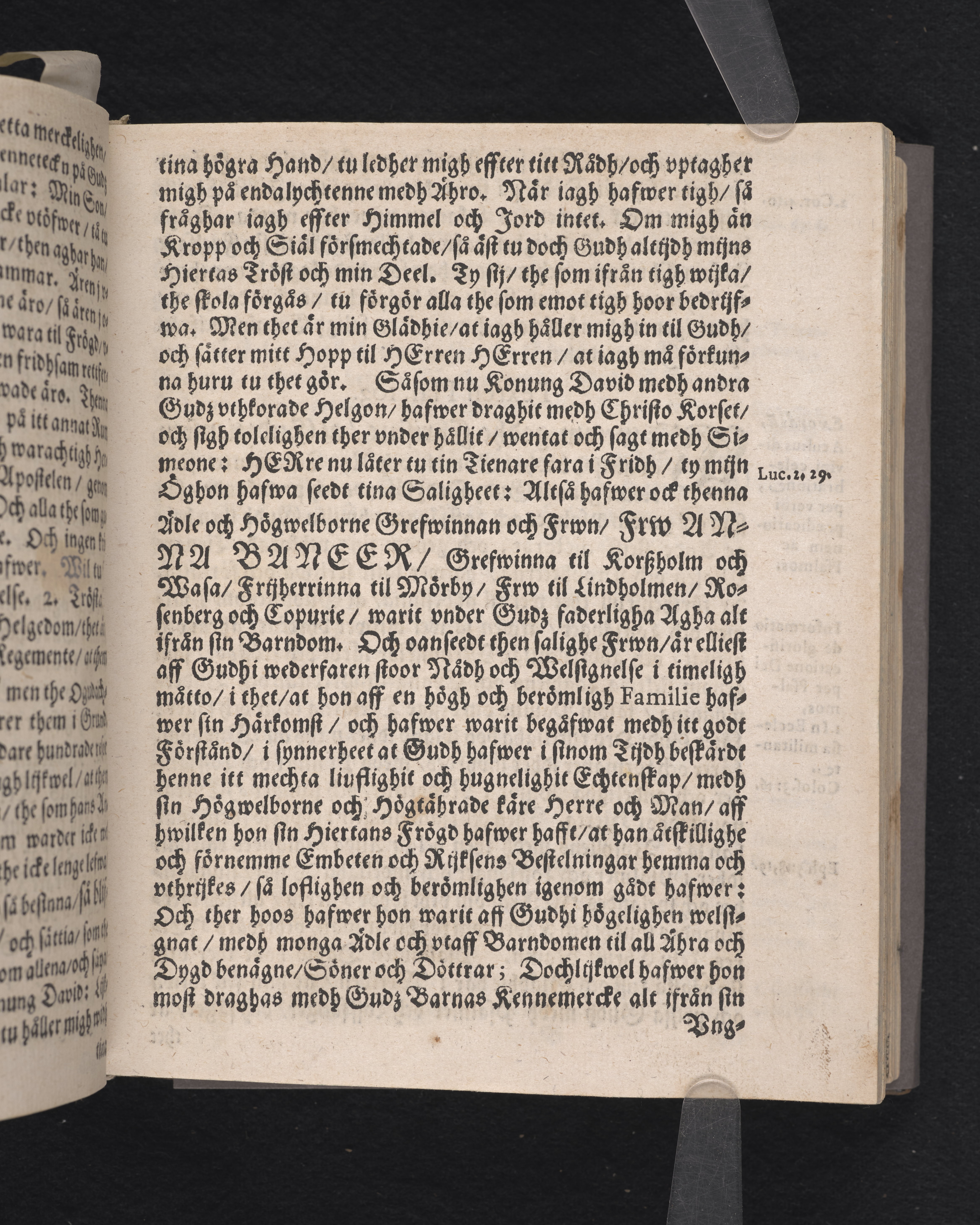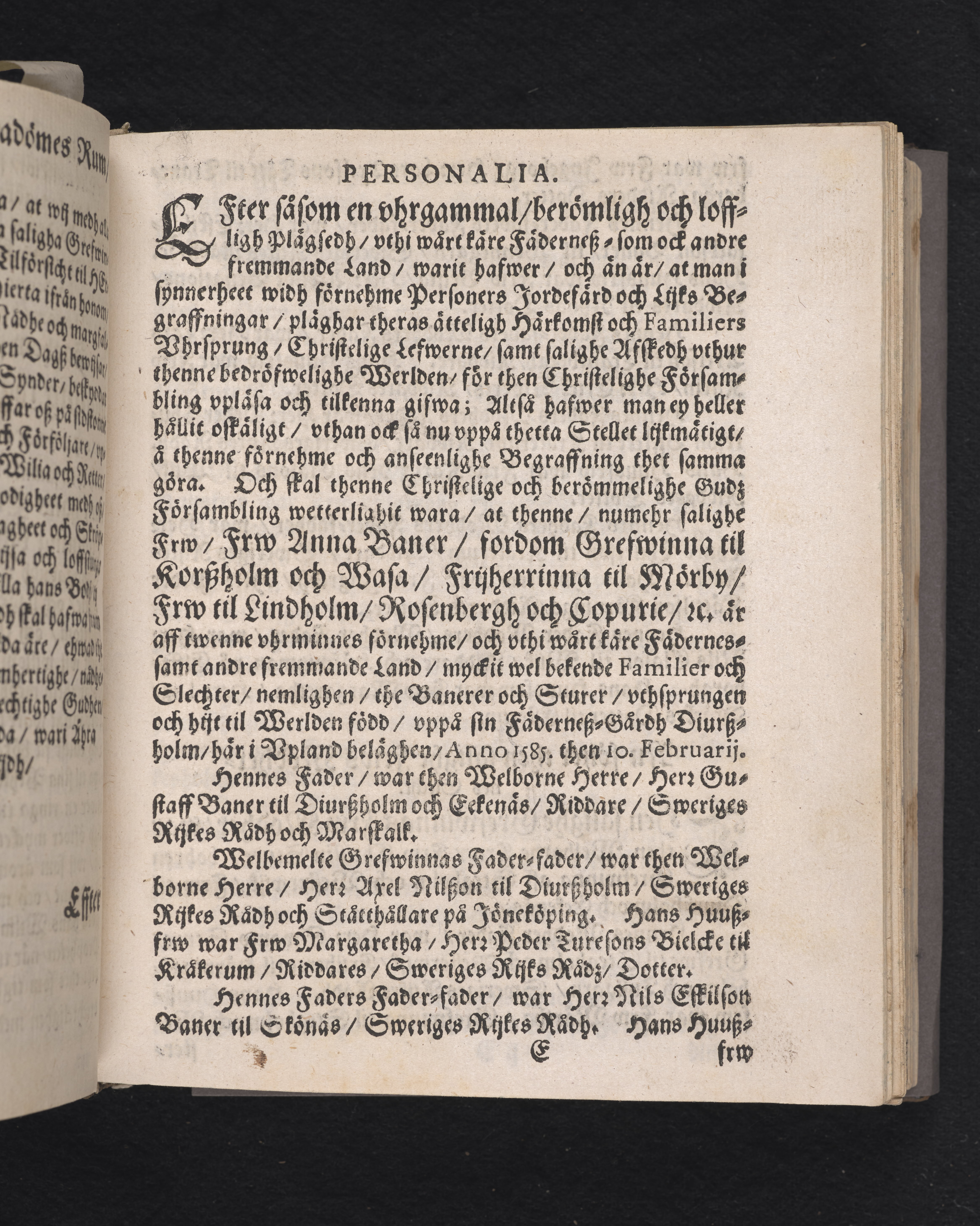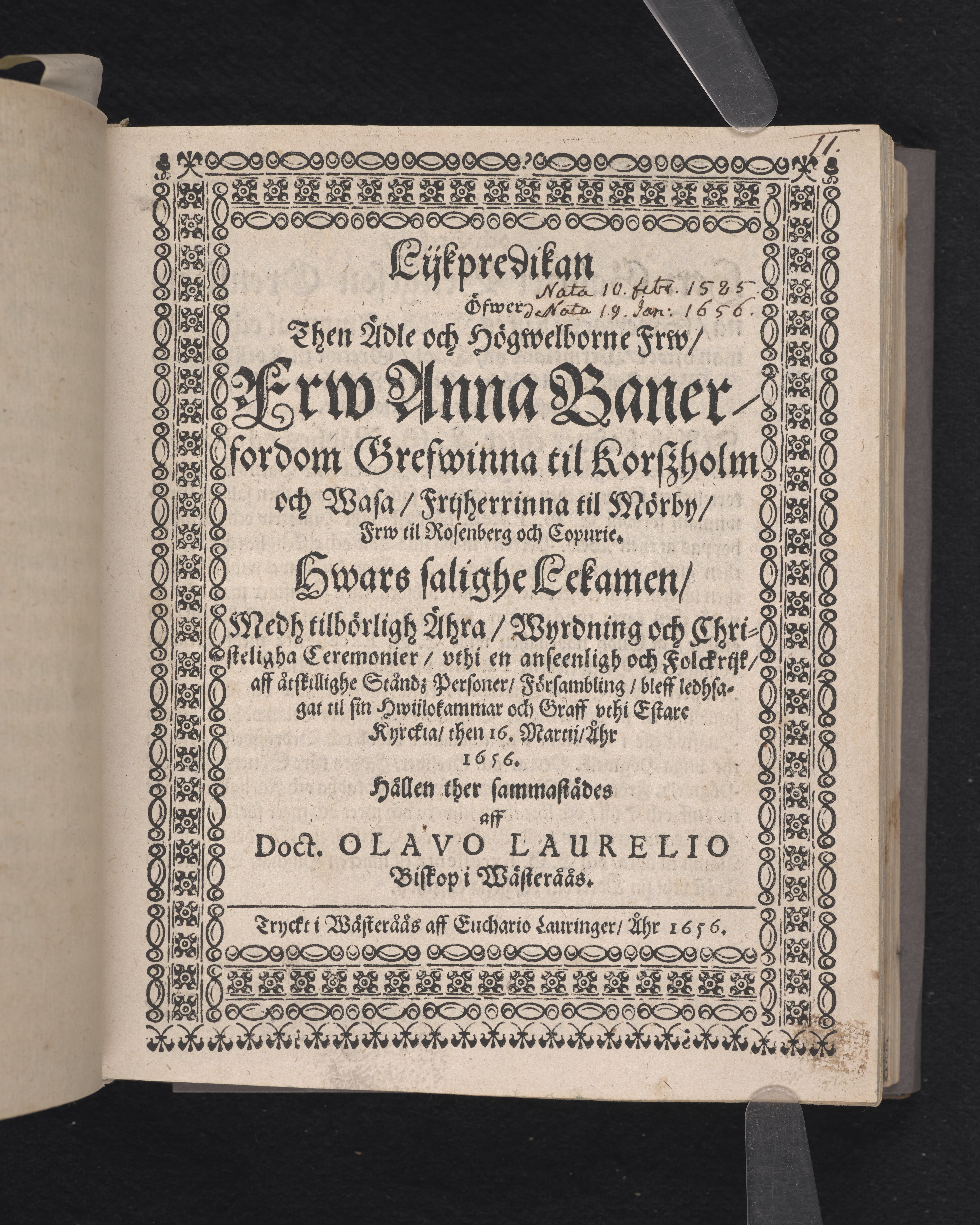 Uthfärdz predikan öfwer then ädle och högwelborne frw, Frw Anna Baner, fordom grefwinna til Korszholm och Wasa ... hwars salige lekamen ... bleff ledhsagat til sin hwijlokammar och graff vthi Estare kyrkia then 16. martij, åhr 1656. Hållen ther sammastädes aff Doct. Olavo Laurelio biskop i Wästeråås. Tryckt i Wästeråås aff Euchario Lauringer, åhr 1656.