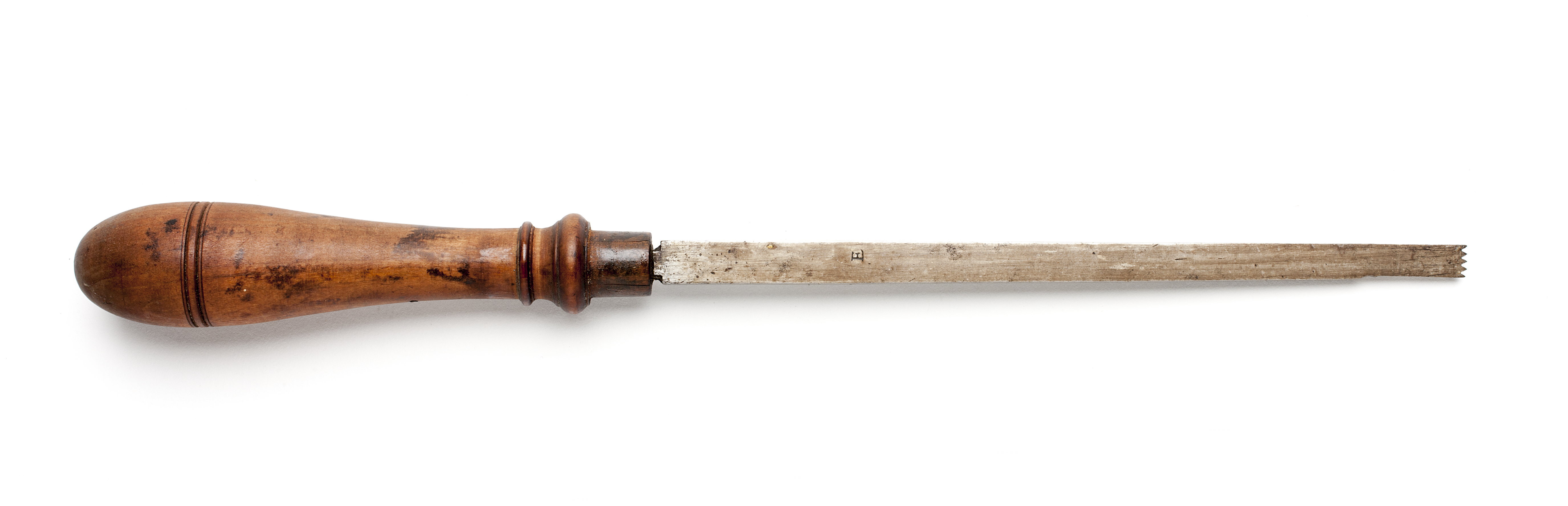 Klinga med rektangulär genomskärning. Femtandad egg. Stämplat på klingan: "E" med stans nr 3842 Svarvat skaft av päronträ, med två vulster nedtill.