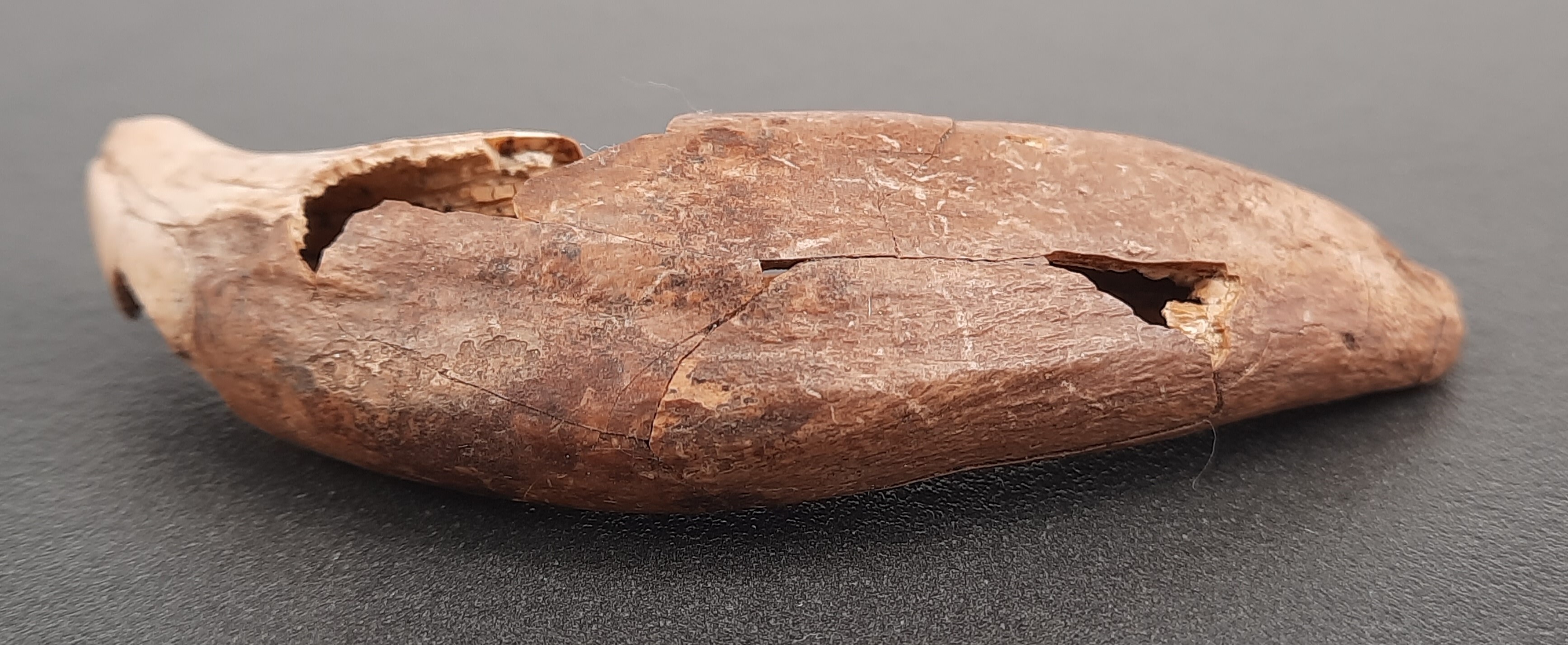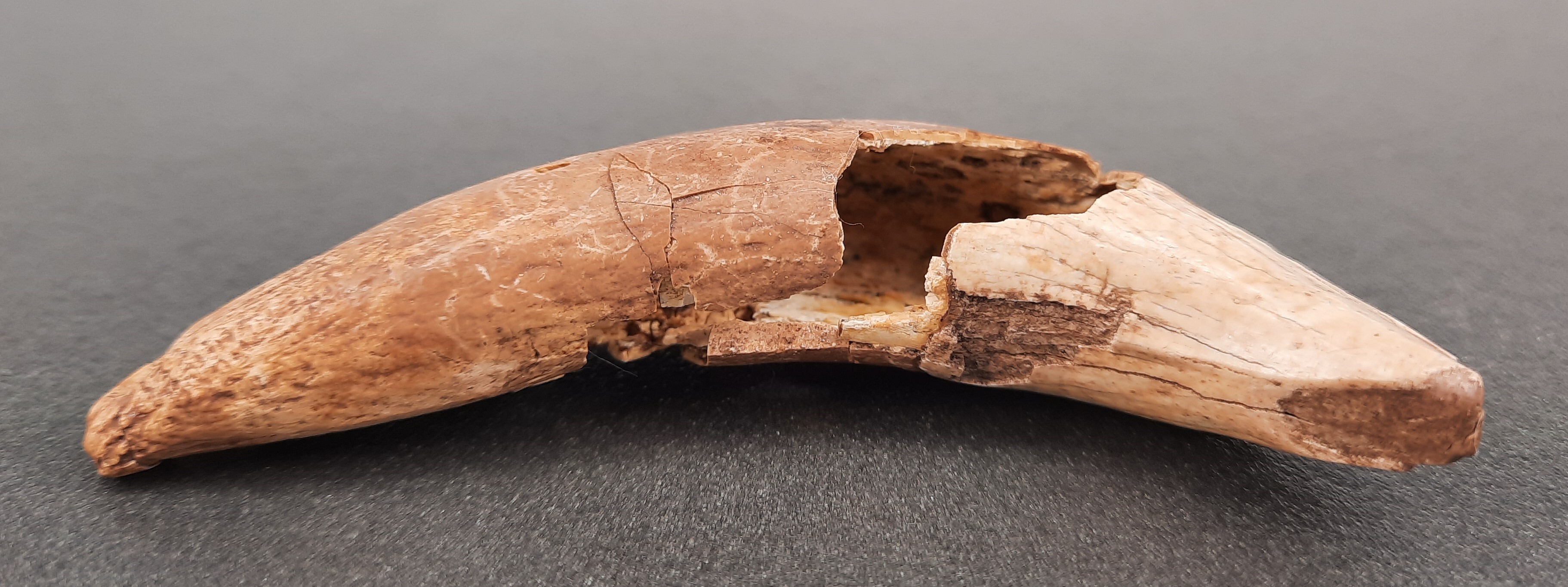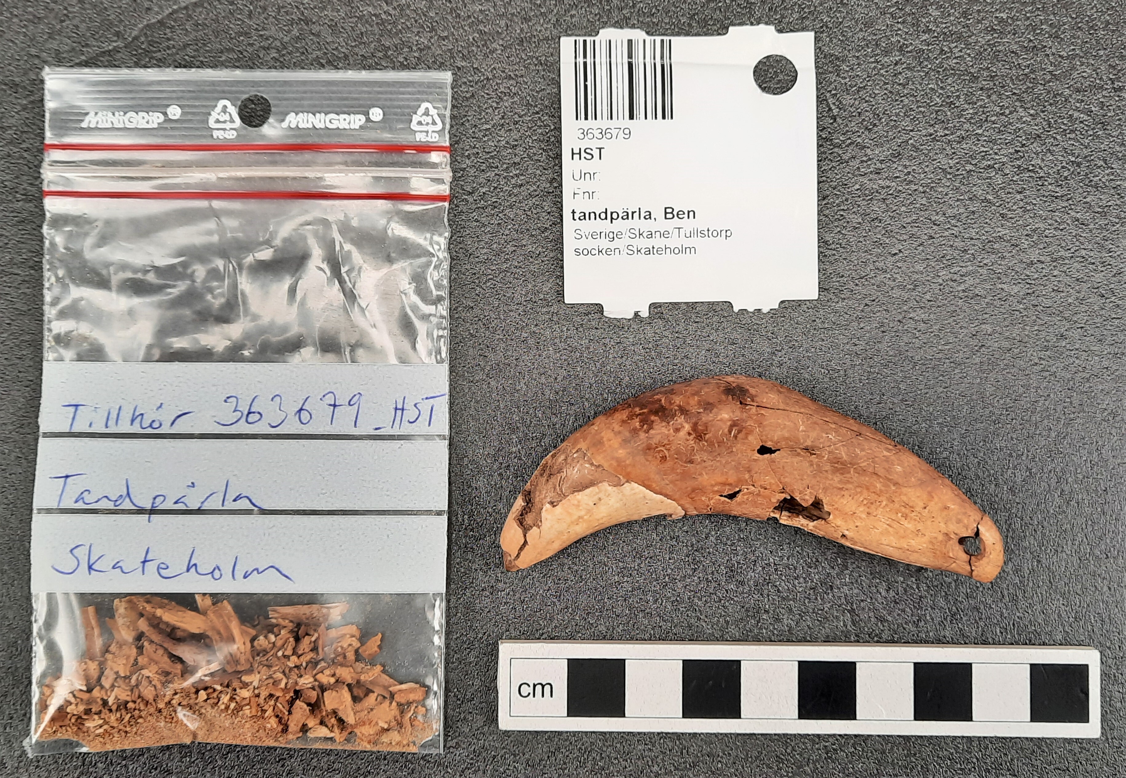 En av två tandpärlor, björntand. Tanden har spruckit i samband med analys 2020 och är ihoplimmad.