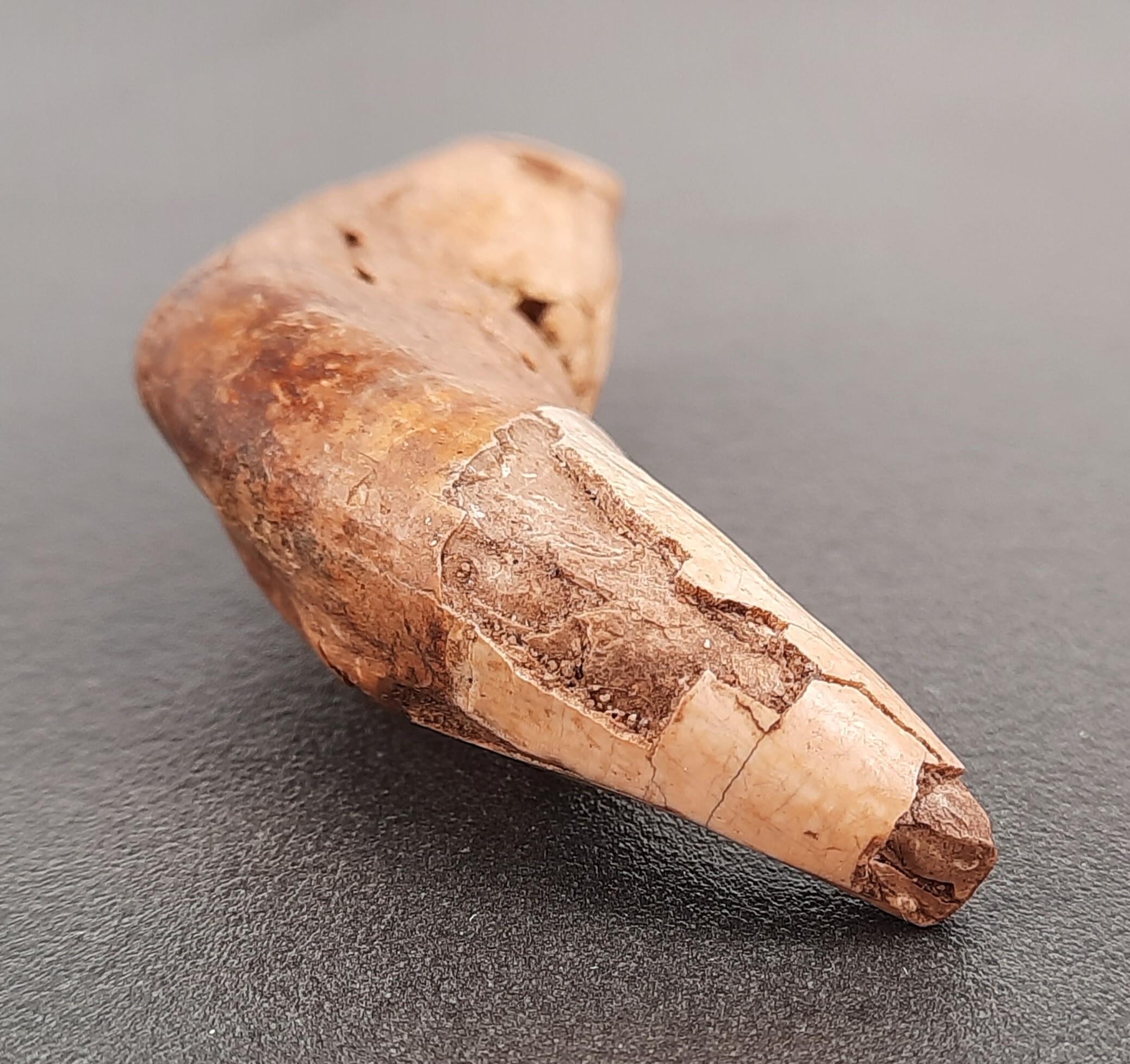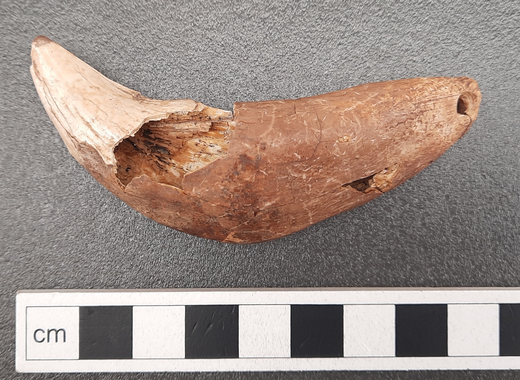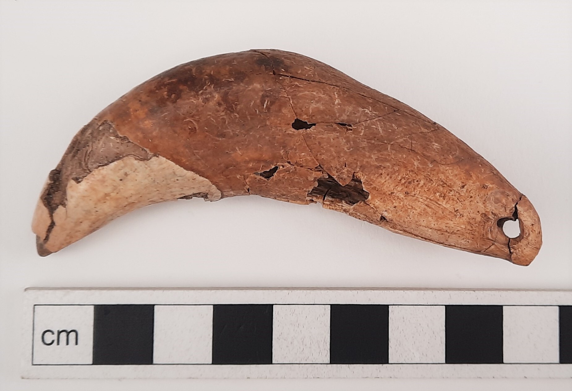 En av två tandpärlor, björntand. Tanden har spruckit i samband med analys 2020 och är ihoplimmad.