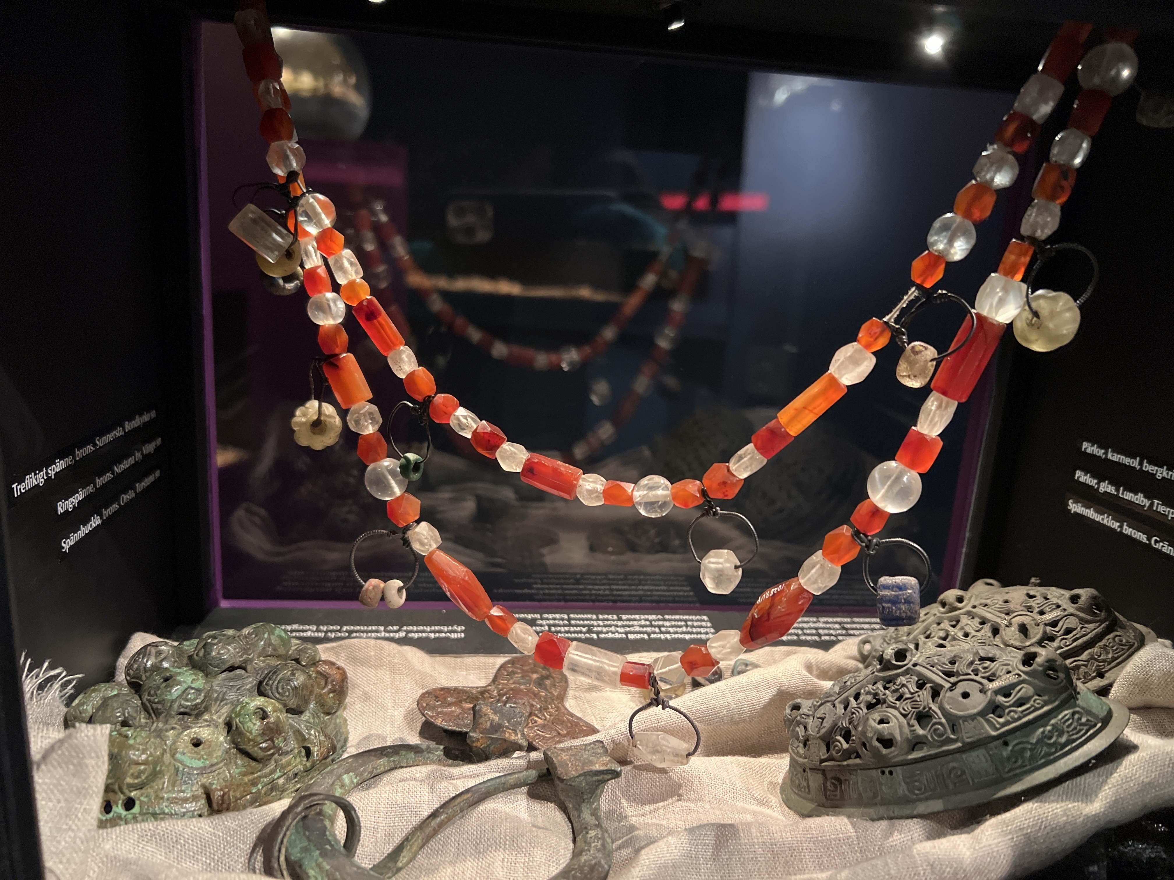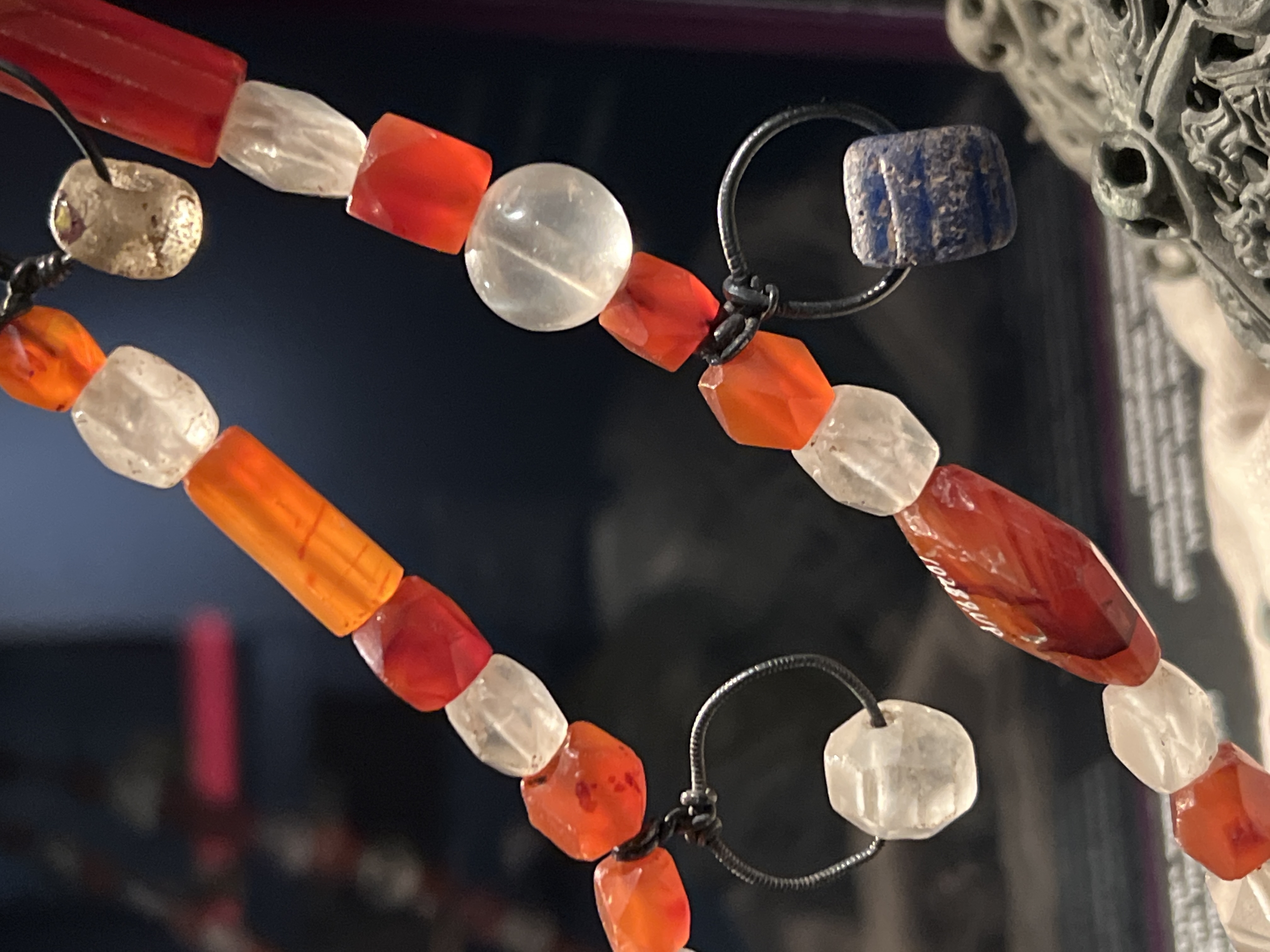 93 pärlor uppträdda på tråd och på 12 rundade hängen av metall som är fästade vid pärlraden, med en till två pärlor per styck, företrädesvis glaspärlor. Även en lös karneolspärla.