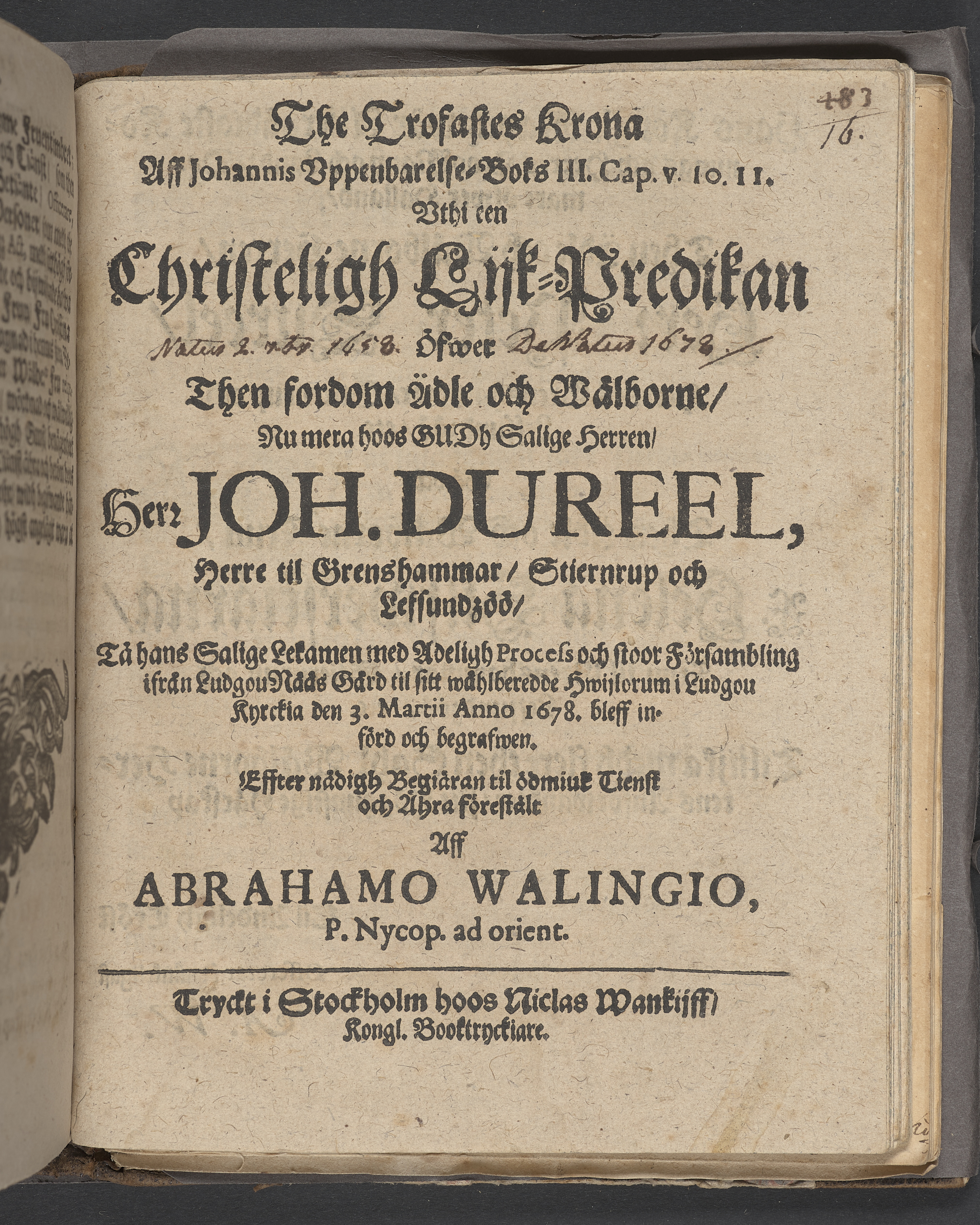 Fromma qwinnors andeliga pärle-skrud, eller förnämsta prydnad, förestäld wed grafwen, uti en liten, kort och enfaldig lijk-sermon, i anledning af Proverb. 31. v. 30.31. Då den högedle och wälborne fruen, nu mehra hoos Gud salig, fru Sara Catharina Linroth, för detta assessorens uti den höglofl. kongl. Giötha hof-rätsz ... Nils Stedtz högt-älskelige käre maka och husfru, med en högtförnähm och mycket anseenlig lijk-process blef uti Jönkiöpings stadz- kyrckia den 12 februarii åhr 1718 begrafwen af Theodoro Junbeck. Jönkiöping, tryckt af Israel Falck.