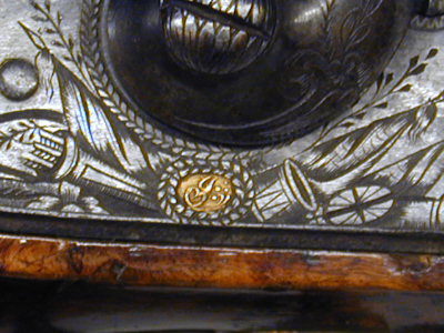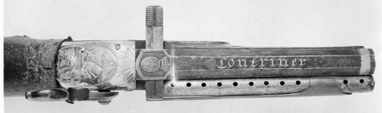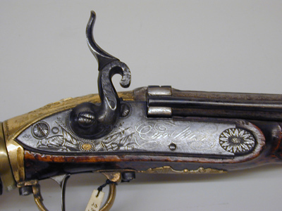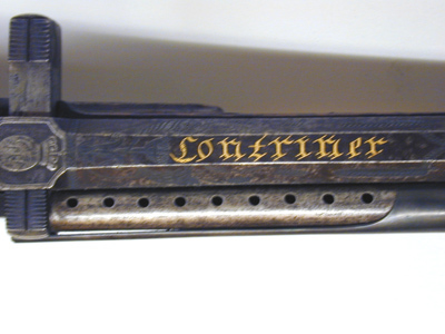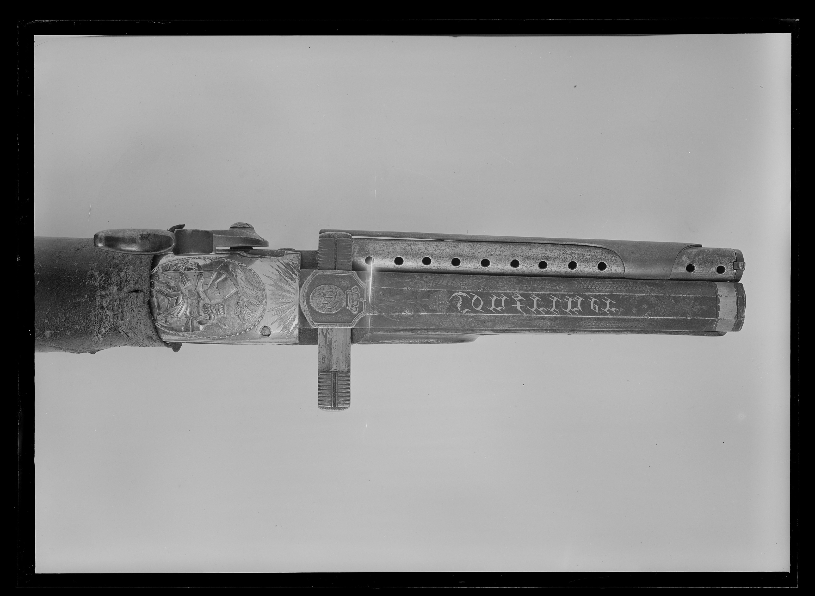 Åttsidig, blånerad pipa, vid mynningen på de tre övre faserna ett påslaget guldband, b: 8 mm, på översidan därbakom signatur inlagd med guld: "Contriner" omgivet av en graverad ram med två ymnighetshorn med blommor, sädesax mm. Pipan baktill utvidgad till ett magasinshus med en åttkantig platta på ovansidan, därpå mot försänkt botten en oval krönt av en kunglig krona, graverat namnchiffer: G F S. Igenom magasinshuset löper en fjäderbelastad kulförare i form av en stav med närmast kvadratiskt tvärsnitt, b: 15 mm, på vardera änden en kvadratisk, blånerad platta med filad greppräffling i längsriktningen, avbruten av en tvärgående, skålad list på mitten. På h sida av pipan ett runt kulmagasin l: 160 mm, på utsidan omfattad av den blånerade bladfjädern till kulföraren. På rörets ovansida 11 synliga, runda hål. Framtill sitter ett vridbart, blånerat, åttkantigt lock med en liten greppkula. Låshus av mässing med på ovansidan en figurscen i relief, oval med finpunsad botten, en sittande naken, skäggig man med mantel över knäet, antik spetskrona på huvudet, huvudet stött mot h hand, armbågen stödd mot klippa. V arm griper om greppet till sköld(?) sammansatt av tre lodräta bräder och med en synlig tvärslå. I armbågsvecket till v ett ok- eller spirliknande föremål. Till h om skölden två huvuden, varav det främre förefaller blåsa mot kungen - tre luftstrålar. I bakgrunden klippa och träd. Mellan ovalen och pipan graverade solstrålar. På låshusets insida under locket en enbart grovbearbetad luftkanal fram till pipan. Plant låsbleck av blånerat stål, svagt fasade kanter nertill och baktill. Graverad dekor, nedanför hanen en trofégrupp av fanor, kanonrör, trumma, pilkoger och trumpeter, i mitten ett ovalt fält omgivet av en bladkrans, däri en guldstämpel J (Stöckelnr 203). Framför trofégruppen inlagt med silver, skrivstil med snirklar: "in Wien", på framänden ett ovalt fält med en mångbladig blomma. S-formigt svängd hane ned långt, svagt böjt, uppåtriktat fingergrepp, på hals och huvud en plan yta med bladdekor. Kraftig slagfjäder. På nötens insida en stålplatta, som går in i låshuset och bakåt påverkar en ventilstång, vars framände är uppträdd på den främre varbygelskruven som är inskruvad i låshusets under luftkanalen. I bakre änden ett stift som går in till ventilen i luftbehållaren. Fästning: Två låsskruvar med graverade huvuden. Svagt böjd avtryckare av stål. Sidbleck av blånerat stål, samma form med enklare dekor, samma blomma framtill, vid överkanten runt fästskruvens hål solstrålar. Fästning: En skruv. På låshuset baktill skruvat en bakåt breddad luftflaska av stål med rund ände, större delen klädd med numera slitet brunt läder. Läderpackning. Framstock av valnöt fläckad med talrika, mörka oregelbundet runda och fyrkantiga fläckar. Snidad dekor av blad framtill. Framstocken fäst framtill med vingskruv med ovalt huvud. Varbygel av mässing med bygel och konturerad främre arm, på bygeln graverat en symmetrisk blomma, på armen urna och blad med ananasliknande spetsplatta, två fästskruvar med cylindriska, graverade huvuden.