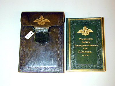 a) Kalender tryckt på ryska och med svensk översättning med gulnat bläcköver deltagande trupper och kommenderande officerare. Bunden i grönt skinnmed kantlinjer i guldtryck, samt pressad bladbård, på framsidan i guldtryckdet ryska riksvapnet och rysk text: ROSPISANIE // VOJSK // SOSREDOTOCENIICH// PRI // G.KALITE. b) Färgad karta vikt i åtta delar och klistrad på gråbrun väv med grönkantförstärkning, i övre vänstra hörnet rysk text: KARTA // RASPOLOZENIJA// VOJSK // pri // G.KALITE, därnedanför tecken förklaringar. c) Fodral av papp vikt i två lika långa stycken, l: ca 105 mm samt en litenflik. Utvändigt klätt med grönt skinn, invändigt med grått papper.