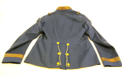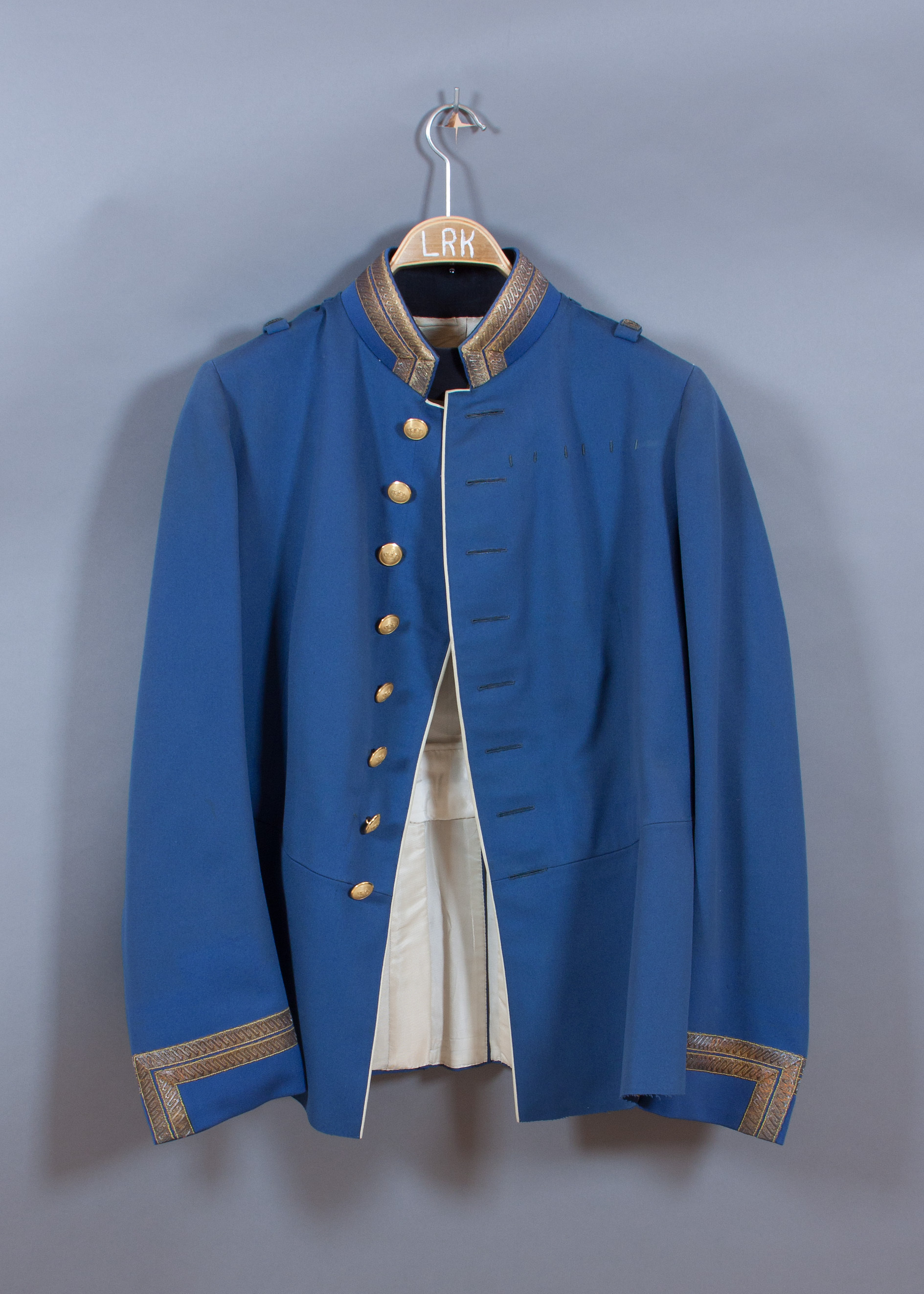 Vapenrock är sydd av ljusblått ylletyg och tillskuren med livsöm. På framstycket är en enradig knäppning samt en ståndkrage som är 55 mm hög. Knäppning med åtta knappar, d: 23 mm av förgylld mässing med reliefdekor i form av en krona, på baksidan firmamärke: "C.C. SPORRONG & CO STOCKHOLM". På v. framstycket 6 små tränsar för bröstdekorationer. Ståndkragen är dekorerad med guldbroderier för generalitetet. På axlarna är en träns med guldbroderier av förgyllt kantiljtråd samt sex rader med paljetter. Sprund bak med vardera tre knappar med en krona i relief. Rocken är framtill och sprunden baktill dekorerad med vit passpoal. Foder är av vitt silke vävt i kypert och ärmarna av vitt siden. En innerficka med måtten 190 mm bred samt 195 mm djup på vänster sida.