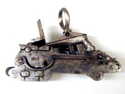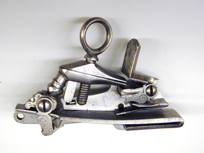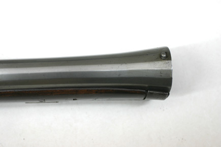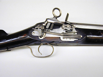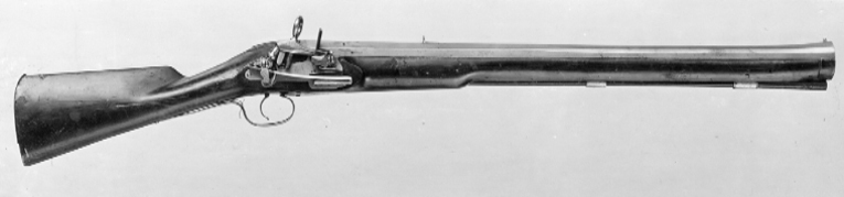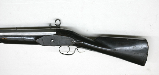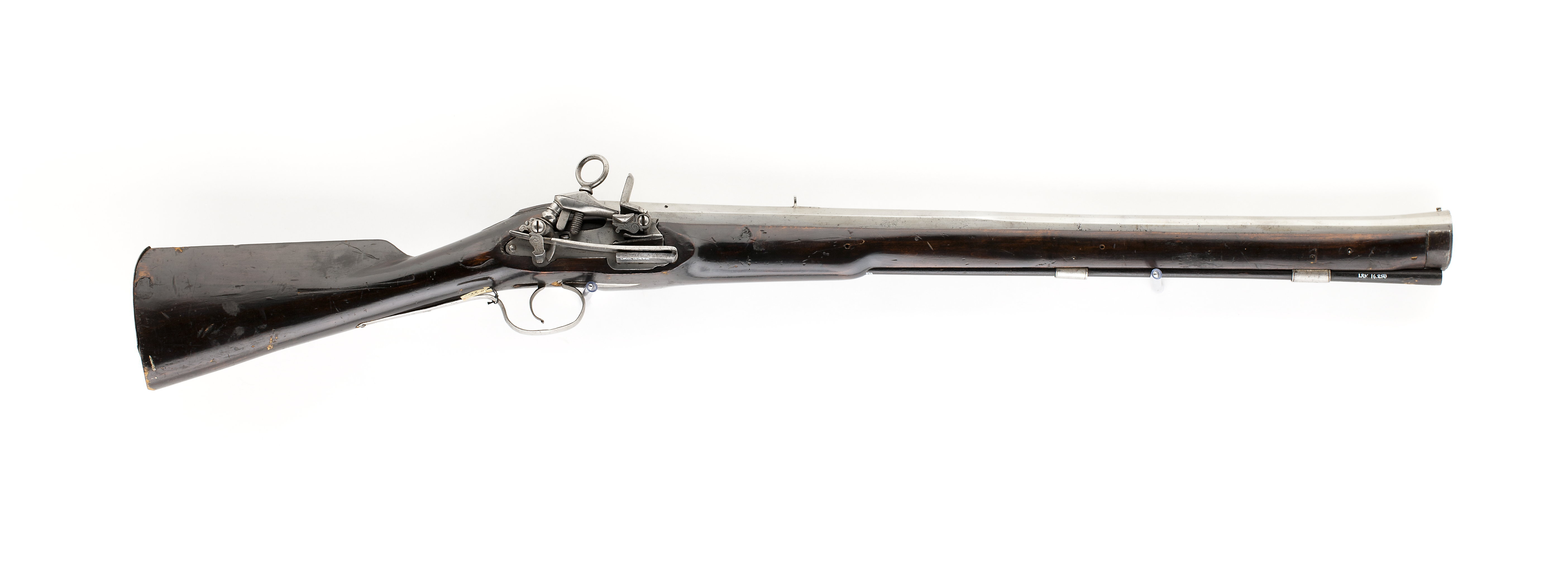 Åttsidig pipa av stål, framåt vidgad till trombonmynning med runt tvärsnitt. På kammarens h sida en otydlig stämpel(?). Kanterna fr. o. m. mitten fasade, fasningen breddad framåt så att mynningen är "sextonsidig". Undersidan rundad och enbart grovbearbetad. Svansskruv med en ca 7 mm tjock skiva av pipans form. Rektangulärt, böjt svansskruvblad. Riktmedel: Inlaxat högt ståndsikte, knoppkorn, båda av stål. Fästning: Tre häften. Pipan fäst med krysskruv underifrån (huvudet delvis dolt av varbygeln) samt ett pipstift av stål. Snapplås alla katalana med plant låsbleck, utvändig, kraftig slagfjäder. Hane med kort balusterformig kropp, kulan nertill fasetterad, långa käkar, underkäken rundad på undersidan, överkäken lös, fasade kanter. Käkskruv med ringformigt huvud. Hanstudel med enkelt ristad rankdekor. Fängpanna med V-formig gavel, skiva med rankdekor. Batteri med närmast kvadratiskt eldstål med svagt svängd överkant, räfflad slagyta, liten batterifjäder. På låsbleckets insida enbart avtryckarstången, U-formigt nedsvängd vid främre låsskruvens hål. Fästning: Två låsskruvar. C-formig avtryckare. Helstock av närmast svartbetsat trä, kolv med ovalt tvärsnitt, plan kolvrygg, enkelt skuret blad bakom lås, svansskruvblad och "sidbleck". Kolvkappa av koppar, enbart täckande övre 75 % av kolvänden, tre fästspikar. Två bandformiga rörkor av stål. Enkelt näsband av mörkanlupet stål. Varbygel med kort, spetsig främre arm, lång bakre arm, två fästskruvar. Tillbehör: Laddstock av trä, l: 695 mm.