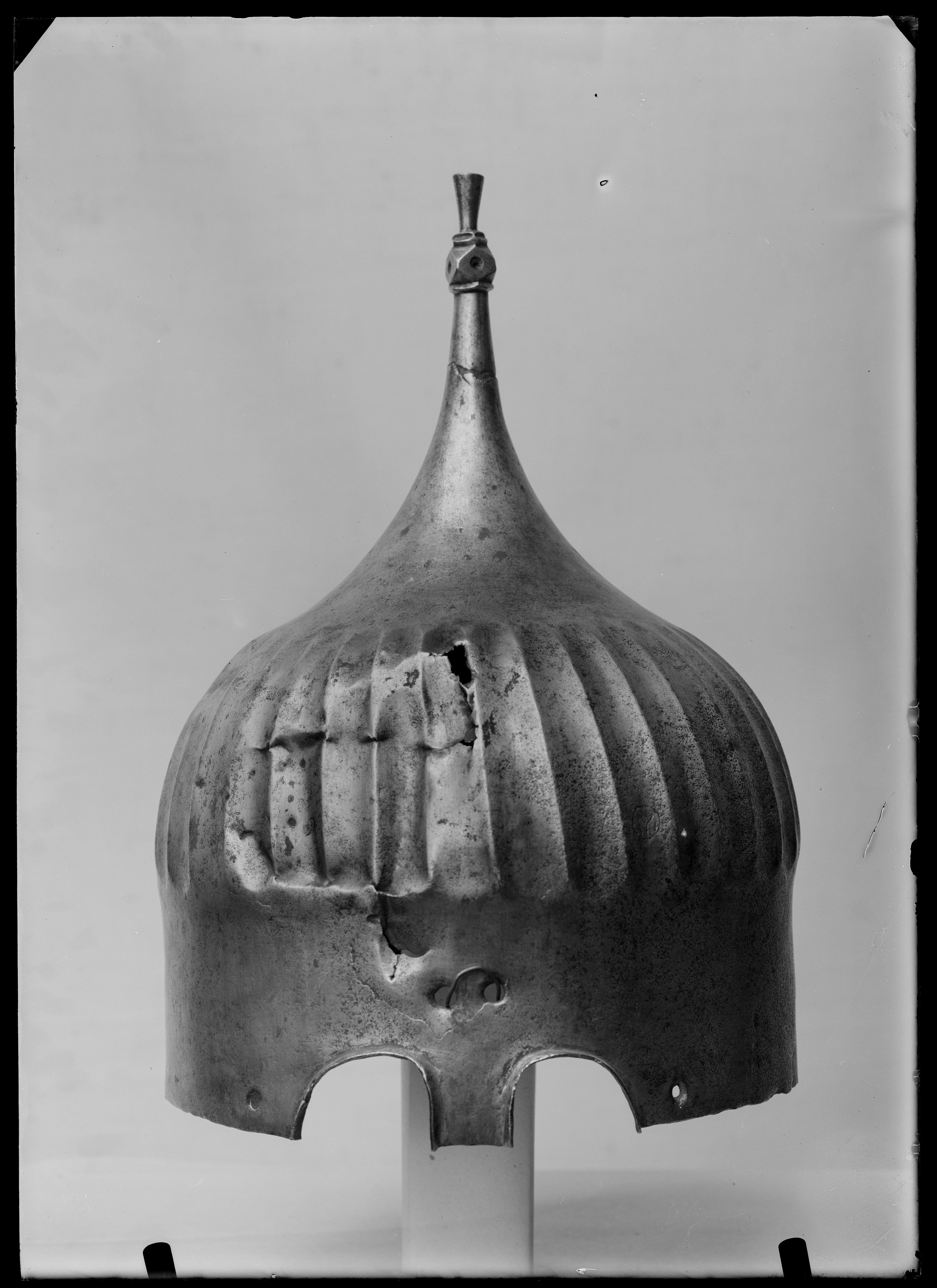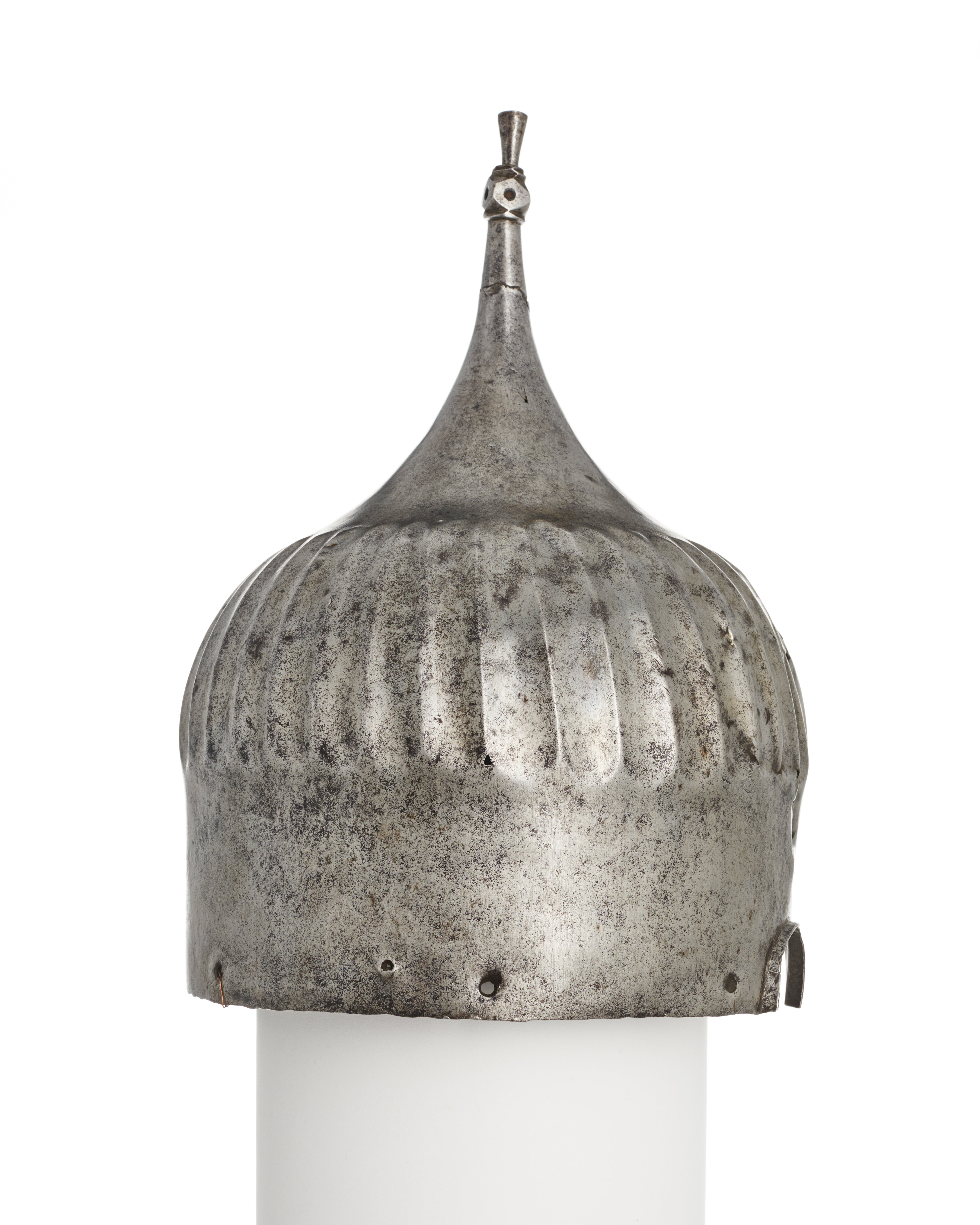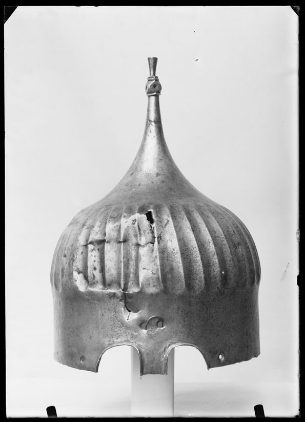 Hjälm med hög, cylindrisk klocka, något utkragad vid det räfflade mittpartiet, avsmalnande till en hög spets, avslutad med en fyrsidig, fasetterad kula, h: 20 mm, b: 15,5 mm och en omvänt konisk spets, h: 21 mm, d upptill 11,6 mm. Framtill vidnederkanten två ögonbågar, h: 30 mm, b: 45 mm med utkragade kanter. Dekor i form av räfflat, drivet fält, h: ca 100 mm, räfflorna skålade och något snedställda åt v. och slutar ca 80 mm från nederkanten. I fjärde räfflan till höger om mitten fram det s. k. turkiska arsenalsmärket, en cirkel med stiliserad hästsvans. Ur den Keller-Sachovskoj-samlingen såld hos Bukowski 1920-03-05, katalog 225 nr 32. Gåva till LRK av direktör I. G. Hellberg enligt gåvobrev 1921-12-20. Enligt uppgift ur det ryska krigsbytet från Erzerum 1829. Ägare: furst Alexej Ivanovitj Sachovskoj (1812-1894), därefter mågen, greve Theodor Keller (1894-1904) och hans son greve Alexander Keller (1904-1918).