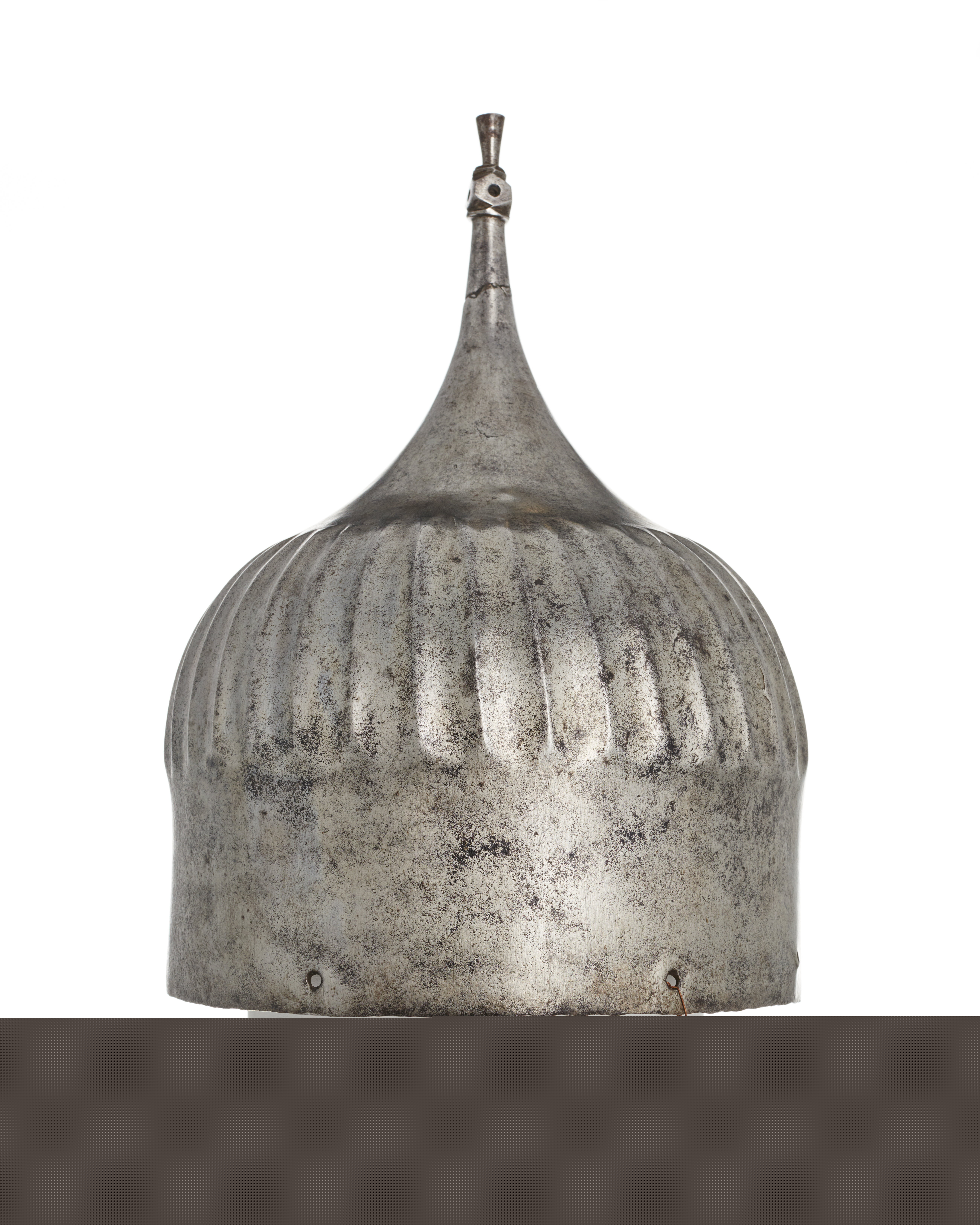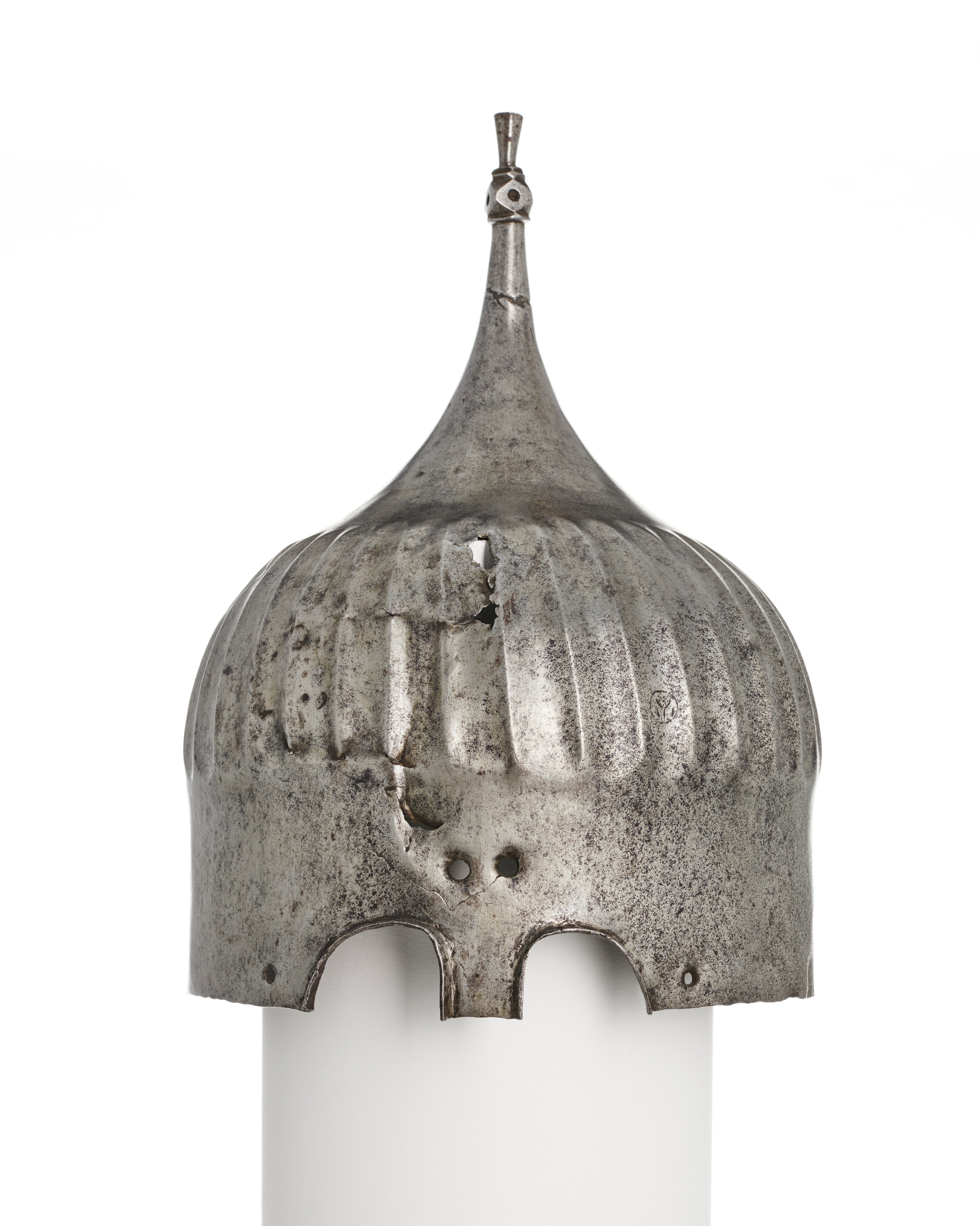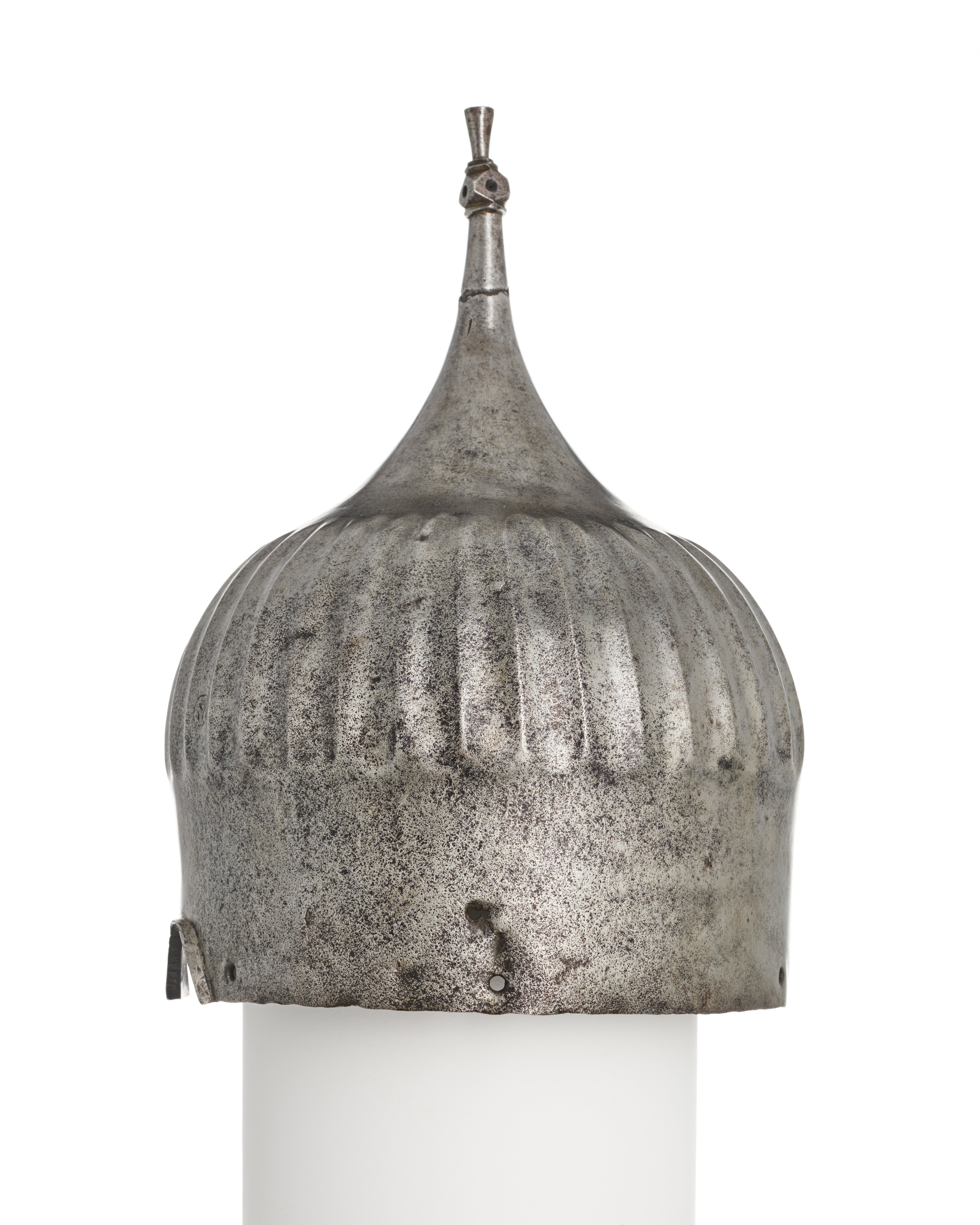 Hjälm med hög, cylindrisk klocka, något utkragad vid det räfflade mittpartiet, avsmalnande till en hög spets, avslutad med en fyrsidig, fasetterad kula, h: 20 mm, b: 15,5 mm och en omvänt konisk spets, h: 21 mm, d upptill 11,6 mm. Framtill vidnederkanten två ögonbågar, h: 30 mm, b: 45 mm med utkragade kanter. Dekor i form av räfflat, drivet fält, h: ca 100 mm, räfflorna skålade och något snedställda åt v. och slutar ca 80 mm från nederkanten. I fjärde räfflan till höger om mitten fram det s. k. turkiska arsenalsmärket, en cirkel med stiliserad hästsvans. Ur den Keller-Sachovskoj-samlingen såld hos Bukowski 1920-03-05, katalog 225 nr 32. Gåva till LRK av direktör I. G. Hellberg enligt gåvobrev 1921-12-20. Enligt uppgift ur det ryska krigsbytet från Erzerum 1829. Ägare: furst Alexej Ivanovitj Sachovskoj (1812-1894), därefter mågen, greve Theodor Keller (1894-1904) och hans son greve Alexander Keller (1904-1918).