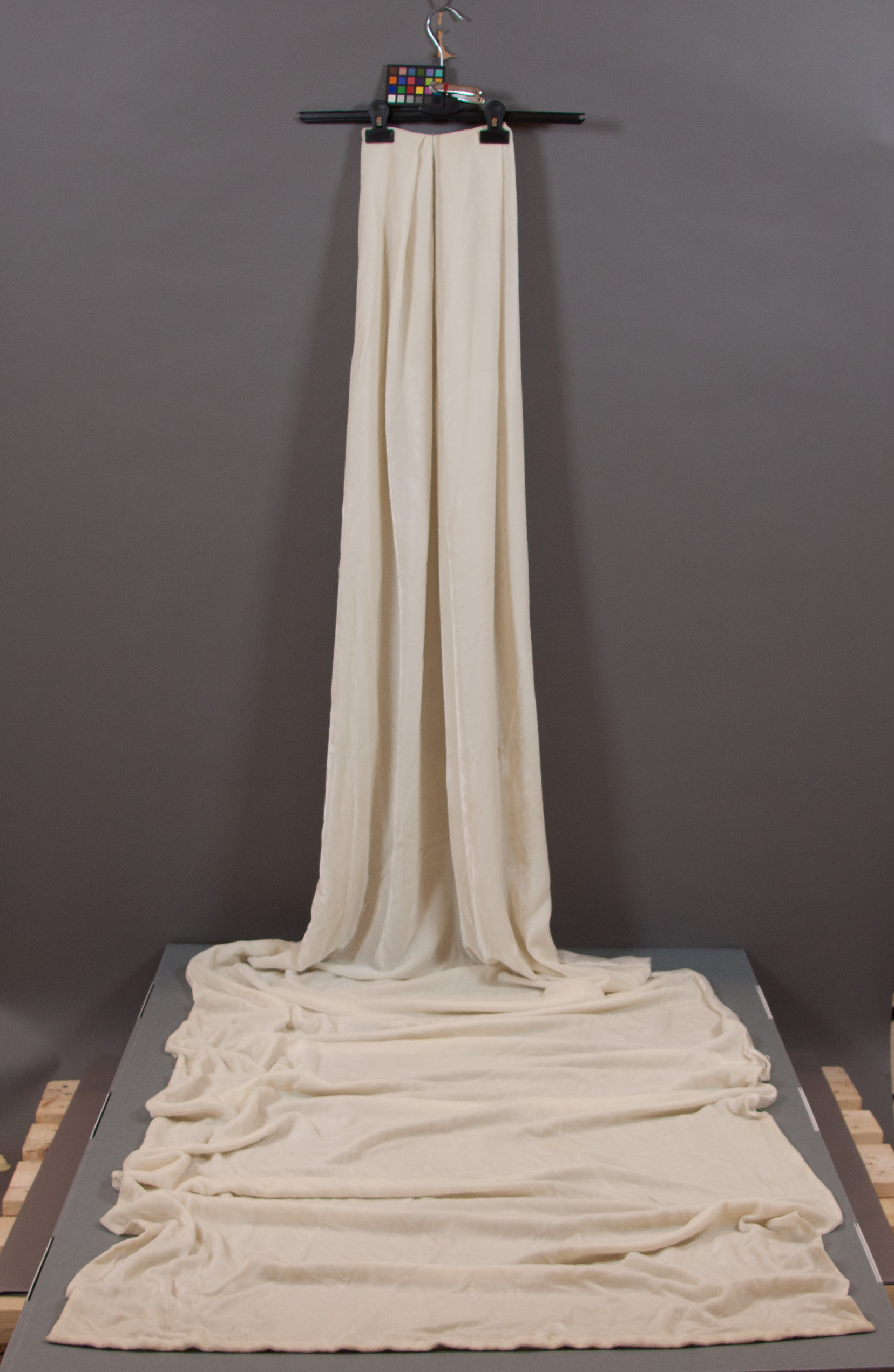 Släp i vit silkessammet. Sydd i ett tygstycke i rak modell med lagda veck mot kanten upptill. Linning saknas. Foder i tunn vit sidentaft. Tyngd, blyband eller dylikt i fållen nedtill samt en sidotyngd i vardera sida ca 1 meter uppifrån räknat. I ena sidan en hälla i sammet att hålla upp släpet med. Hällans längd är ca 17 cm och den är placerad 95 cm från kanten nedtill i släpets höger sida om man tittar på det bakifrån.