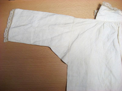 Barnskjorta i fint vävt linne. Skjortan har en rak skärning med raka ärmar sydda i ett stycke. Spetskant runt kragen samt som avslutning på varje ärm. Kragen är 365 mm lång och 55 mm hög som knyts framtill med två stycken band , 15 mm långa och sju mm breda. På ryggen samt på framsidan är det rynkat vid kragen. Halsen har ingen rundning.