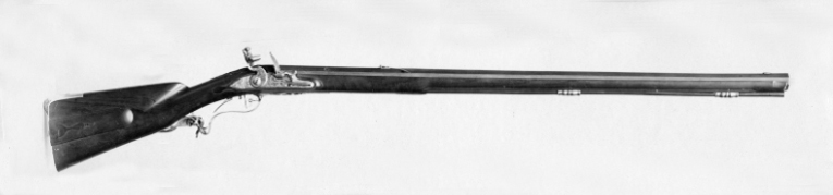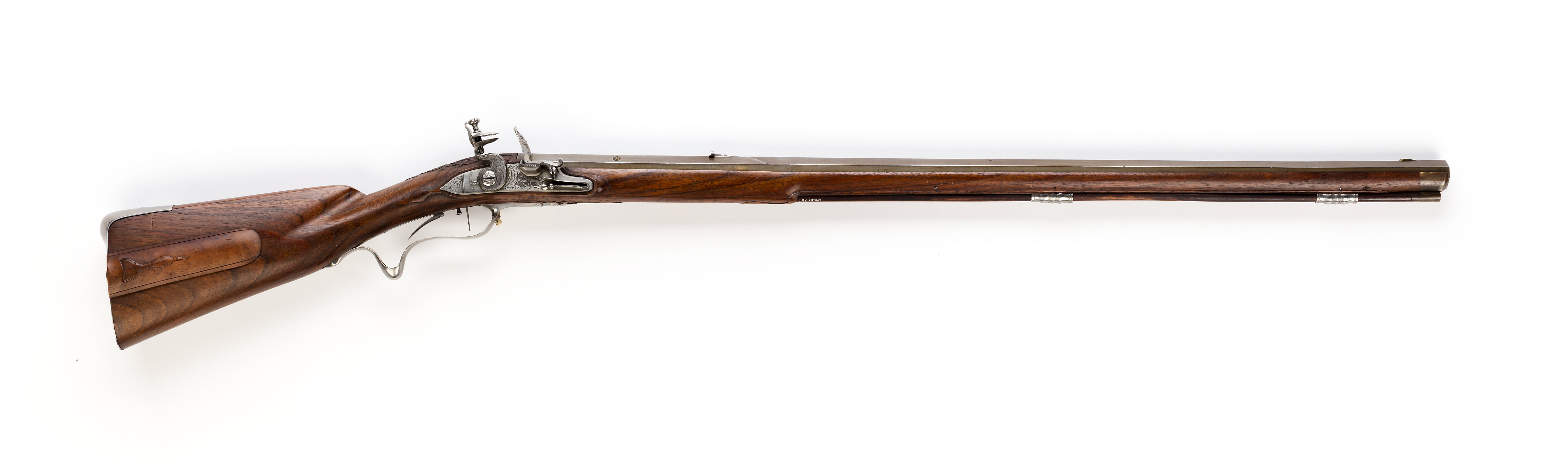 Brunerad, sexräfflad pipa av stål med åttsidig kammare och svagt böjt svansskruvblad med avslutning i form av rundad blad. På kammarens ovansida stämplat: "SAMVEL RIDDERSPORE", samt på sidofaserna S R S och krona (Stöckelnr 930) och Norrköpings stadsstämpel i mässing (Stöckelnr 840). 14 mm från pipbasen på de tre övre faserna en dubbel linje, över skarven till svansskruvbladet en stämpel i form av en punkt, oval och cirkel.Framför siktet är pipan sexsidig med svinrygg, överfasens två kanter mjukt nedåtsvängda till nästa kant på vardera sidan, som är gemensam för kammare och främre del. Mässingsfodrat fänghål. Riktmedel: 180 mm från pipbasen ett inlaxat, blånerat sikte. På kanten 28 mm från mynningen ett spolformigt korn av mässing. Fästning: Två häften. Pipan fäst med krysskruv uppifrån, bakre låsskruven genom svansskruvplattan samt två pipstift av stål. Flintlås av stål, plant låsbleck med fasade kanter, försänkt bakspets, graverade bladrankor, rocailler på bakspets och framför hanen, graverad signatur på band mot försänkt, prickad bakgrund."WÅHLBERG", bakom hanen "Stockholm". S-formig hane med dekor som på låsblecket, nötskruv med välvt huvud, gravyr i form av en blomma. Ovala käkar, överkäken lös, käkskruv med balusterformigt huvud. Kantig fängpanna med skålad fals. Batteri med fängpannelock med fasad kant, eldstål med kraftig åsning på ryggen, upptill en droppformig fasning på åsen, fot med uppsvängd ände. Batterifjäder med delvis fasade kanter, litet fjäderlöv med droppformig spets. Nöt med yttre springkil. Fästning: Två låsskruvar. Avtryckare med snälltryck. Rektangulärt avtryckarbleck. Helstock av valnöt med kindstöd och kolvlåda, kolvryggen nästan plan med markerade kanter, markerad kolvnäsa med snidade blad, övergående i fint skurna bladrankor vid svansskruvbladet, enklare, släta blad framför varbygeln och vid spetsrörkan, liknande blad på kolvlådelocket. Näsband av horn, övriga beslag av stål. Slät kolvkappa med välvd, framtill tvärt avskuren tunga på kolvryggen. Sidbleck i form av två s-formigt svängda delar med skålade mittband. Två svarvade rörkor. Varbygel med pungformigt nedsvängd bygel, främre armen 8-formig och avslutad med urna med treflikigt blad, litet, treflikigt blad vid bakänden. Tillbehör: Laddstock av stockens trä, l: 865 mm, framtill skodd med horn, l: 27 mm, i andra änden ett invändigt gängat mässingsrör, l: 128 mm.