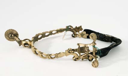 Sporre av förgylld mässing med skänklar av genombrutna ögleformade ornament med konturerade kanter. Halsen snett uppåtriktad samt nedtill ansvälld och genombruten. Klinga rund med solfjäderformigt ordnade räfflor. Gåva av greve Carl Björnstjerna, Karlavägen 72, 114 59 Stockholm