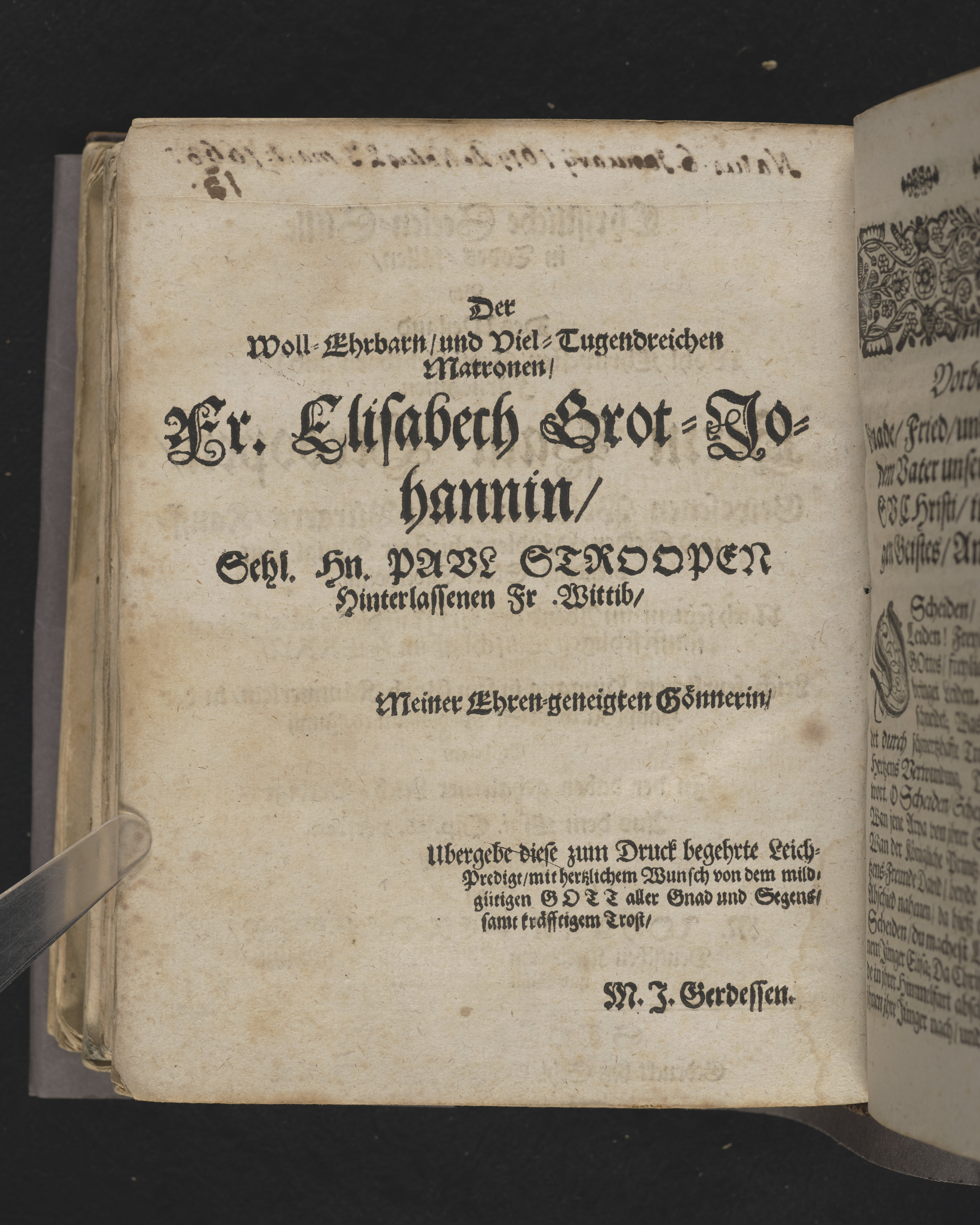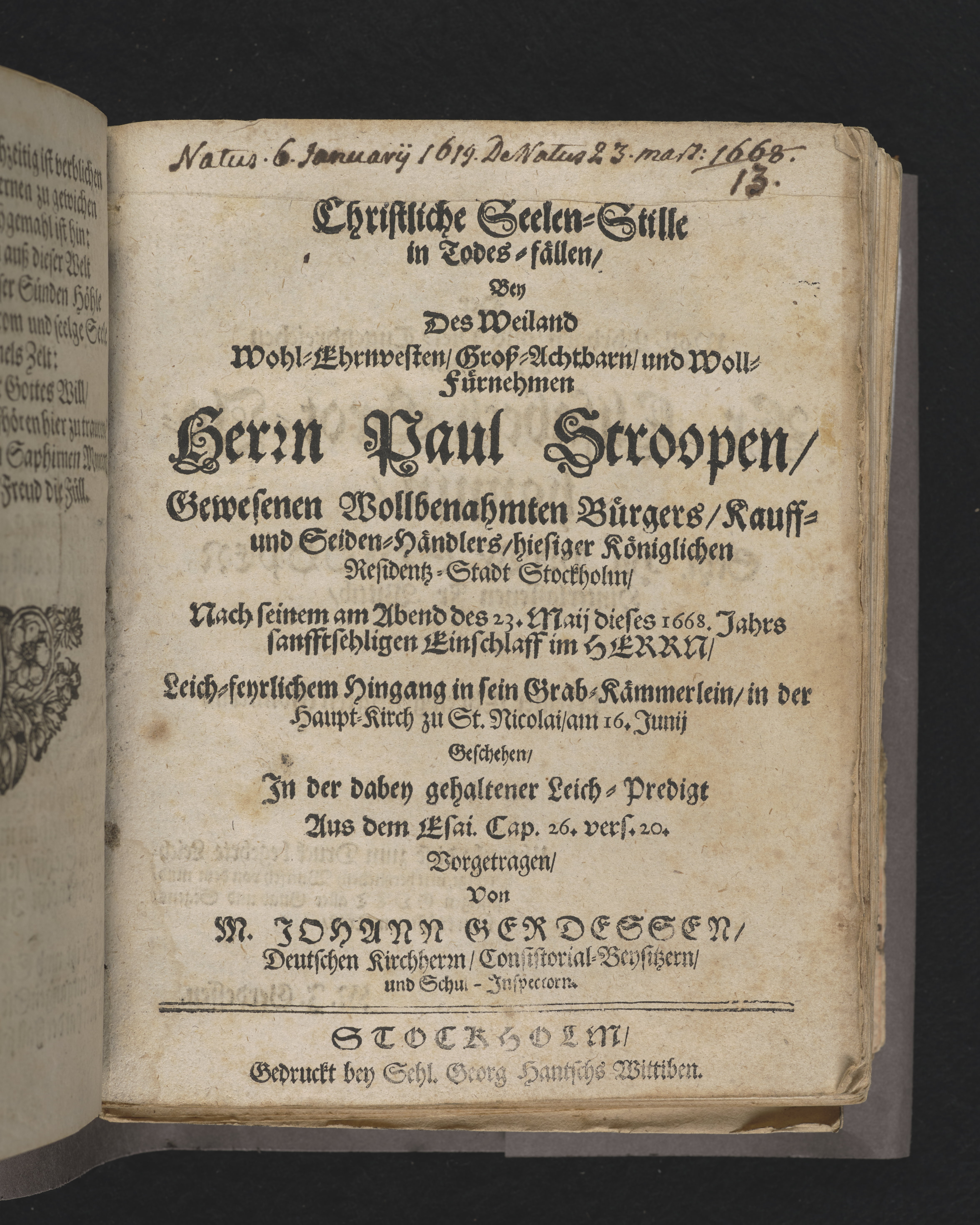 Christliche Seelen-Stille in Todes-fällen, bey ... Herrn Paul Stroopen, gewesenen wollbenahmten Bürgers, Kauff- und Seiden-Händlers, hiesiger königlichen Residentz-Stadt Stockholm ... in der Haupt-Kirch zu St. Nicolai, am 16. Junii geschehen, in der dabey gehaltener Leich-Predigt ... von M. Johann Gerdessen ... Stockholm, gedruckt bey sehl. Georg Hantschs Wittiben.