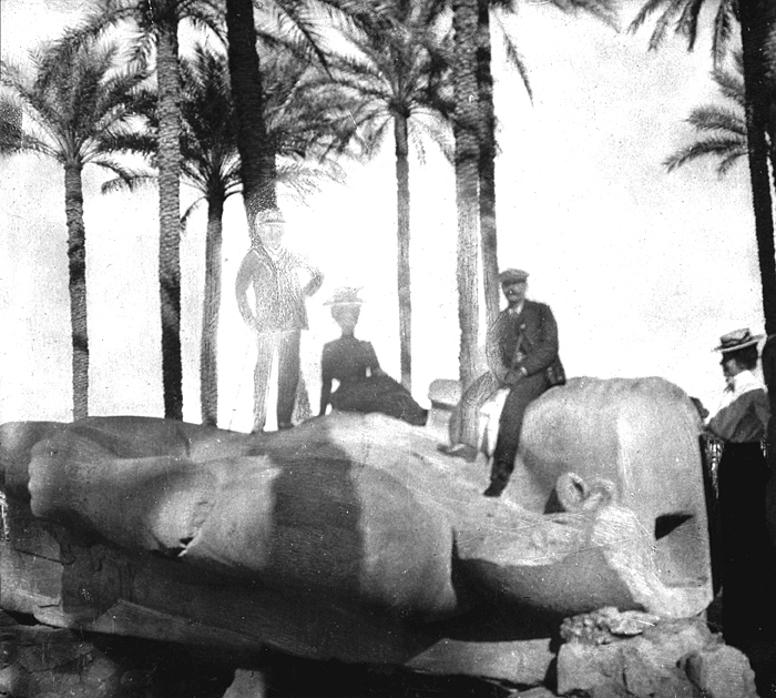 Ramses II-statyn i Memfis och Ellen och Henrik de Maré. Memfis, Egypten. Text på fotografiet: Colosse de Ramsès II à Memphis et les de Maré. Fotografierna LXVI:M.01.- 201. kommer från resan till Egypten och Sudan som Wilhelmina och Walther von Hallwyl gjorde vintern 1900-1901. De lämnade Sverige den 5 november 1900 och fortsatte från Egypten till Palestina den 28 mars 1901. Med på resan var döttrarna Ellen med maken Henric de Maré och Irma med maken Wilhelm von Geijer. Wilhelminas sällskapsdam, fröken Ida Uhse reste också med. Under en del av resan anslöt sig ledamoten av Internationella domstolen i Kairo, assessorn Otto Conrad Waldemar Cedercrantz med makan Anna Elisabeth. Vid resan uppför Nilen hade Walther von Hallwyl hyrt ångfartyget Columbia med besättning. Båtresan startade i Kairo 27 december 1900, gick ända till Wadi Halfa varifrån man reste vidare med tåg till Khartum och tillbaka till Wadi Halfa. Båten vände åter i riktning mot Kairo, men det verkar som att sällskapet tog tåg sista biten, från Luxor. Henric och Ellen de Maré samt fru Cedercrantz lämnade båten redan då de passerade Luxor första gången. Resten av sällskapet återvände till Kairo den 1 mars. Fotografierna LXVI:M.01.-120. togs av resenärerna själva, de största av Ellen de Maré, de mellersta av Wilhelmina von Hallwyl och de minsta av Wilhelm von Geijer. Resten köptes av professionella fotografer i Kairo, de flesta från Studio Photogr. Artistique G. Lekegian & Cie. Alla uppgifter kommer från Ida Uhses reseanteckningar.