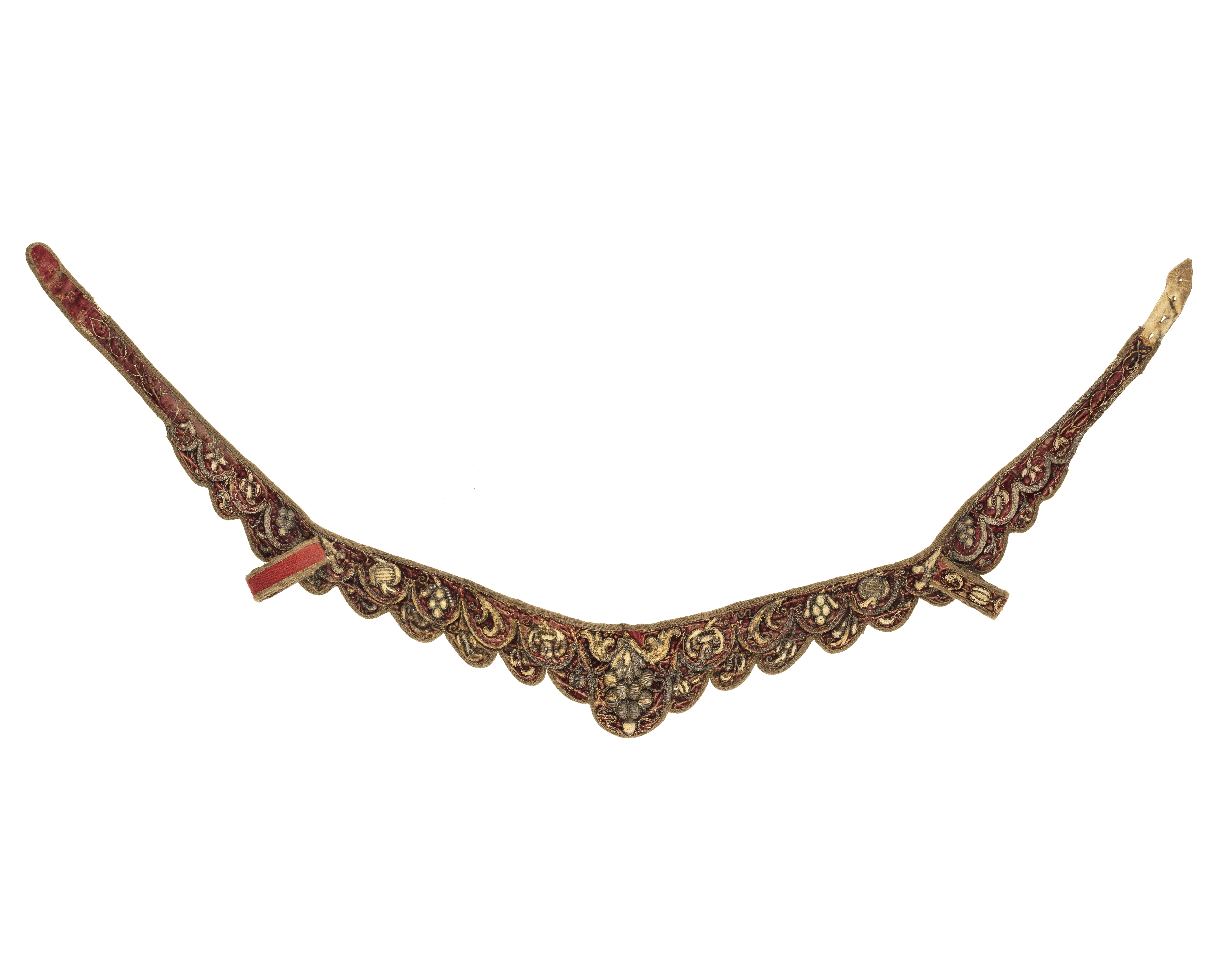 Brösta av brunt läder klädd med röd sammet. Bröstans bredd ökar ca 200 mm från ändarna och övergår till 11 droppformiga flikar i två våder. Bröstans mitt markeras av en större, 100 mm bred droppformig flik, prydd med ett druvliknande reliefbroderi. Övrigt broderi i form av ett vegetativt mönster. Kanter och flikar kantade med linneband (konservering). På utsidan på vardera sidan, ca 350 mm från änden, är fäst en rembygel i vilka pistolhölstren på sadeln är instuckna.
