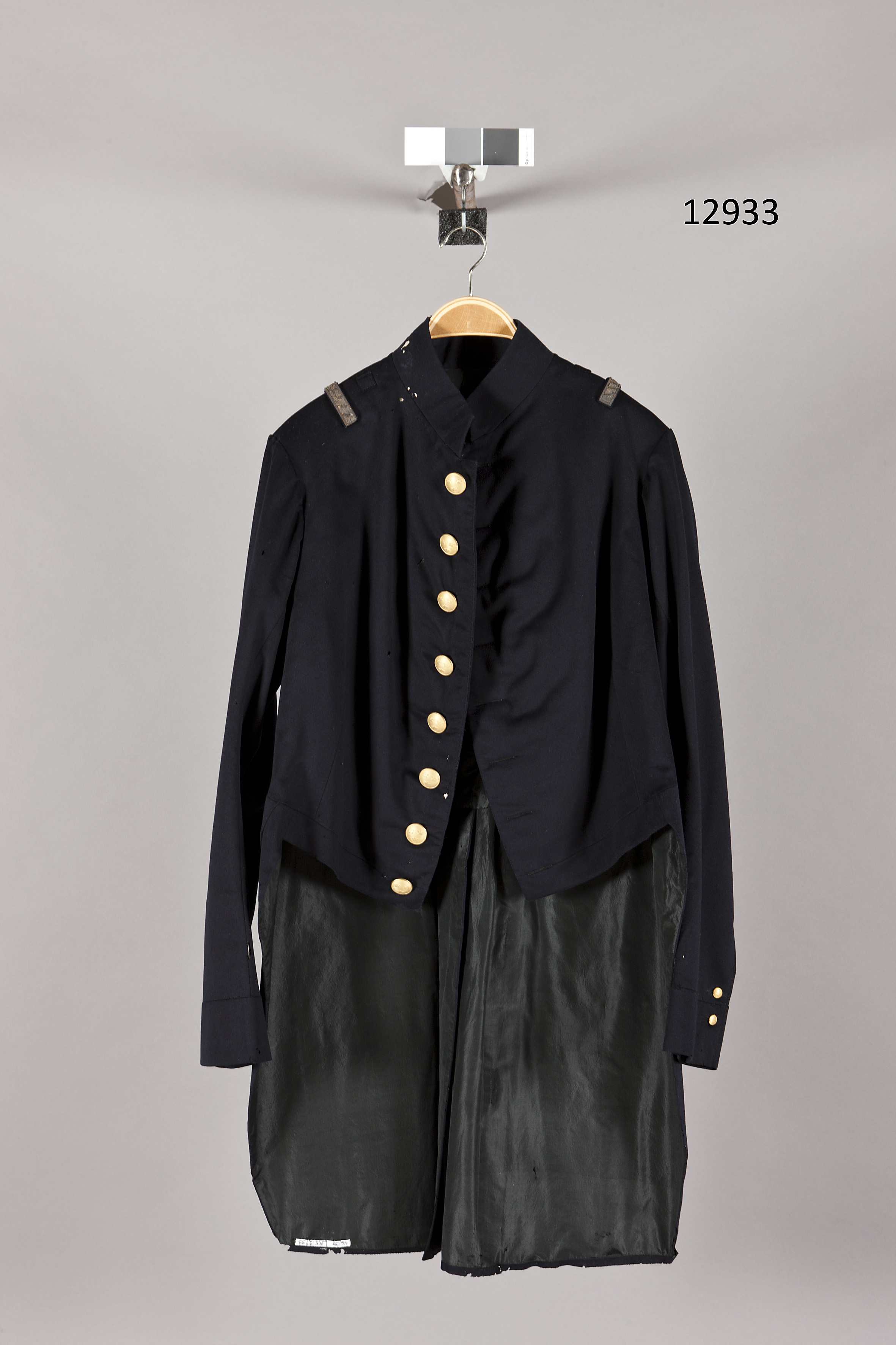 Frack av mörkblått kläde, hel rygg, enkel knapprad. Ståndkragen knäppt med hake och hyska. Öppen knäppning med åtta välvda mässingsknappar, d: 25 mm med tre kronor. Axlar med tyghälla och axelslejf "för generalitet mm" av broderad förgylld silvertråd. Slagen på ärmarna markerade med en söm. Sprund med två knappar och knapphål. Knappar, d: 12 mm, i övrigt som föregående. Delad skört, i livsömmen en knapp i var skörtsöm. Knappar, som föregående, d: 25 mm. Fickor i skörtsömmen. På var skört ett konturerat ficklock i livsömmen med tre knappar, som föregående, d. 25 mm. Foder av svart taft, vadderad och med pikésöm i livet. Ärmfoder av gul sidendiagonal. Fickfoder av svart ylletuskaft.