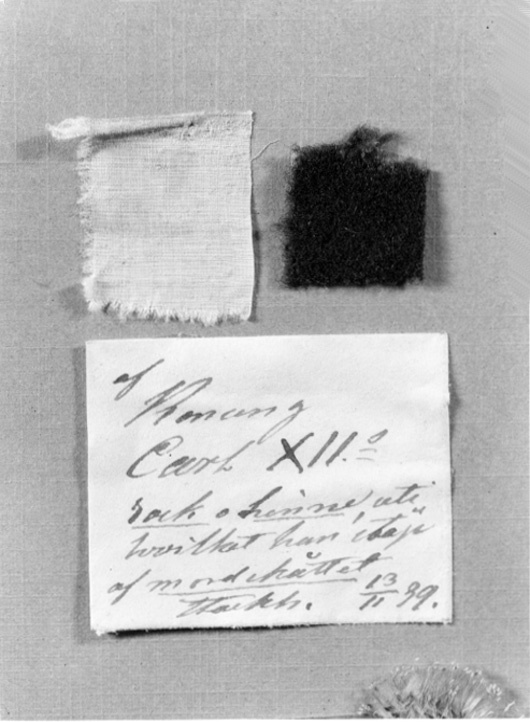 Läderremsa. Uppklistrad på etikett med bläckpåskrift, i sin tur klistrad på tavlan. Text: " Ulricsdahl 12-6 47. // af Carl XII:s sadel // begagnad från // Bender till Stralsund".