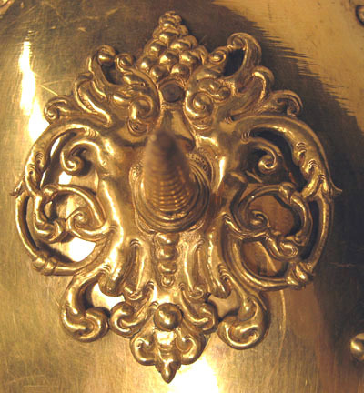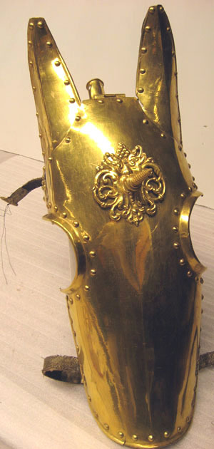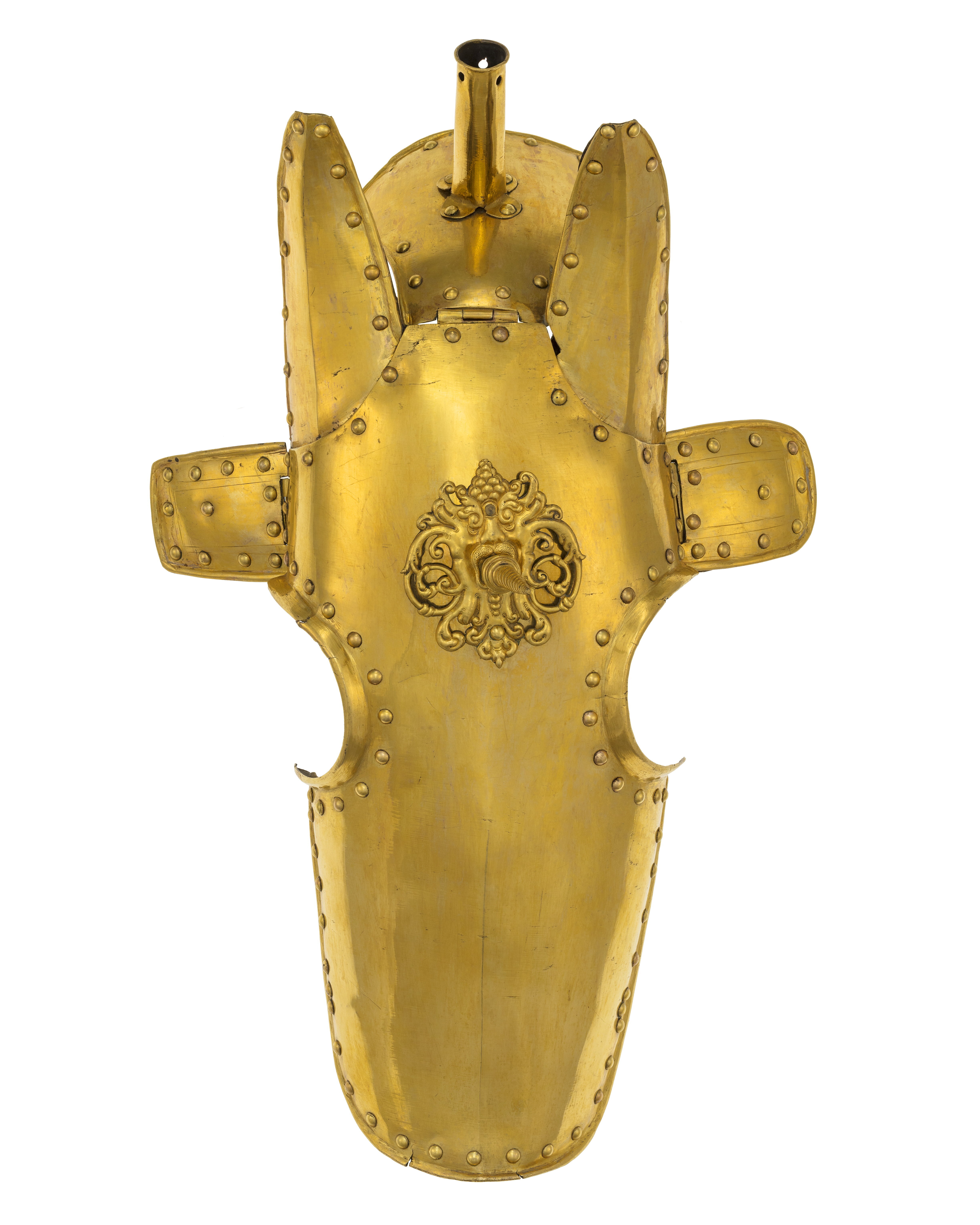 Av driven mässingsplåt med utsidan slipad, förgylld och polerad. Sammanlagt sex delar. Rundade urtagningar för ögonen med utåt böjda och omvikta kanter, b 15 mm. Bakom dessa en från kanten hängande ledad rektangulär platta, 103 x 86 mm. Pann- och nosplåten nedåt avsmalnande med från ögonhöjd och nedåt driven låg och svagt spetsig mittås. Upptill vid öronen nitade skenor, uppåt avsmalnande med V-formigt tvärsnitt. I övre kant mellan öronskenorna en gångjärnsförsedd välvd nackplåt med i främre kanterna rundade urtagningar, bakre kant rak. I plåtens mitt en cylinderformad plymhållare, h 100 diam 27 mm, med nertill fyra utvikta vingar med rundade kanter, fästade med en nit i var vinge. Framför öronen i var nederkant en rektangulär nedhängande plåt, fäst i övre kant med ett gångjärn I pannans mitt ett drivet och ciselerat ornament, 121 x 127 mm, av mässing med genombrutna sidor. Dekoren organisk med slingrande former, upptill en druvklase. I mitten gängad spets, vriden och uppåt avsmalnande med konturerad bas. På insidan kantband av gulaktigt sämskat skinn under nitarna, på öronskenorna dubbelvikt till en ögla för tränset att löpa genom. Upptill på nackplåten och nertill vid mulen på vänster sida en rem, på höger sida rem med sölja. Remmarna av svärtat läder på ovansidan klädd med linnetyg med påsydd silvertråd. Söljan, l 60 mm, av mässing med förgylld ovansida och rektangulär ram med utåt sluttande kanter och skurna linjer. Alla yttre kanter omvikta med nitar i rad, skallarna kullriga och förgyllda.