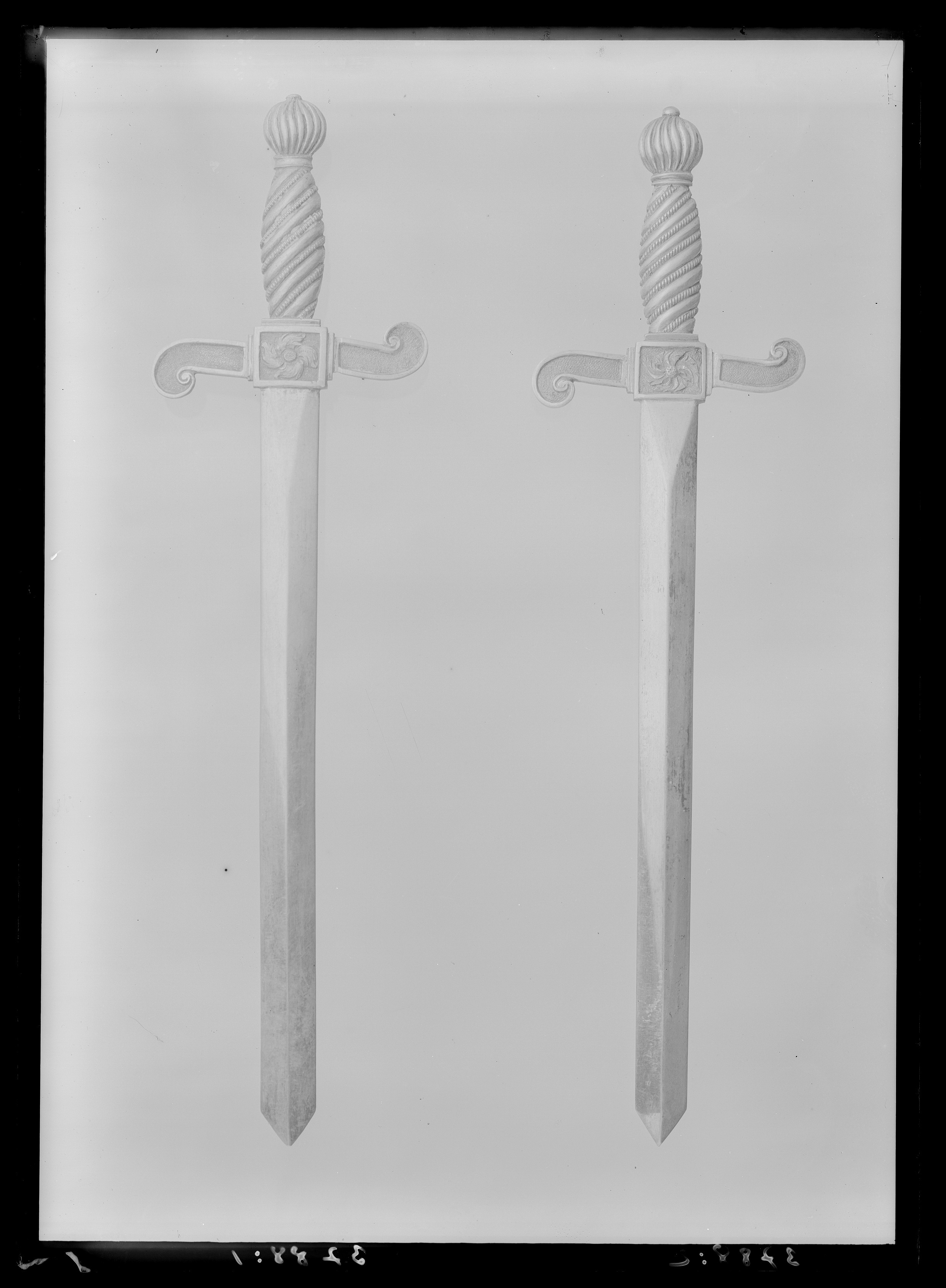 Svärd av silverplåt, tvåeggad klinga med mittås, tvärt avskuren spets, mittåsen upphör 20 mm från fästet. Fäste med rund, spiralkannelerad knapp med nitknapp, s-formigt svängda parerstänger med upphöjda kanter och försänkt, punsat mittparti, kvadratiskt kryss med fyrbladig, spiralvriden blomma mot mattpunsad, försänkt botten. Kavel med spirallindning, varannan blank, varannan räfflad. På baksidan fyra öglor för fästning vid manteln.