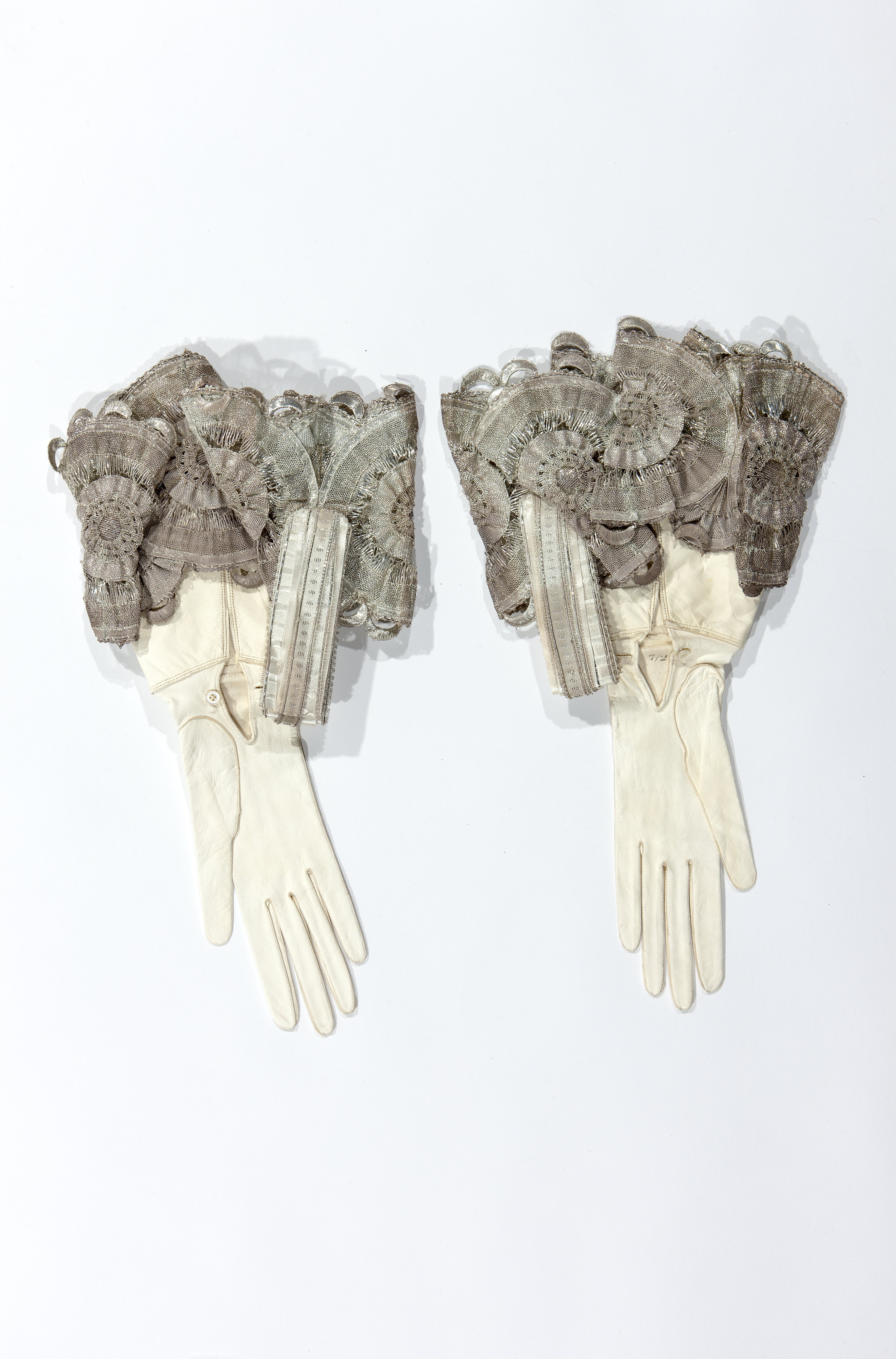 Vänsterhandske av vitt glacéhandske. På handens ovansida tre mönstersömmar. En 110 mm bred krage med påsydd silverspets, 155 mm bred. Vid ena sidan rosett av silverband och vita duchesseband. På insidan en 80 mm lång slits knäppt med en liten pärlemorknapp. Oscar II erhöll denna värdighet 1881-05-17 av drottning Victoria på slottet i Windsor.