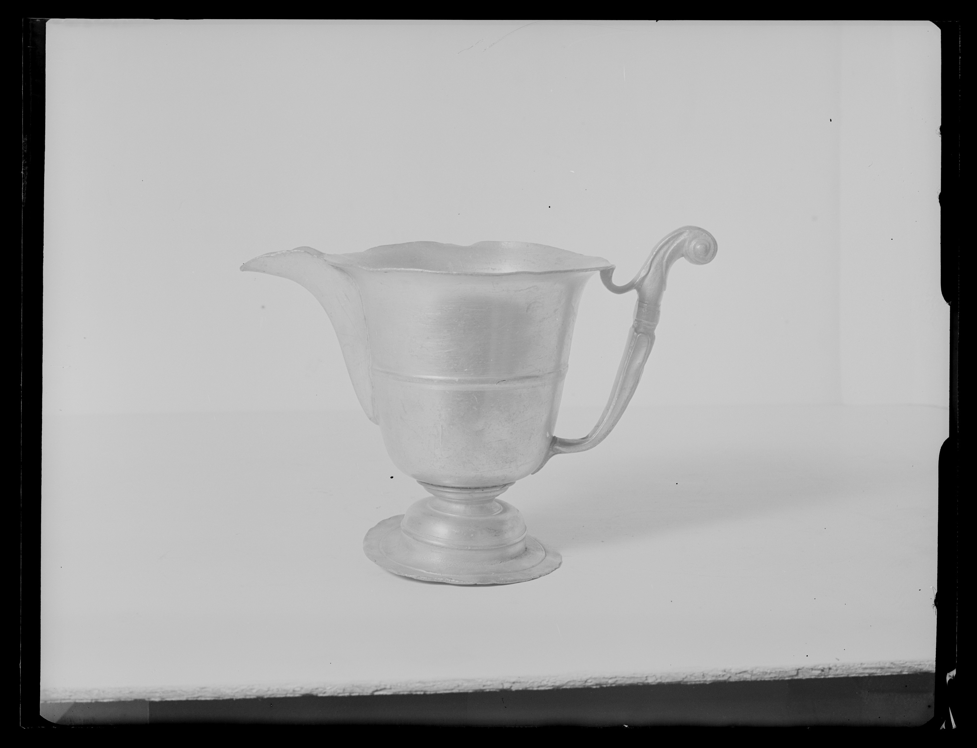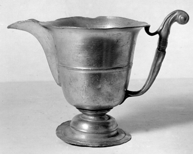 Kanna med horisontal, smal vulst på mitten, raka sidor vidgade upptill, utvikt mynningskant som löper förbi snåsen. S-formad, profilerad lodgrepe överskjutande mynningen. Rund, profilerad fot, förhöjd i mitten. På insidan, i kannans botten 5 stämplar: 1) Proberstämpel med tre kronor 2) Jacob Lemons märke, antikvaversalerna "I.L.M" inom kontursköld med bård och med från bården utväxande blad på båda sidor. (Bruzelli m A 13 c) 3)4) J Lemons märke "I L" över citron (rebus) med blad inom kontursköld och bård (Bruzelli nr A 13a) 5) Årsbeteckningen "Y 2) (fraktur versal) för 1805 På fotens undersida graverat "HAGA"