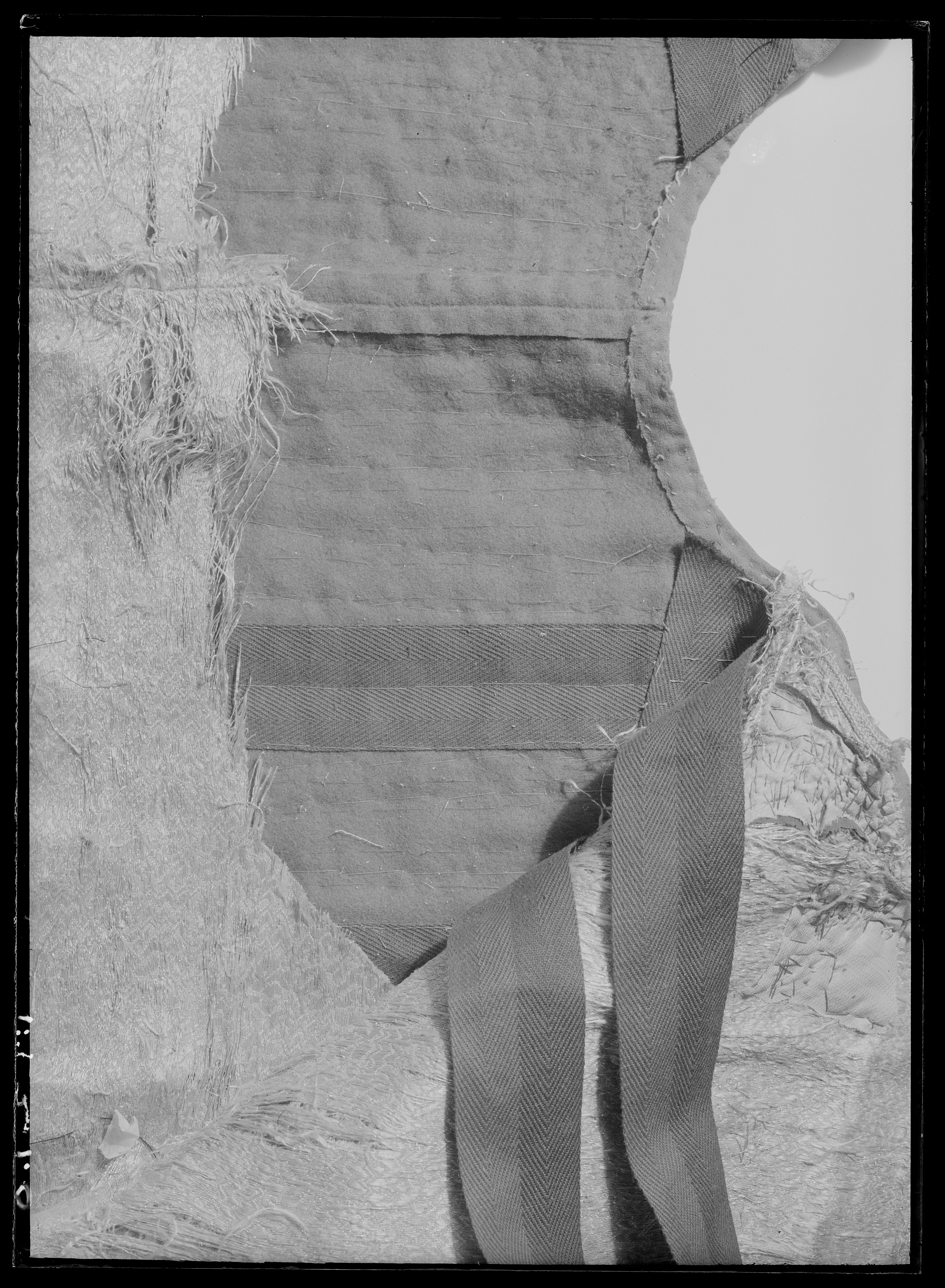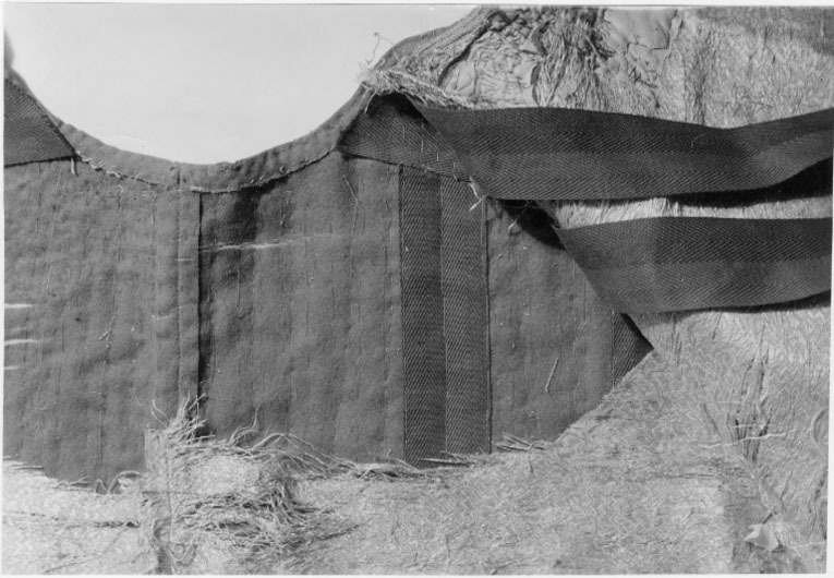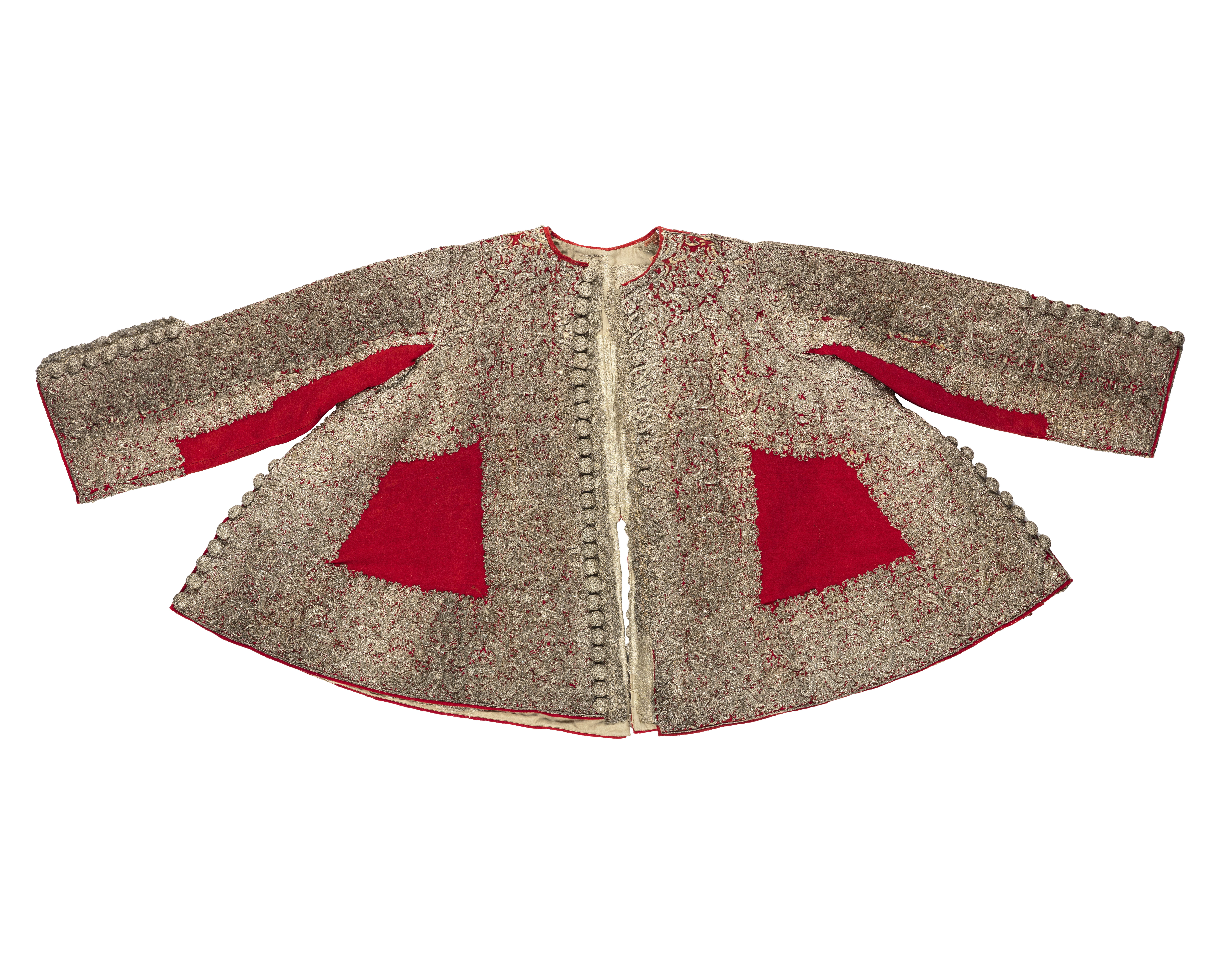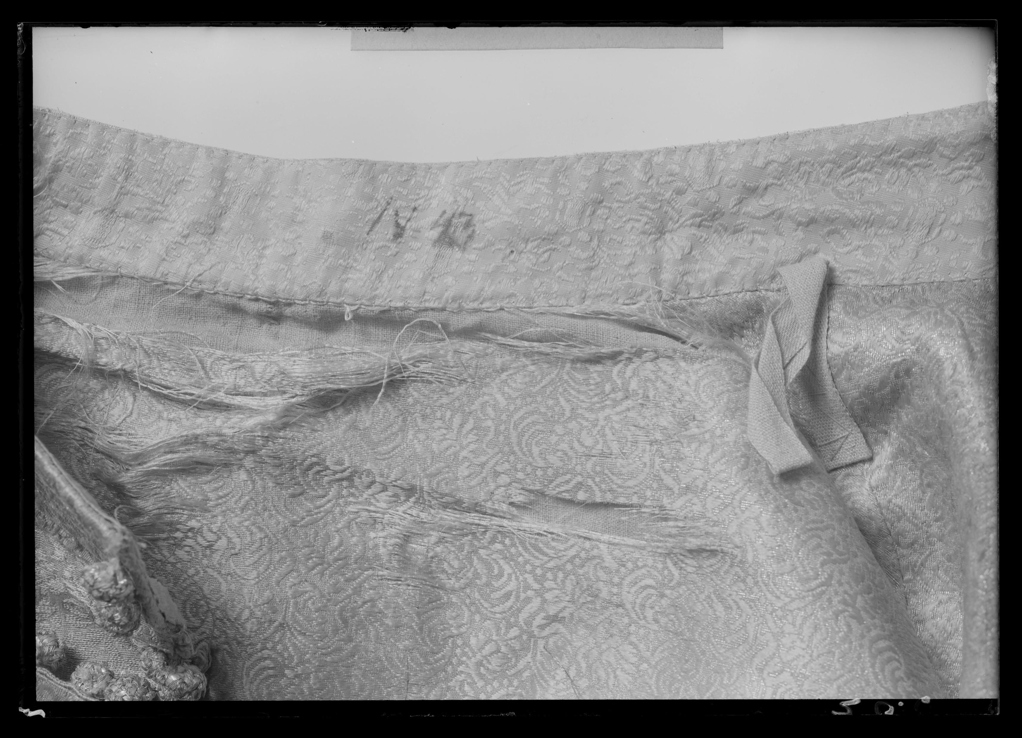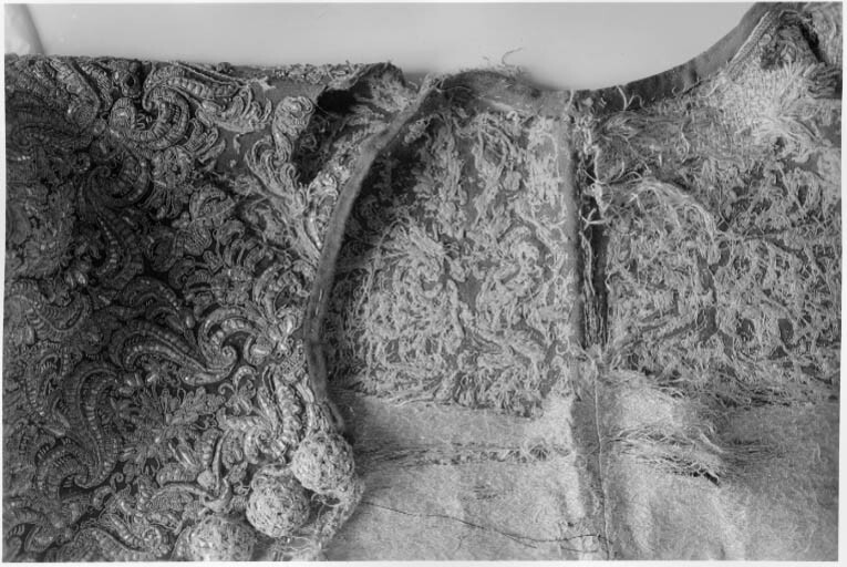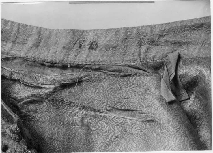 Kasack av scharlakansrött kläde, ornerad med silverbroderi. Skuren i 4 svängda stycken så att sidsömmarna är sneddade utåt nedåt. (Jfr gnr 3391. Ärmarna är dock något längre på denna kasack). Halsurringningen är rund utan krage med endast en smal rulå i kanten. Bak ärsömmen öppen så att ett 38 cm långt sprund bildas. De sneddade sidsömmarna är 58 cm långa och har ungefär lika långa sprund som baksömmen. På vänster framstycke sitter en radtränsar, 24 st, som kan knäppas på de 26 st stora silvertrådsknapparna på höger framstycke.I de öppna sprunden sitter samma slags knappar och tränsar. Sprundet har bak på vänstersida 11 knappar (minst 1 fattas) och 11 öglor på höger sida. Höger sidosprund har 10 öglorpå bakstycket och 10 knappar på framstycket. Vänster sidosprund har 11 öglor på bakstycketmen endast 9 knappar kvar på framstycket. Ärmarna är sydda av 2 stycken. De har nedtill 29 cm höga sprund. I detta finns på vänsterärm det ursprungliga antalet knappar och öglor kvar, nämligen 10. Höger ärm har däremotbara 8 knappar med 10 öglor kvar. Det scharlakansröda klädet har en vådbredd av minst 76 cmmed 23 varptrådar x 28 inslagstrådar/cm2. Kasacken är på insidan fodrad med silverbrokad.Den benämnes silverduk i inv. 1671 och har följande utseende: Vådbredd 53 cm (74x18tr/cm2). Varp och inslag är av vitt otvinnat silke. Det släta bottteninslaget har på rätani varje inslag en lan. Mönstret bildas genom att de flotterade inslagstrådarna tvinnats medsilverlan. Stad 0,6 cm (7 gröna, 3 gulorange, 9 gröna, 1 vit tråd). Mönsterrapport: h 6,4cm, b 13,7 cm. (Samma mönster som i fodret till kasacken 3391 fast där vävt i guld och silver). Analysresultat: Silvertråd tvinnad med textiltråd. Huvudbeståndsdelar:Silver xxx Guld 0Koppar xZink 0 Kasackens ärmar är helt yttäckta med broderad silvertråd och plagget i övrigt nästan heltyttäckt med broderad med silvertråd samt krepiner och lan av silver. Blott detrapetsformade fälten i mitten ha lämnats utan broderi. Man har m.a.o. följt sömmarnaskonturer. (Ärmarna skall ej vikas till något uppslag, ty de är broderade ända ut i kantenoch när de hänga rakt ned går de helt i linje med kasackens nederkant). Broderiet ärovanligt stormönstrat, h 20 cm, b 13,5 cm. Mönstret är kandelaberartat med accentueradeblad som böja sig i bågar mot varandra. Det är nersytt med vitt högertvinnat silke samtvitt lingarn som man även knutit till på baksidan. Broderiet är utfört med olika slagssilverkantiljer som bildar ett stiliserat bladmönster. Kantiljerna varierar till utförande.Dels har man lindat silverlan kring en kärna av vitt silke, dels har man rullat ensilversträng i spiral, dels har man kring en lan glest rullat en spiral och dels har mantvinnat samman trådar, som omspunnits med silverlan etc. Även silverpaljetter har sparsamtbegagnats. Sömmen i sidorna, bak och på ärmarna har markerats med små runda "toppblommor",som tätt, tätt placerats mellan 2 grova snodder, vilka även bildar avslutning nedtill. Dessa består av en kärna av snöre, som omspunnits med en platt pergamentremsa heltöverklädd av smal, trind silvertråd och häremellan ha virats smala silverspiraler. Utanfördenna har en kedjelik snodd av silvertråd lagts. I de öppna kanterna har ursprungligen enc:a 4,3 cm bred knypplad uddspets av silver suttit. Den finnes nu delvis bevarad. Den ärknypplad av högertvinnat vitt silke, som kärna överspunnen åt vänster med silverlan. 2 st(2 mm) breda silverlansslingor löper i bågar mellan de glesa stolparna i spetsen. Spetsensitter kvar på större delen av vänster framstycke. I höger ärms sprund samt utefter helahögra framstyckets framkant utanför knapparna. Detta torde tyda på att man icke avsåg attknäppa plagget. Det stora knapparna, d: 2,8 cm, består av en halvsfärisk kärna av trä,svarvad med hål i mitten. Denna är överklädd med 3 och 3 tjockare silvertrådar (varje trådbestår av en vit högertvinnad silkeskärna, vänstersprunden med silverlan, samt åt vänsteröverspunnen av en smalare högertvinnad silkestråd med smal silverlan) som sytts som ettnät. Häremellan är (1,5 mm breda) silverlan inlagda. Antalet f.n. bevarade stora knappar är74 st. Troligen har det från början varit 78 st. Analysresultat: Silvertrådsbroderi. Huvudbeståndsdelar:Silver xxxGuld 0Koppar xxZink 0