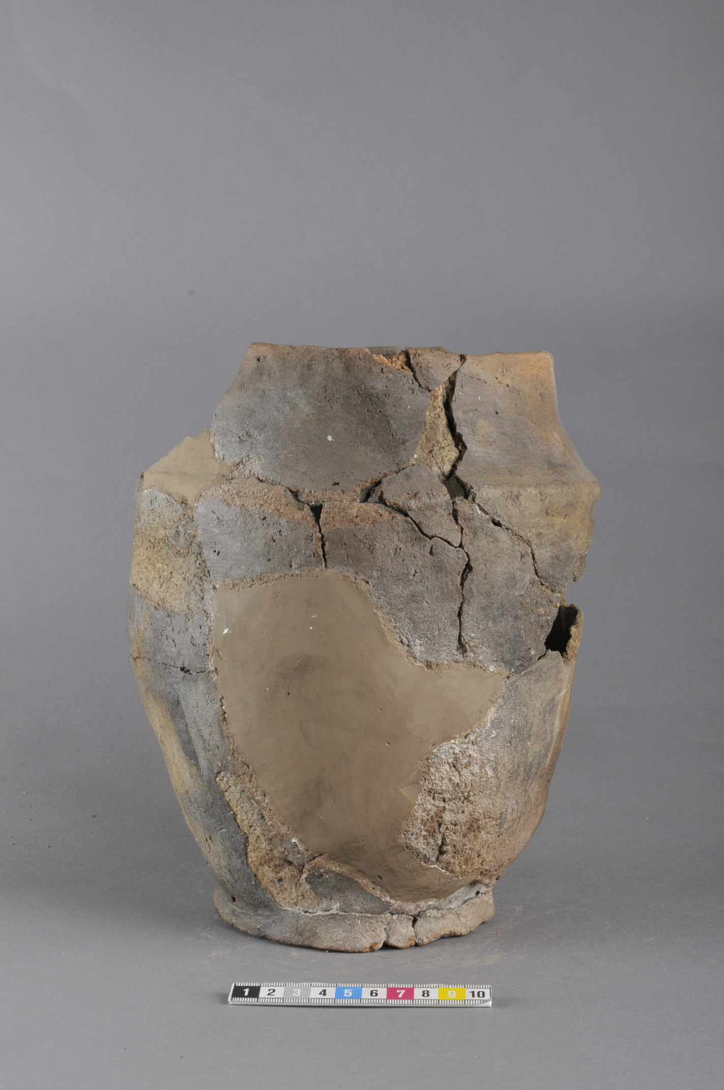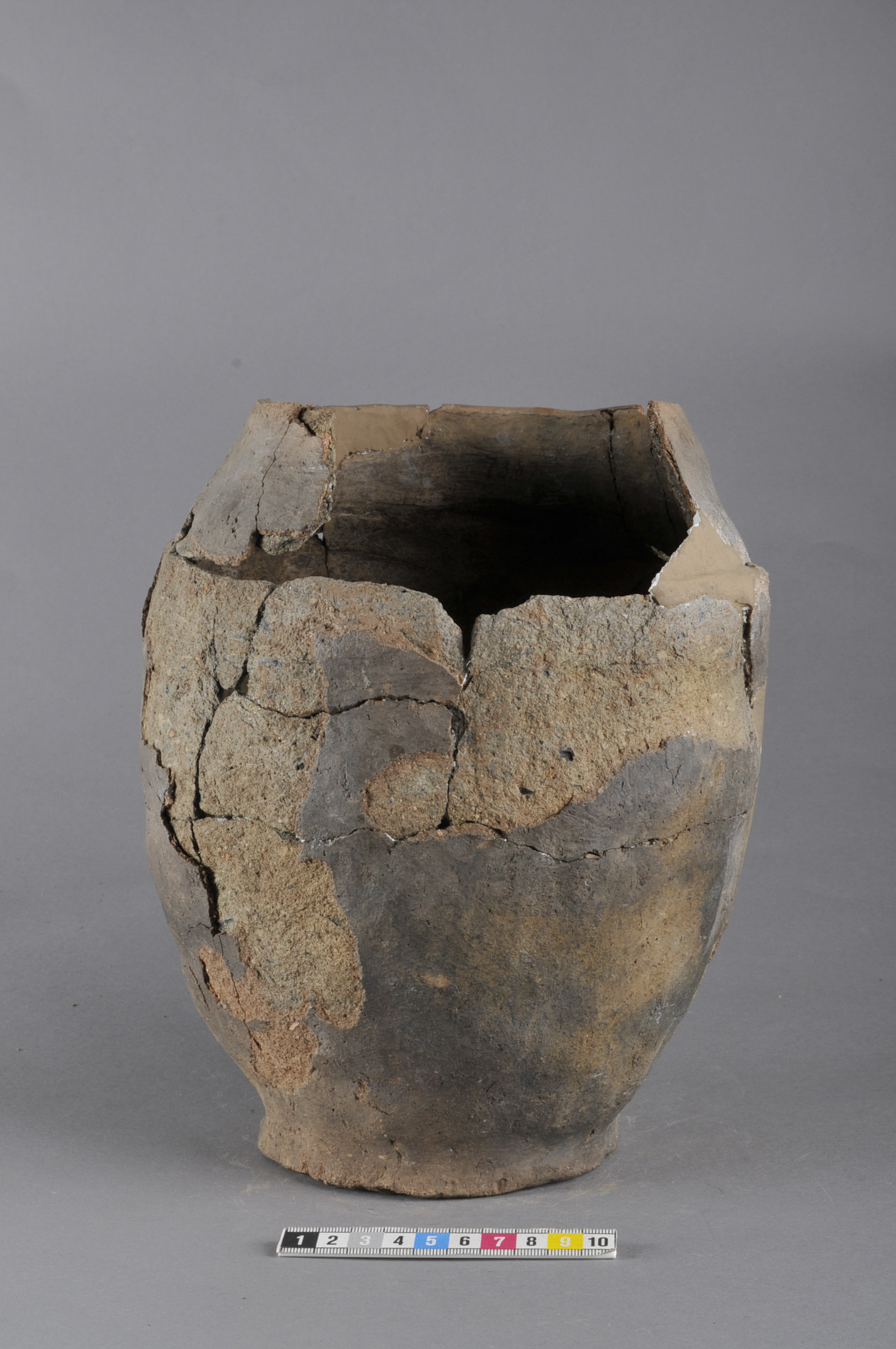 Till viss del rekonstruerat oregelbundet kärl med avsatt skuldra och hals. Slätad yta och grovt, sandmagrat gods. Skålformat lock har tillhört urnan.