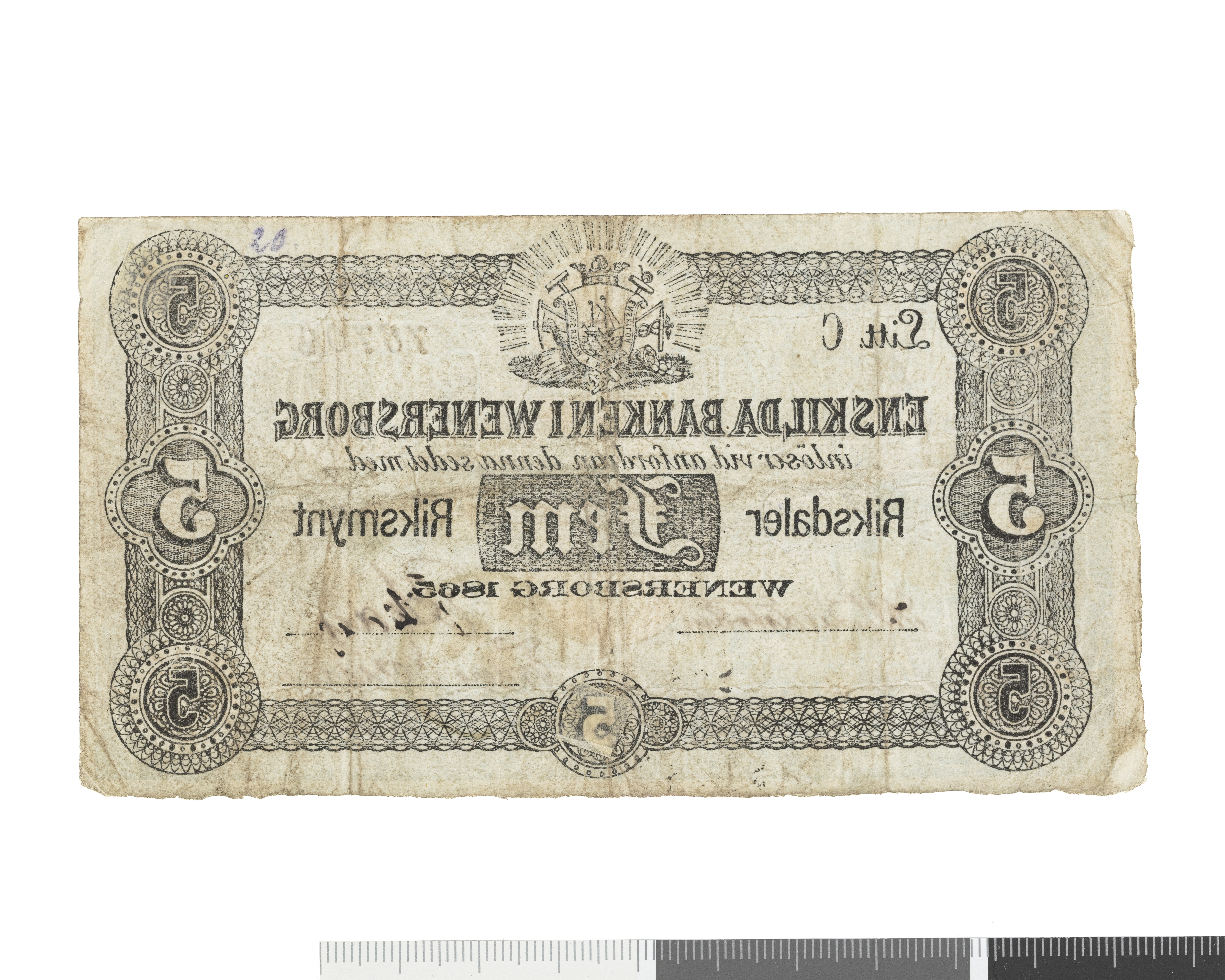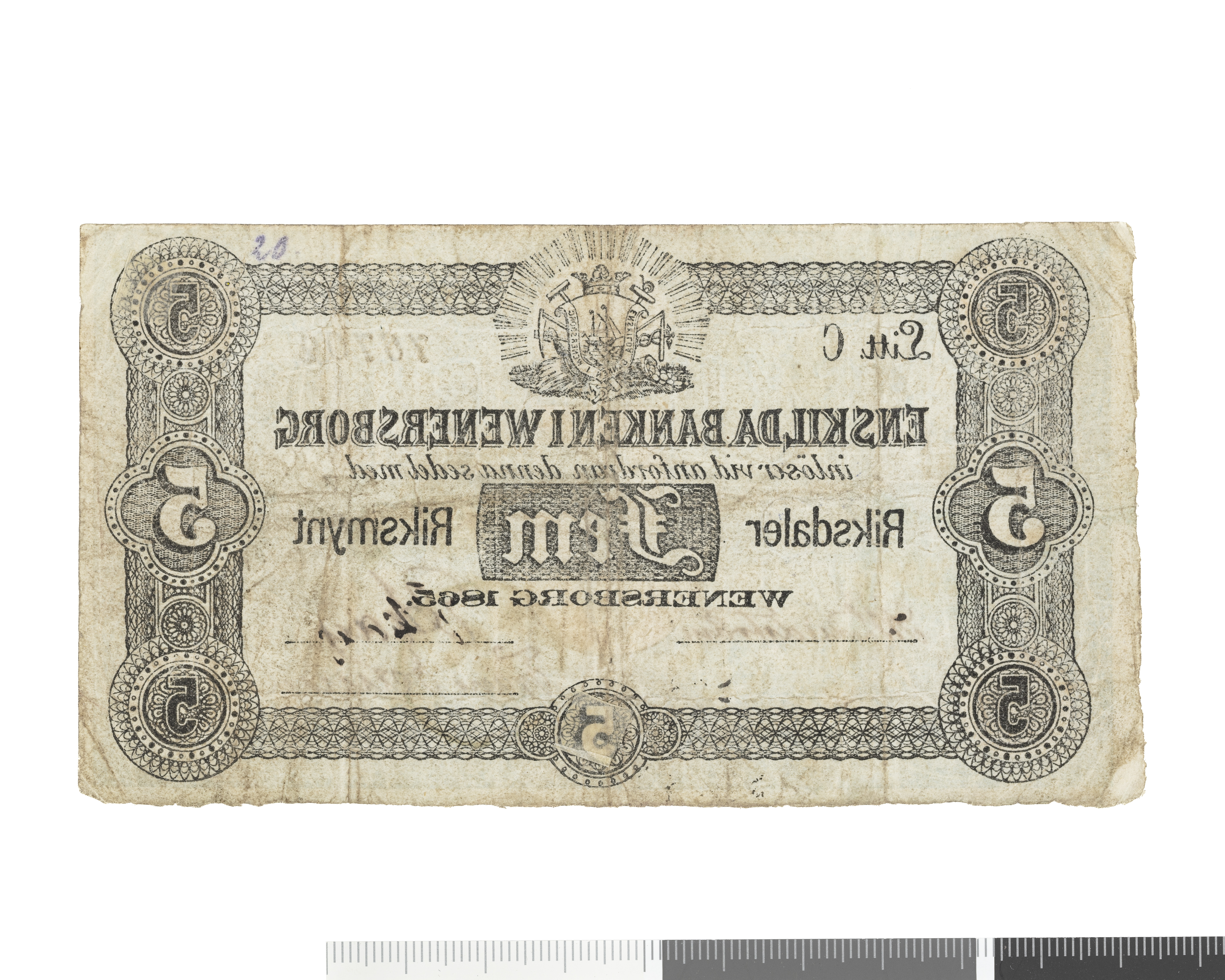 Upphov: Enskilda Banken I Venersborg. Media: Bonnevier, Helena. Ekonomiska museet - Kungliga myntkabinettet/SHM, (PDM) Upphovsrätten till detta verk har gått ut och är därmed fritt att använda på alla sätt. Ange gärna upphovsperson om denne är känd.