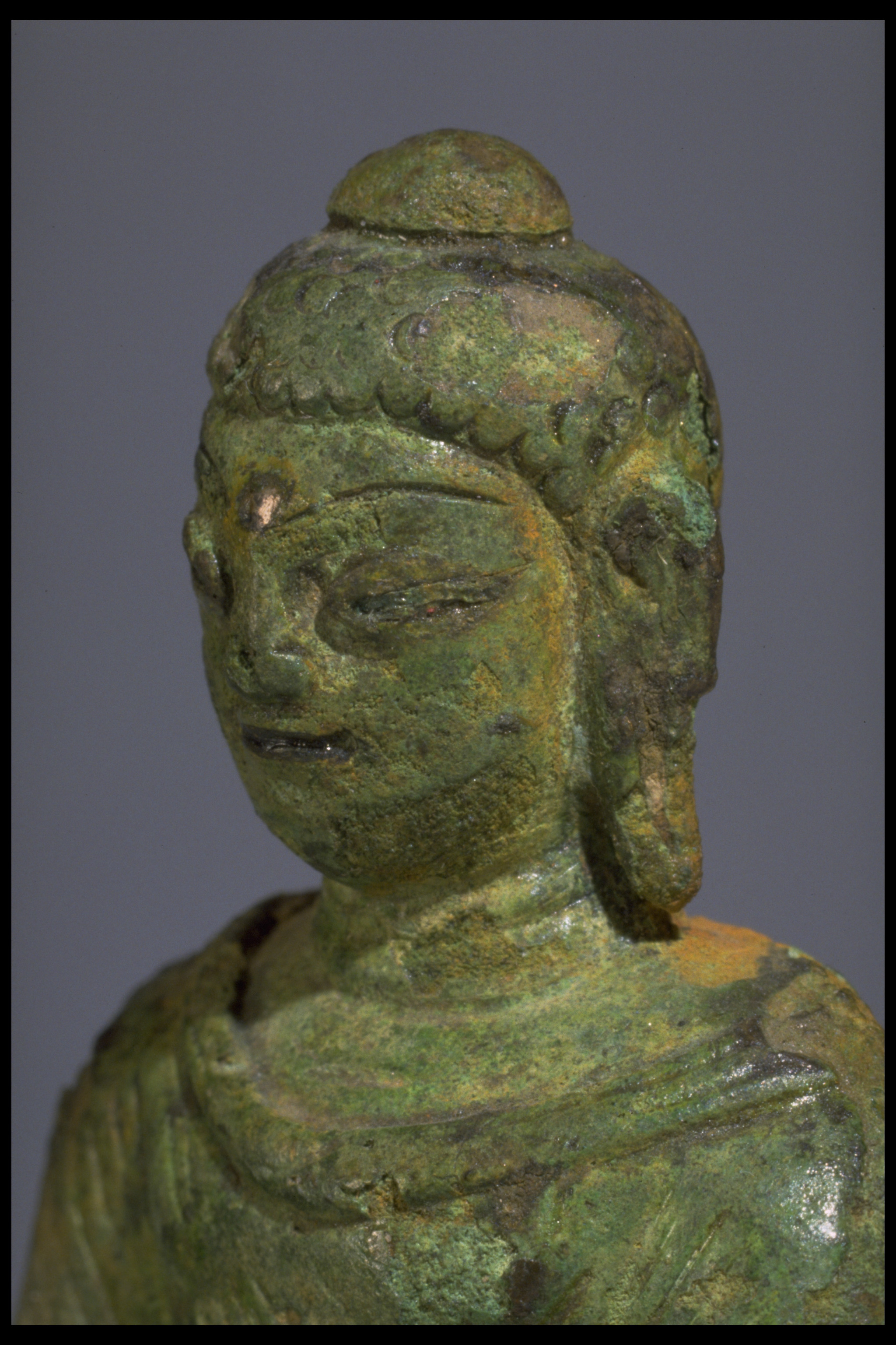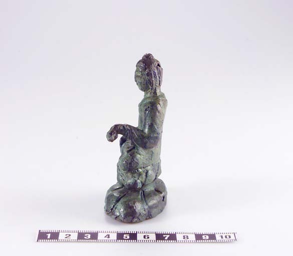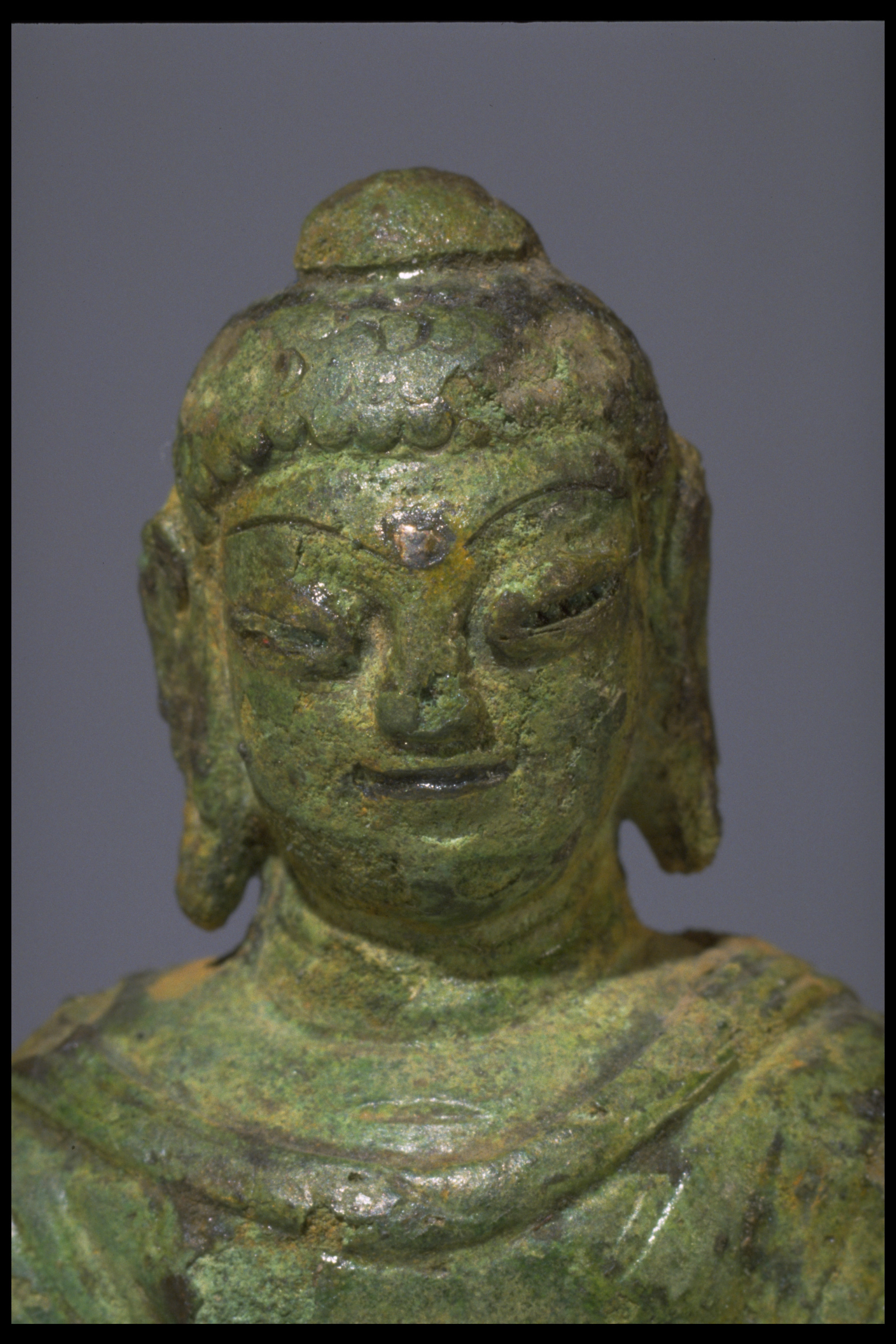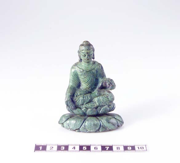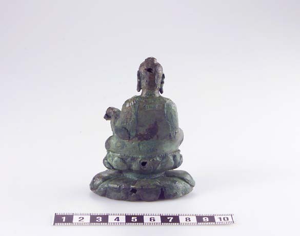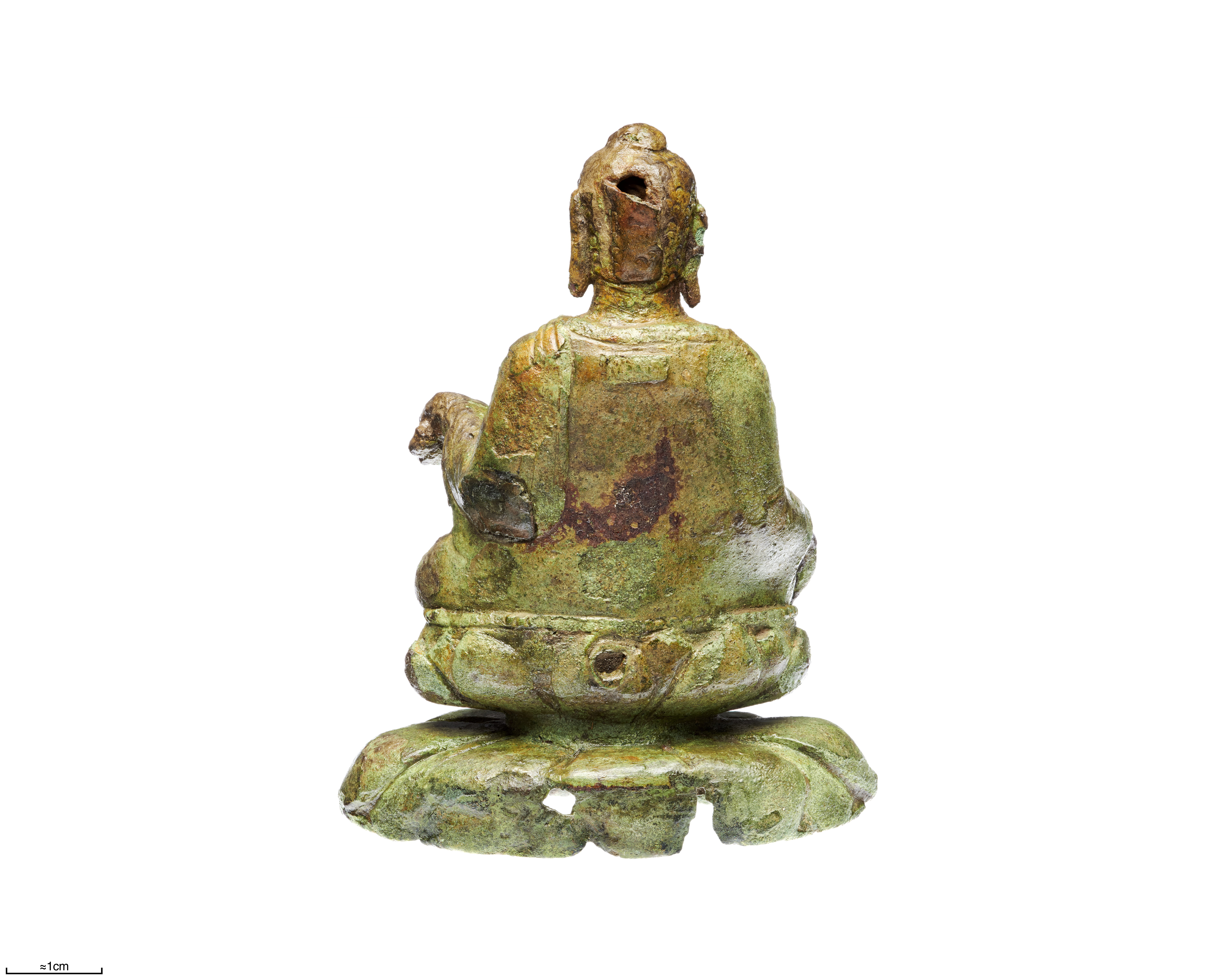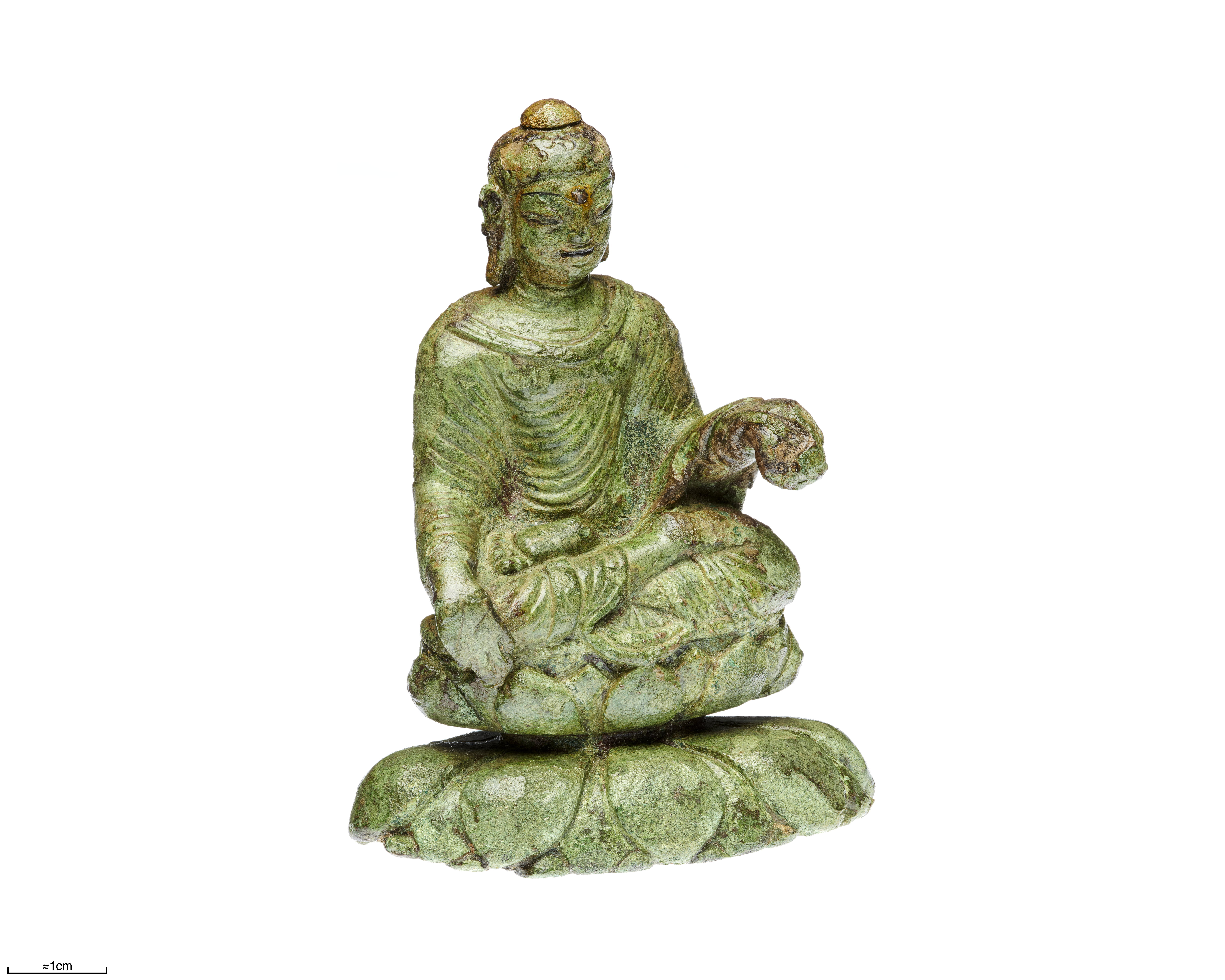 Buddhastatyett av brons. Buddha sitter på en tron utformad som en dubbel lotusblomma. I pannan syns det tredje ögat. Ögon och mun bär spår av färg och silver, det tredje ögat tycks ha varit i guld. Statyetten är tillverkad under sent 400- eller tidigt 500-tal, sannolikt i Swatdalen i nuvarande Pakistan. Boplatsfynd från Husgrupp 2 på Helgö, Ekerö socken, Uppland.