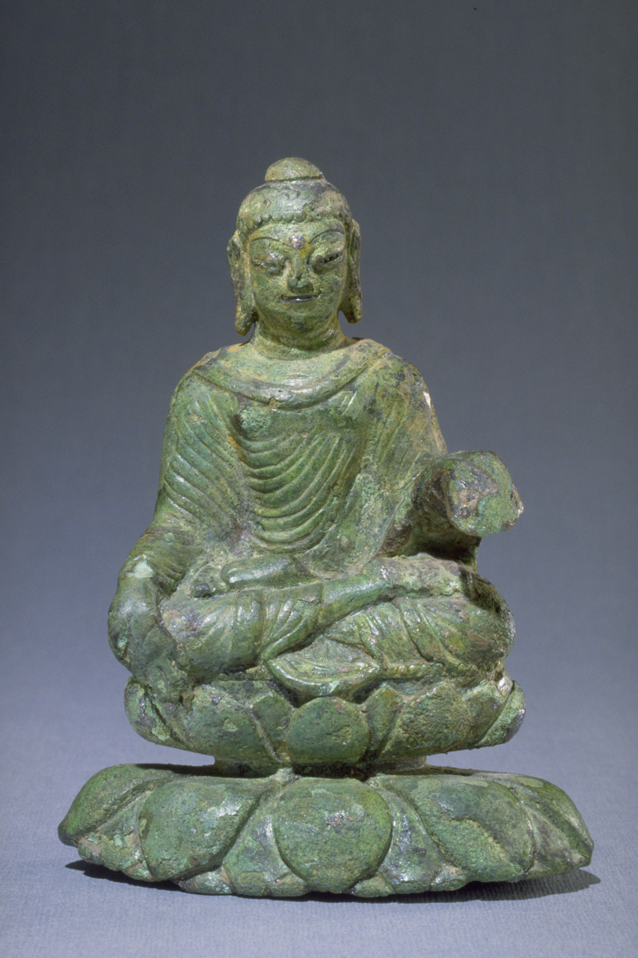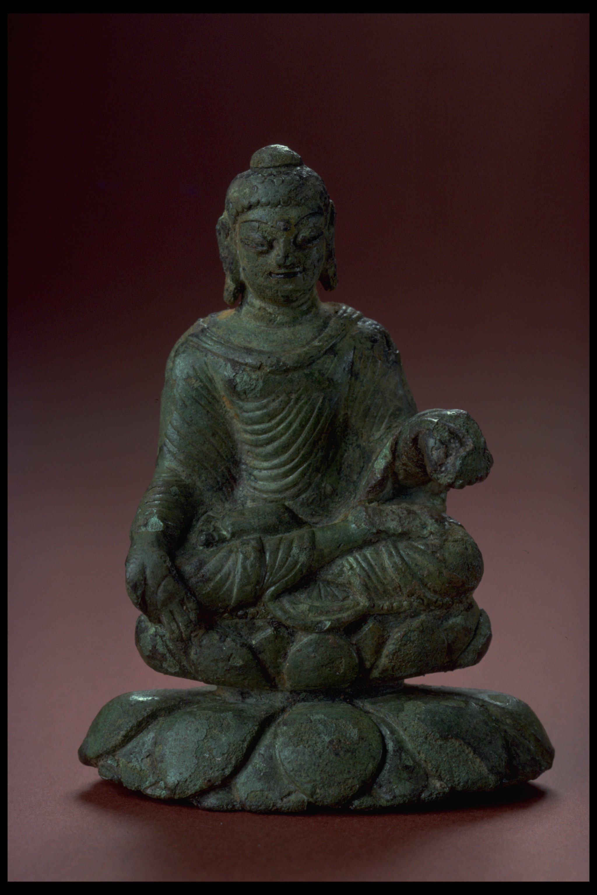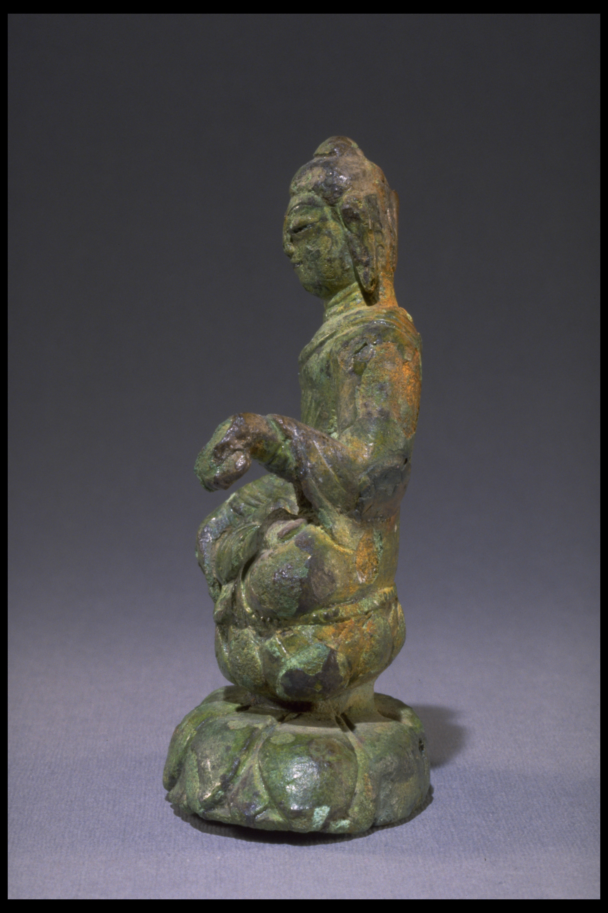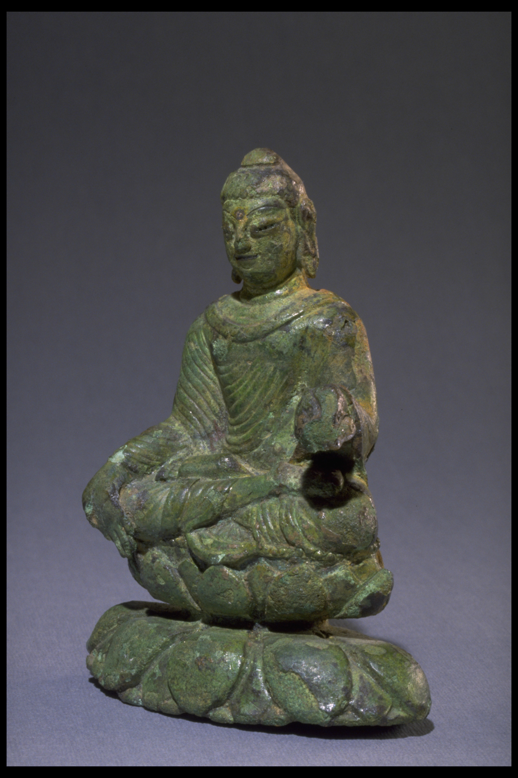 Buddhastatyett av brons. Buddha sitter på en tron utformad som en dubbel lotusblomma. I pannan syns det tredje ögat. Ögon och mun bär spår av färg och silver, det tredje ögat tycks ha varit i guld. Statyetten är tillverkad under sent 400- eller tidigt 500-tal, sannolikt i Swatdalen i nuvarande Pakistan. Boplatsfynd från Husgrupp 2 på Helgö, Ekerö socken, Uppland.