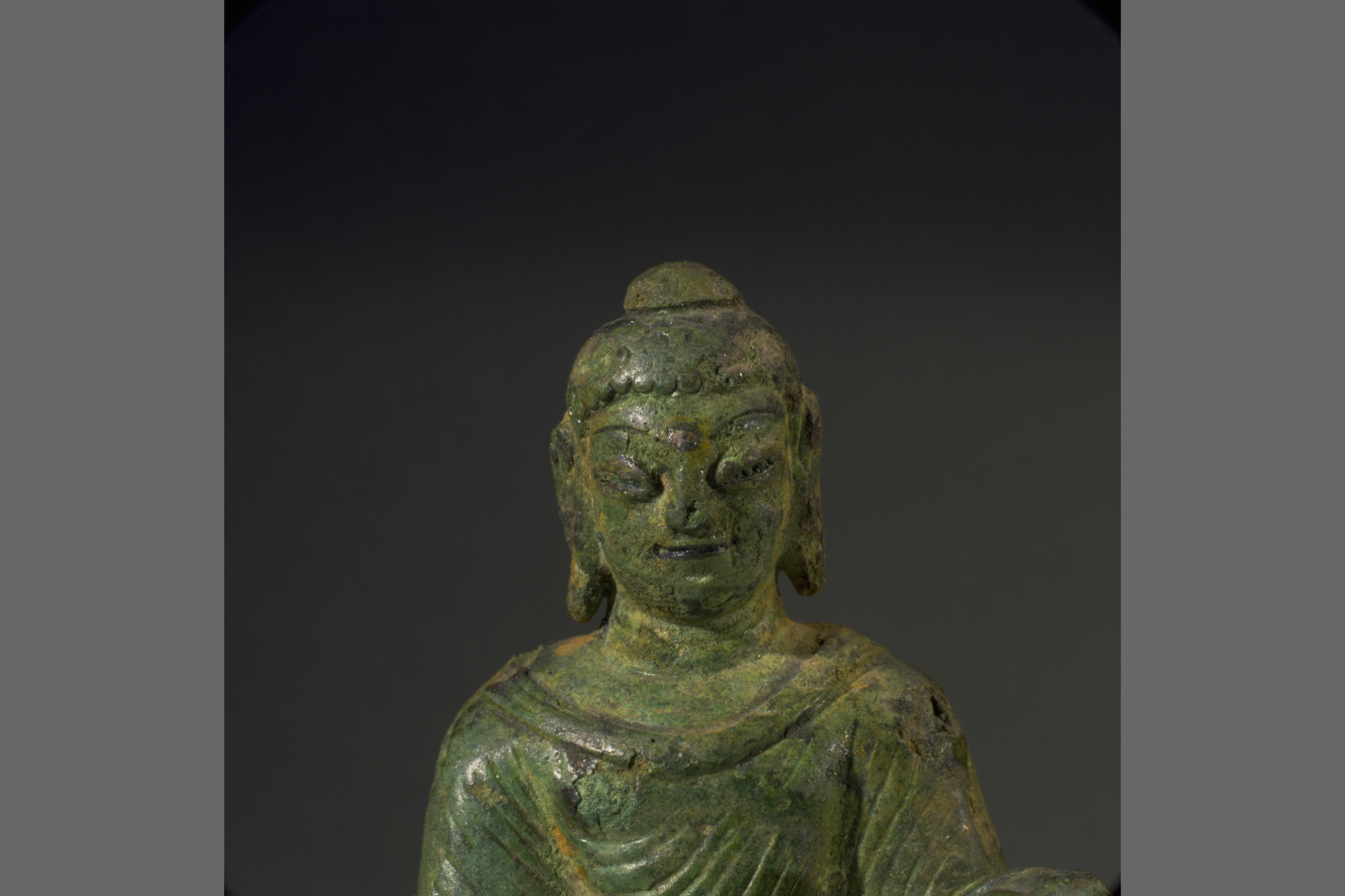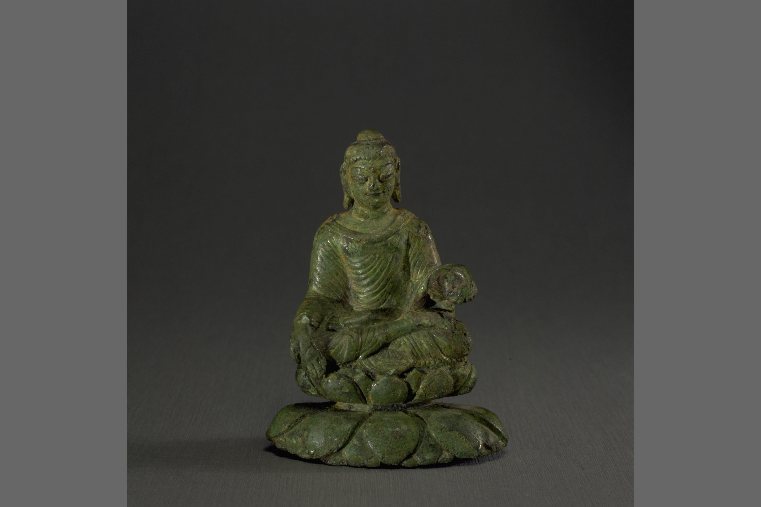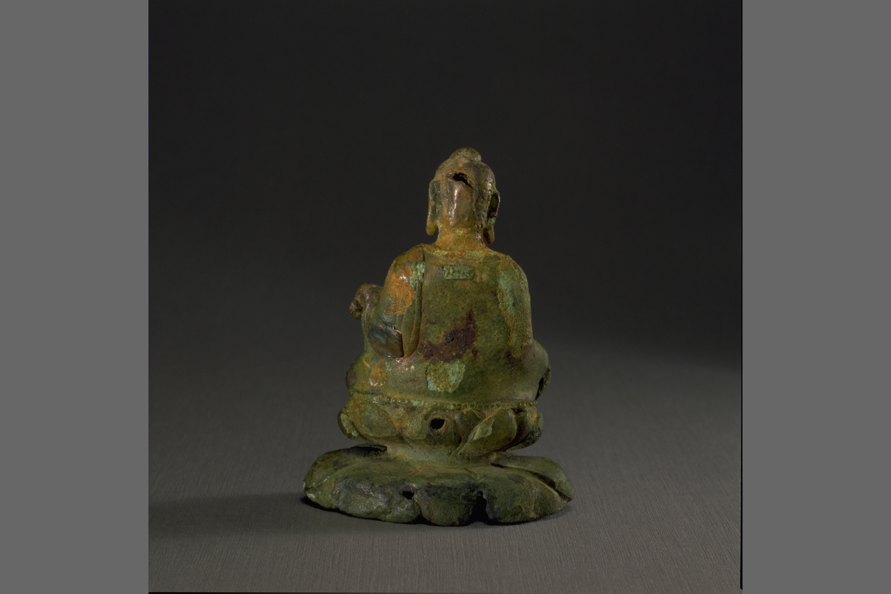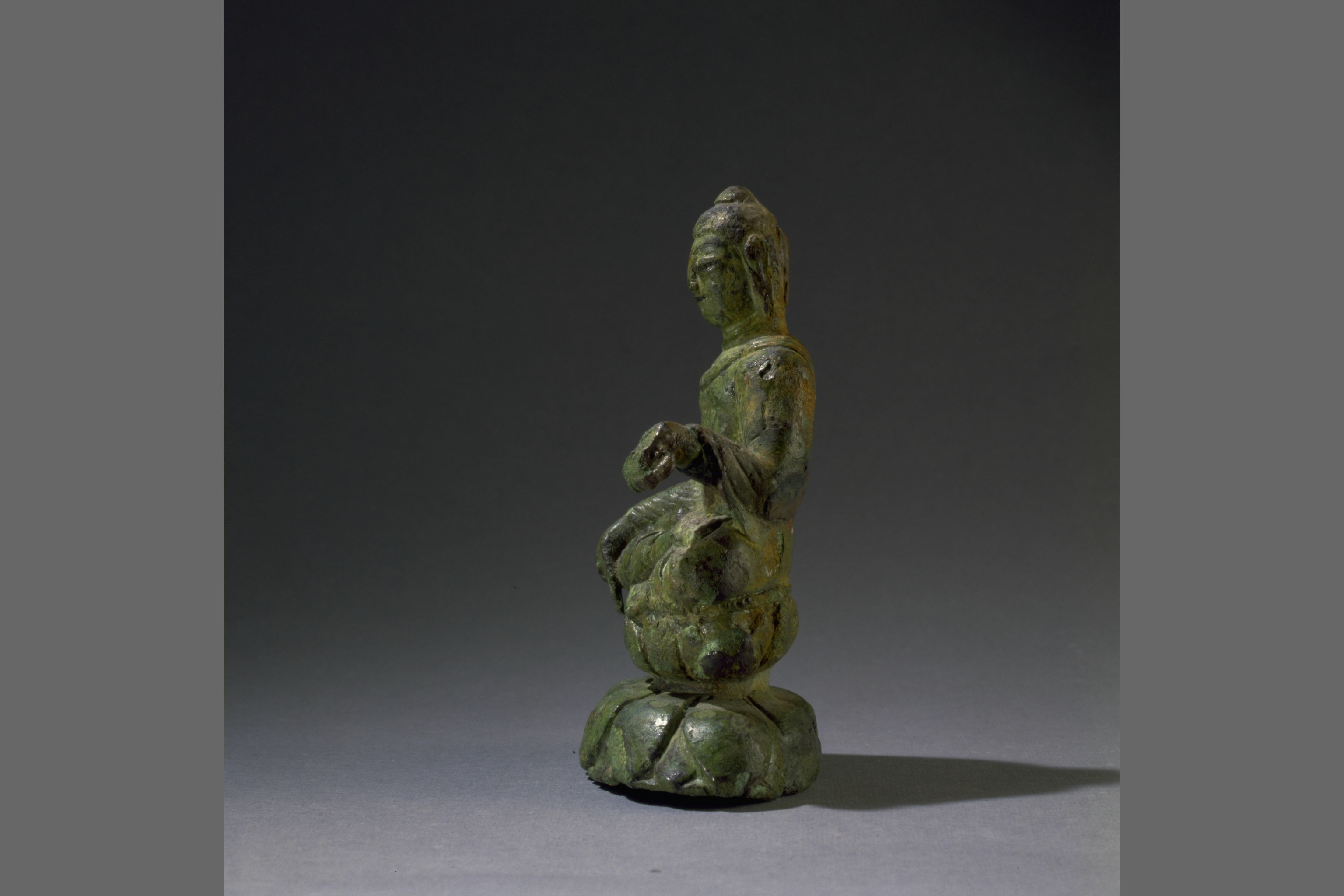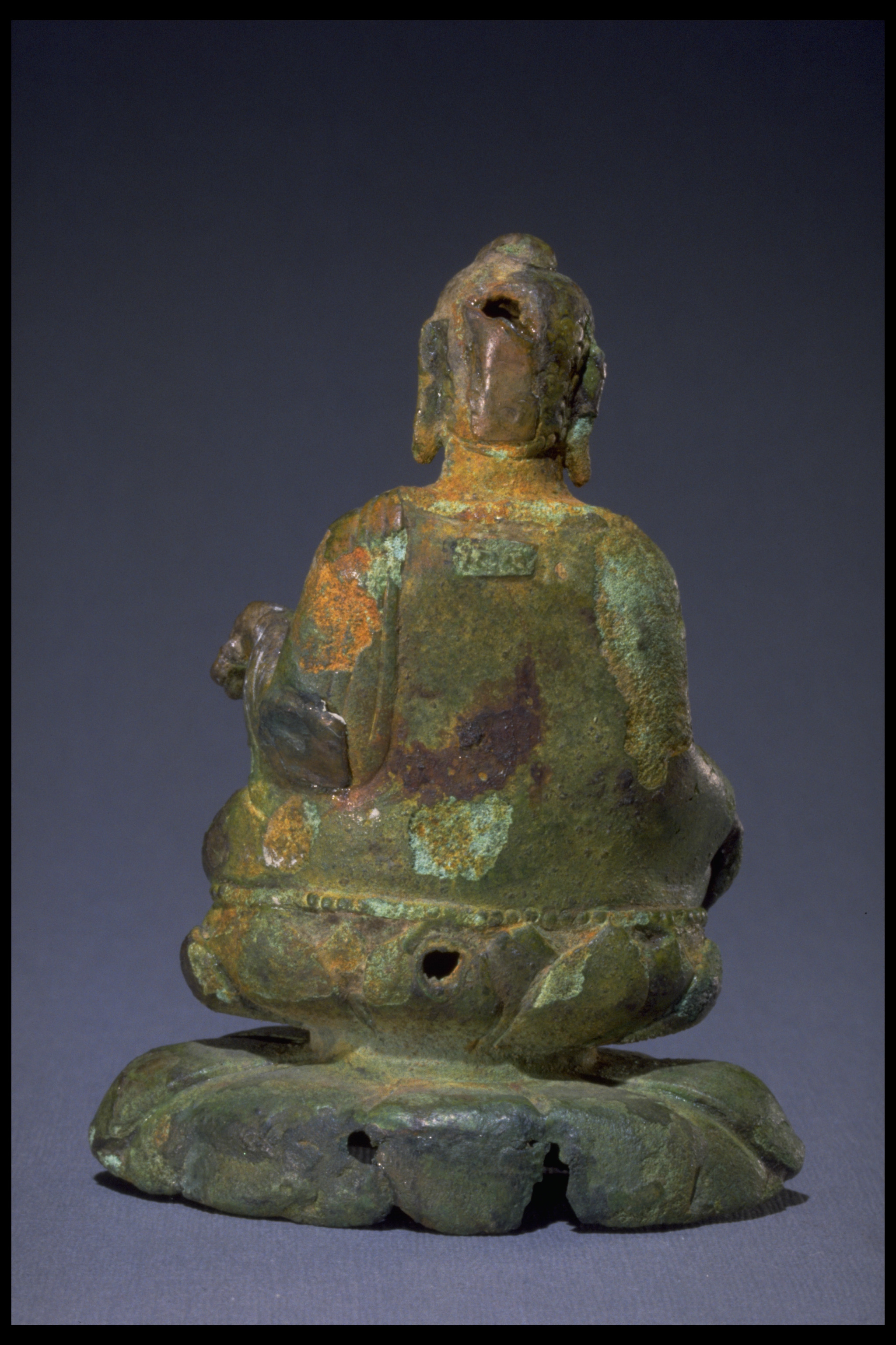 Buddhastatyett av brons. Buddha sitter på en tron utformad som en dubbel lotusblomma. I pannan syns det tredje ögat. Ögon och mun bär spår av färg och silver, det tredje ögat tycks ha varit i guld. Statyetten är tillverkad under sent 400- eller tidigt 500-tal, sannolikt i Swatdalen i nuvarande Pakistan. Boplatsfynd från Husgrupp 2 på Helgö, Ekerö socken, Uppland.