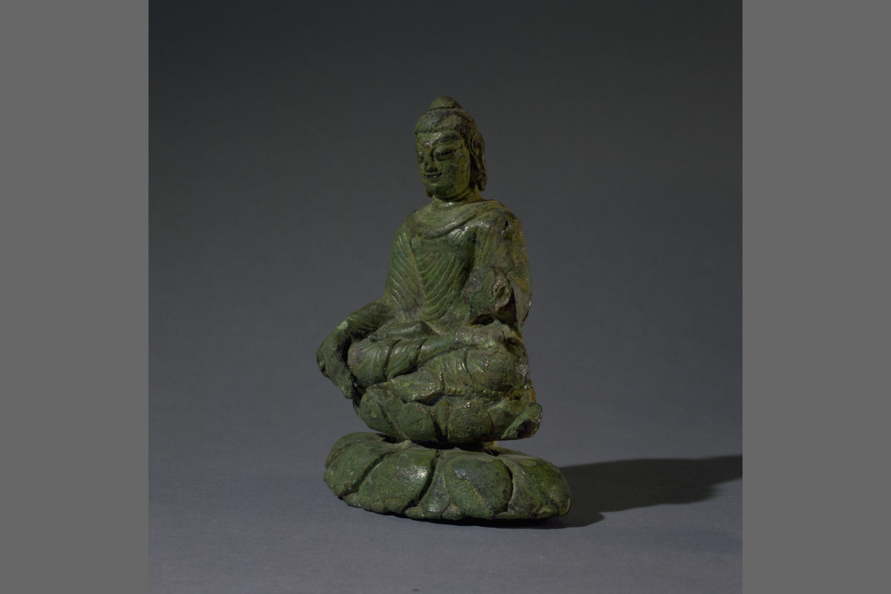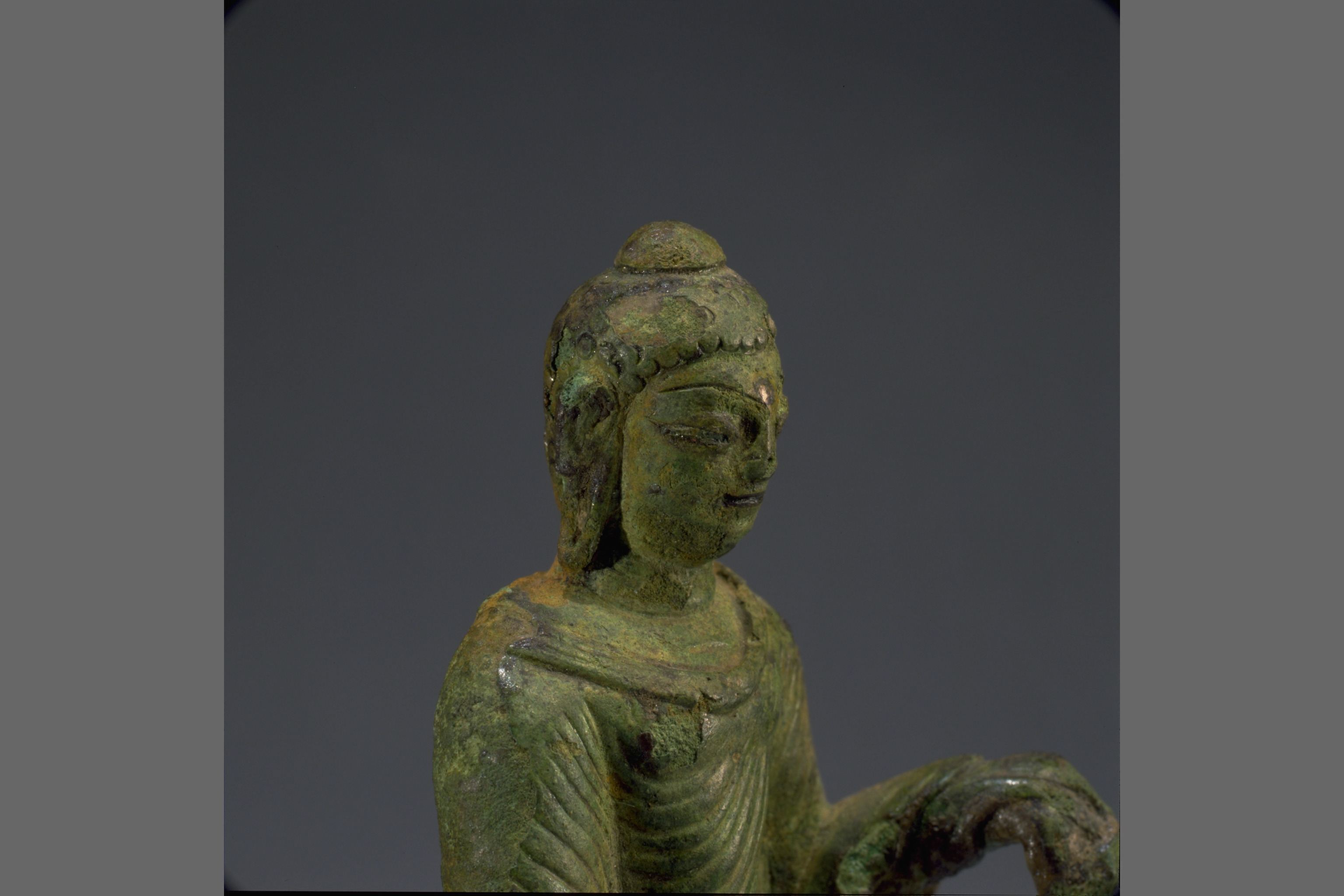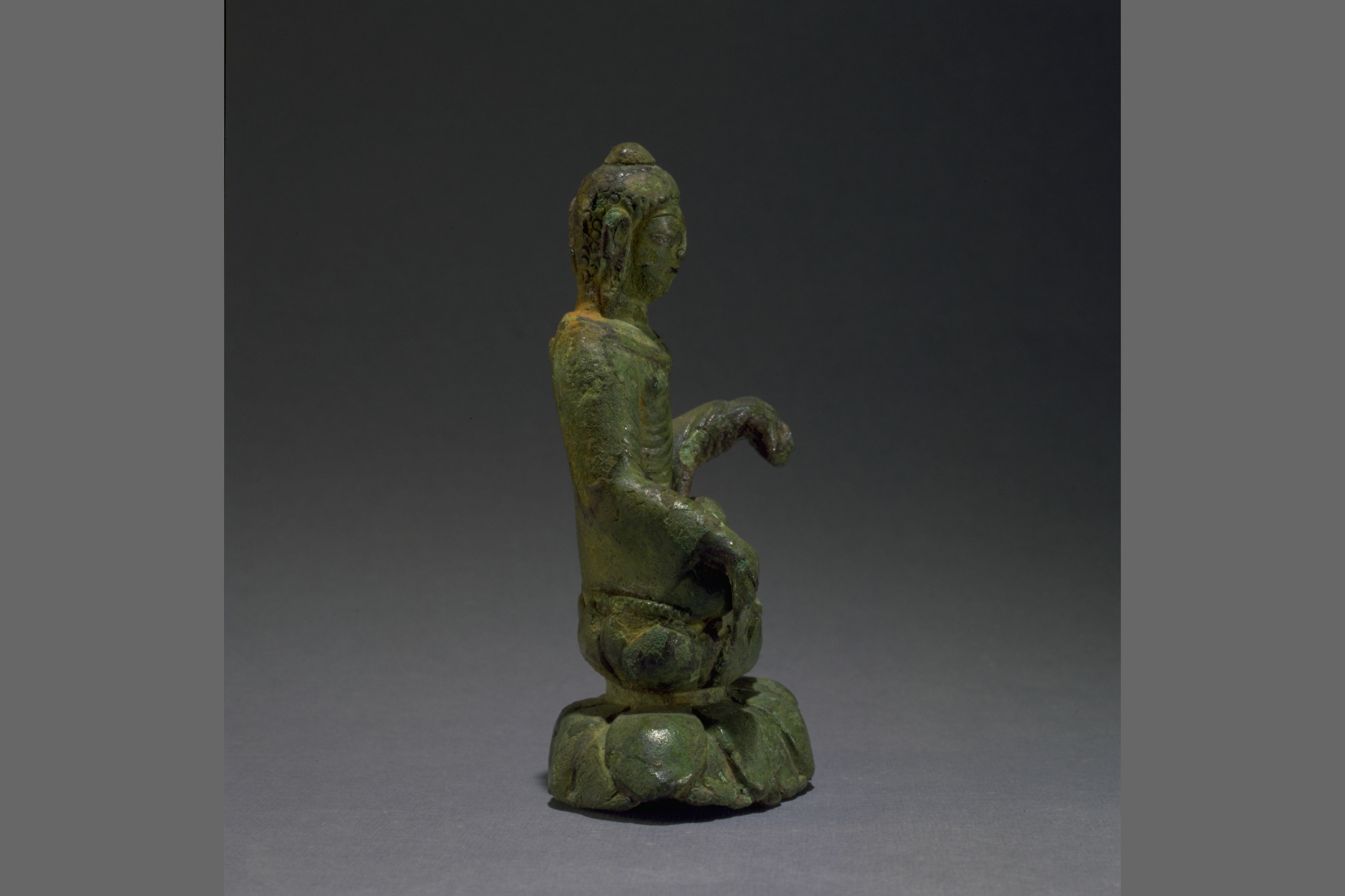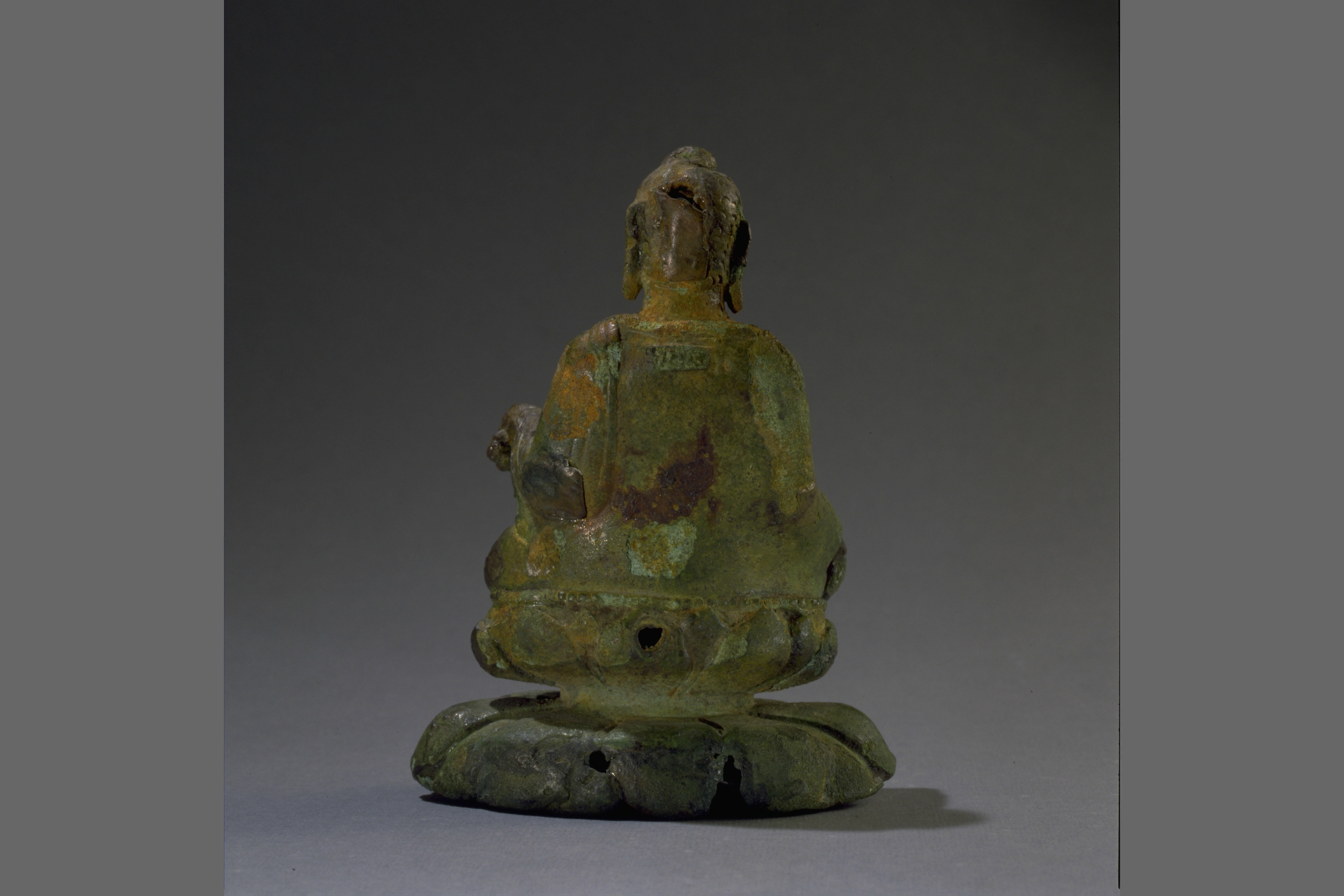 Buddhastatyett av brons. Buddha sitter på en tron utformad som en dubbel lotusblomma. I pannan syns det tredje ögat. Ögon och mun bär spår av färg och silver, det tredje ögat tycks ha varit i guld. Statyetten är tillverkad under sent 400- eller tidigt 500-tal, sannolikt i Swatdalen i nuvarande Pakistan. Boplatsfynd från Husgrupp 2 på Helgö, Ekerö socken, Uppland.