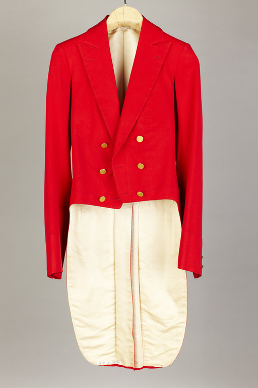 Frack av rött kläde med fällkrage och slag. Dubbelknäppt med två rader om tre plana mässingsknappar, d: 19 mm. På ärmarna med en söm markerade slag med sprund och tre plana mässingsknappar, d: 16mm. I skörtvecken upptill vid midjesömmen en plan knapp, som föregående, d: 19 mm.Skörten nedtill rundade. Foder av vitt siden med två bröstfickor. Tillbehör: svarta knäbyxor 13795, strumpor 20957-60, lösvader 20911-2 samt kalsong 20904.