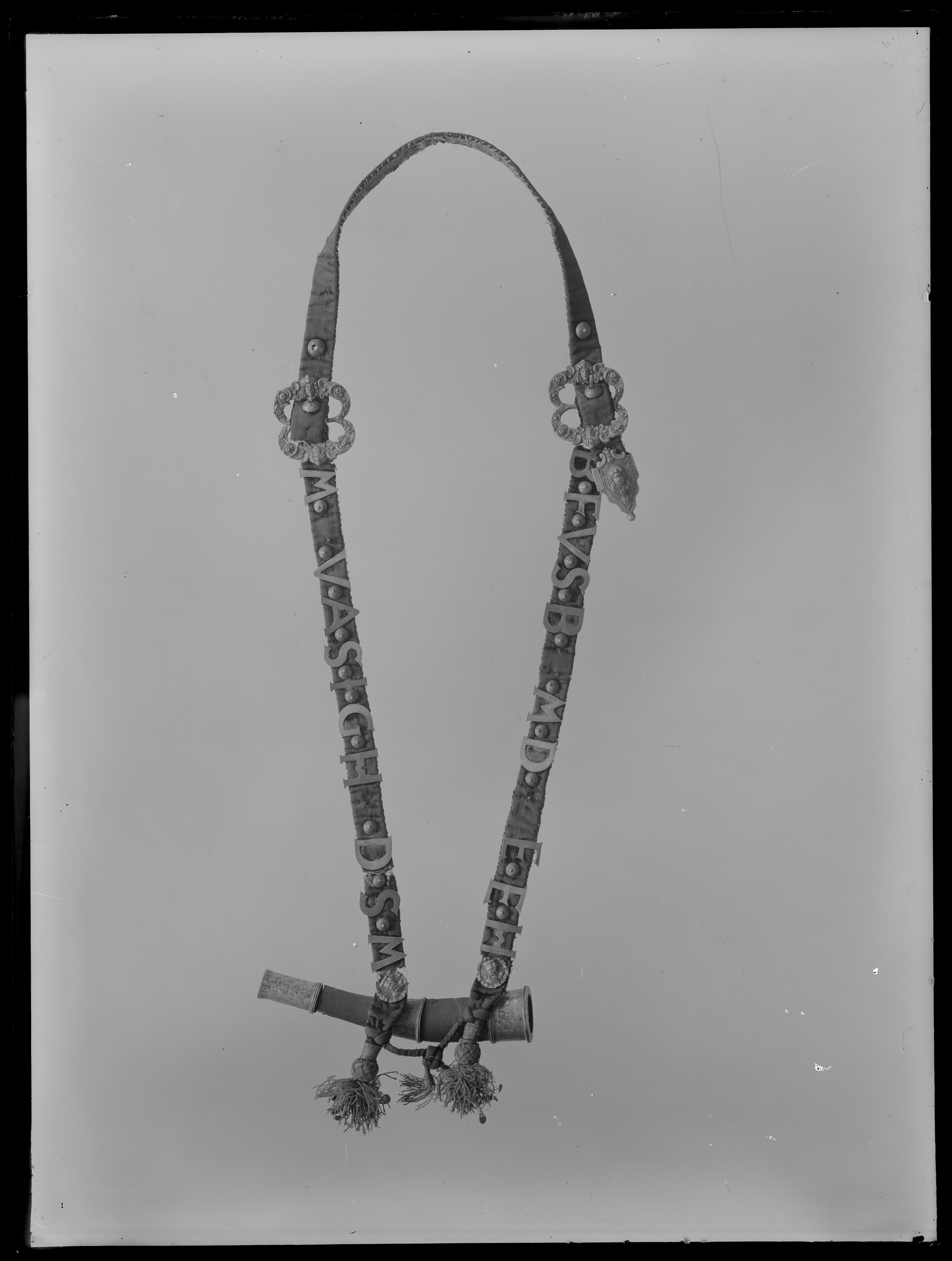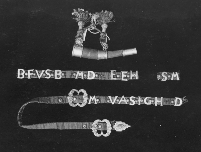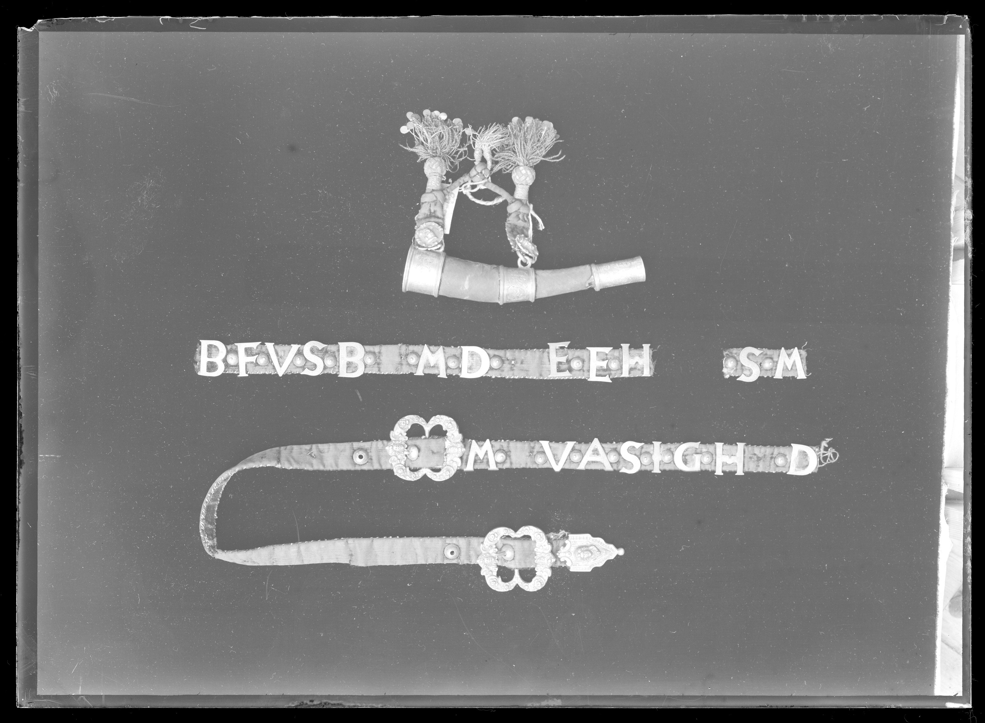 Svagt böjt jägarhorn av horn, på utsidan klätt med starkt sliten, svart sammet (floret kvar endast under beslagen). I ändarna beslag av förgyllt silver med graverad rankdekor. Mitt på hornet beslag av silver med samma dekor. På mitt- och mynningsbeslag ringar för fästning av gehänget.