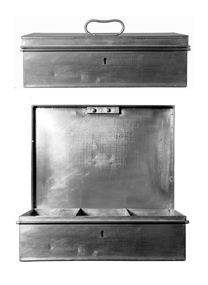SKRIN (kak-) Av bleckplåt. Rektangulär, med platt fällock. Kring skrinets övre och lockets nedre kant en utstående stav; ovanpå locket i mitten ett ovalt rundstavigt handtag av mässing, rörligt under en med fyra kopparnitar fäst övervikt plåtflik. Skrinet inuti med två tvärgående blakar, bildande tre fack; på framsidan ett lås med två i locket sittande låsöglor. (Nyckel saknas). Höjd: 12,6 cm.; längd: 41,5 cm.; bredd: 31,6 cm. Svensk tillverkning, Stockholm; firman Johan Ericsson & Co.