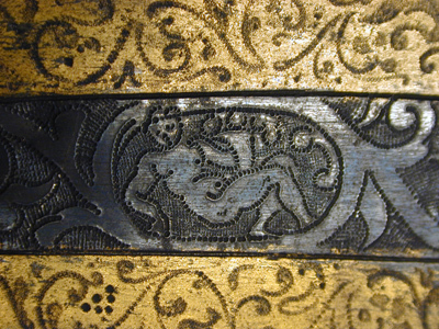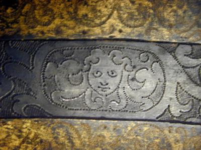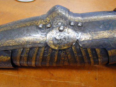 - 1 st Harnesk (på ena handsken felar några fingrar) med utstuckit arbete och förgylte ränder; best. af Cascquette, ringkrage, armskenor, bröst och ryggstycke, lår skenor och ett par handskar. komit ifrån Påhlen.