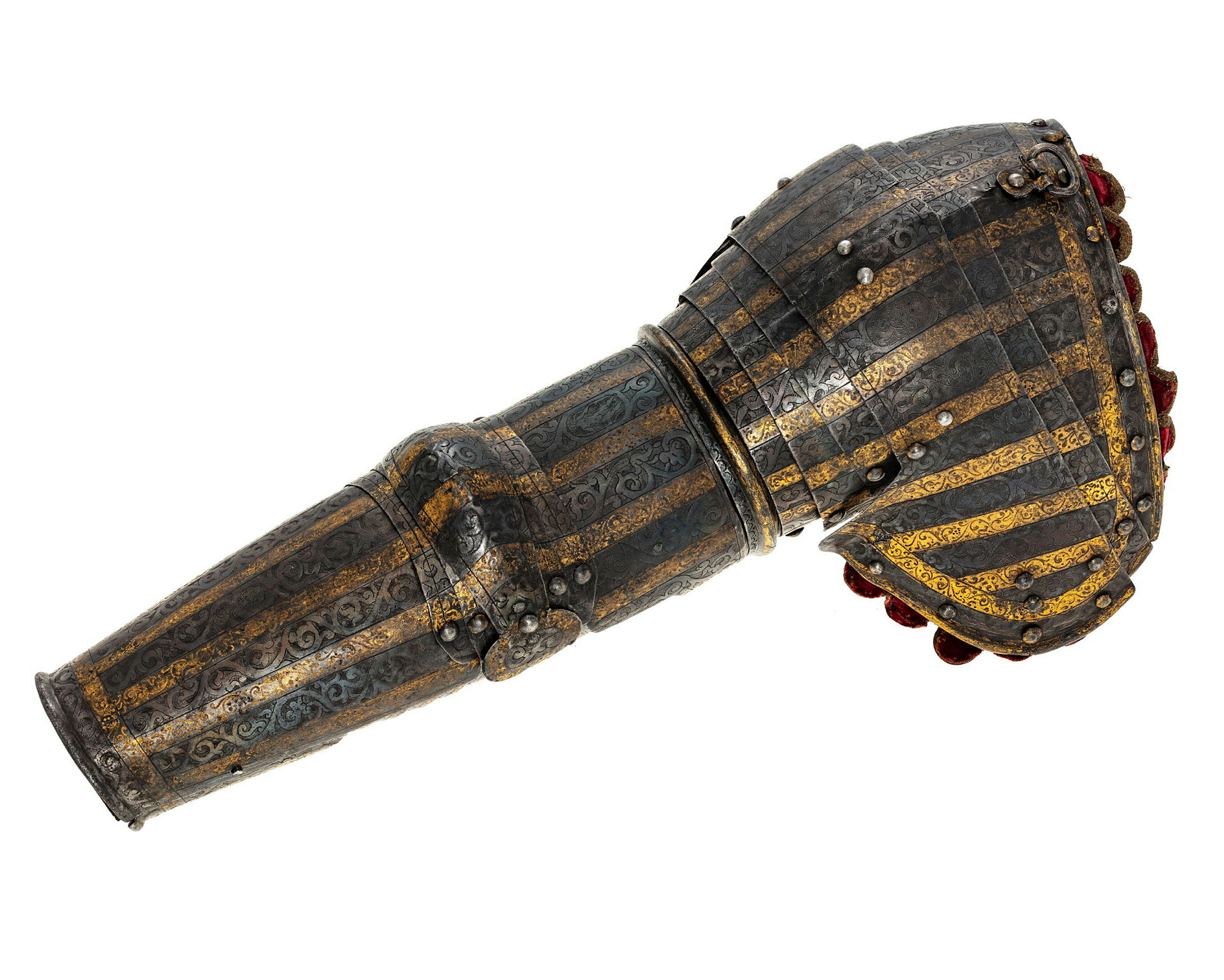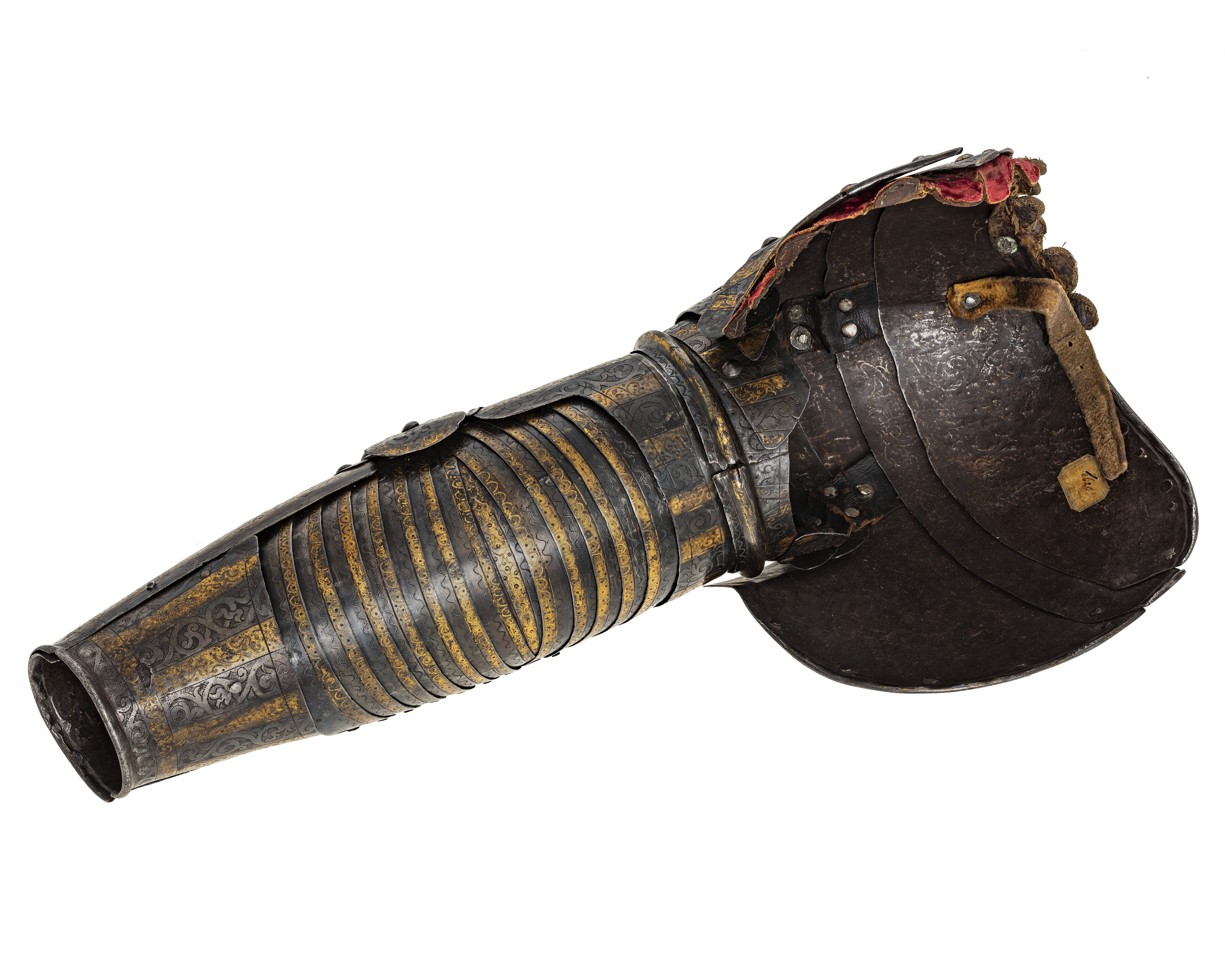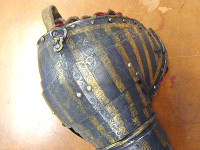 - Ett litet Harnesch af Järn, utstuckit arbete, med förgylte wänder uppå; Samma Harnesch består af Casqwett, Ringkrage, Armskenor, Bröst- och Ryggstycken, Lårskenor och ett par hanskar, Kommit ifrån Påhlen och Kostar - 90:-
