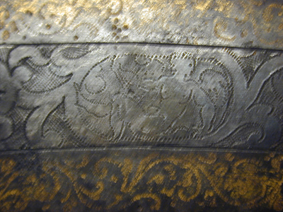 Obs rustningen har varit garnerad med udda af rödt sammet, kantade med silfvergalon, hvilken garnering likväl är bristfällig och till en del borta.