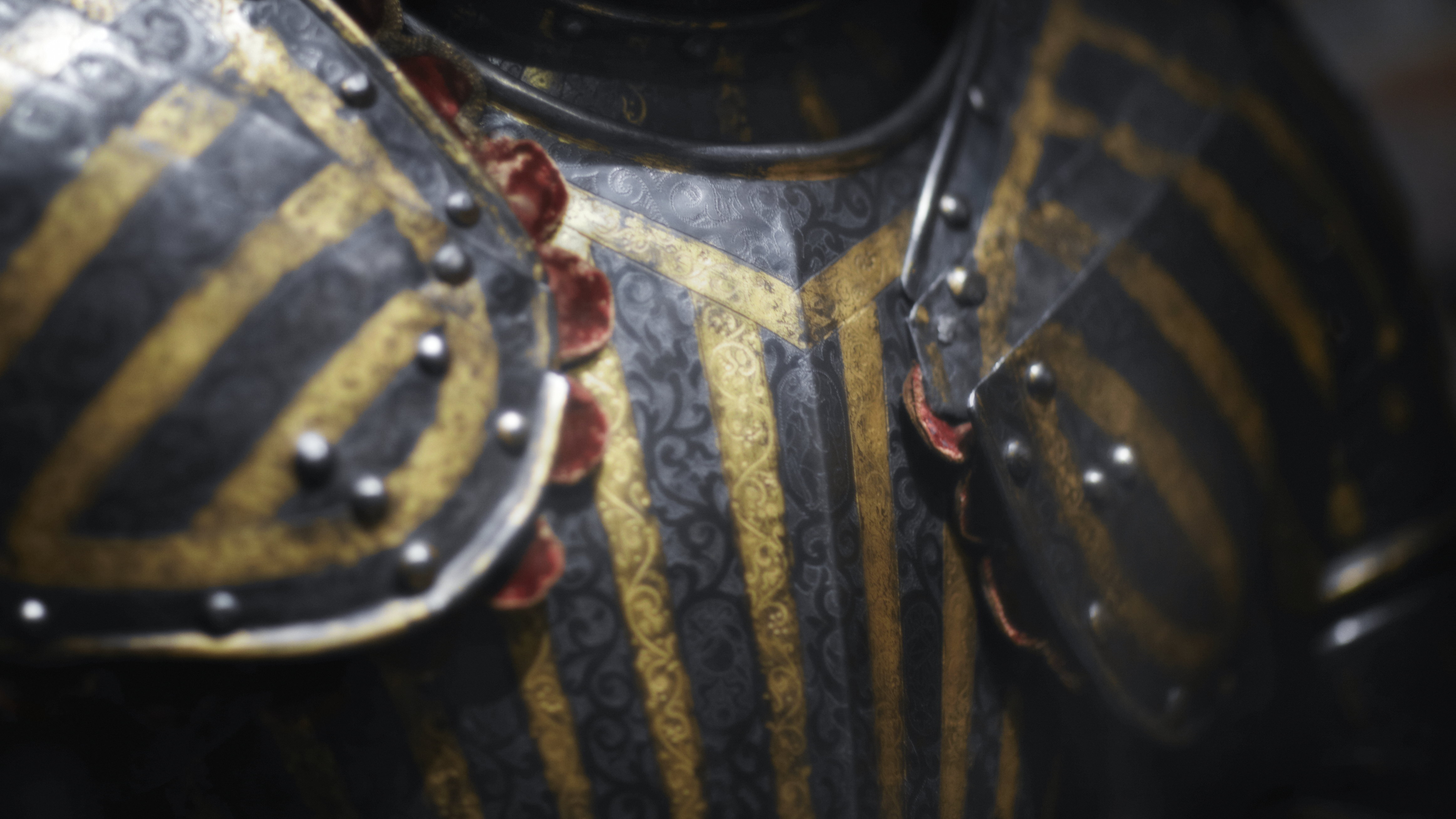 bröstharnesk med 2:ne axelsleifer af läder, klädda med rödt sammet och fastsatta med rosettformiga nitar - för lårskenornas fästande finnas 2:ne sleifer med skrifvar och muttrar af jern,