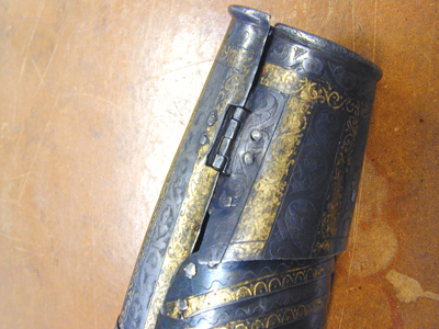 - Ett litet Harnesk af Jern, utstuckit Arbete med förgylde ränder uppå. Samma Harnesk består af Casquette, Ringkrage, Arm-Skenor Bröst- och Ryggstycke Lår-Skenor och ett par Handskar. Kommit ifrån Pohlen.