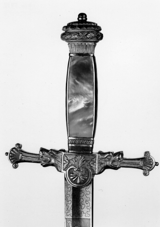 Enkelt korsfäste av förgyllt, reliefornerad mässing. Knapp liggande oval, profilering i form av bladkransar. Nitknapp profilerad. Kryss på utsidan med bladornament, insidan slät. Parerstänger raka, utgående från krysset i form av lejonhuvuden medparerstängernas yttre del i gapen, ytterändarna solfjädersformigt vidgade. Kavel med rektangulärt tvärsnitt, in- och utsidan belagda med pärlemor, smalsidorna av förgylld mässing. Klinga rak, eneggad fram till det ca 240 mm långa spetspartiet, där tvåeggad. Grund, bred hålkäl. Invid basen på båda sidor ett rektangulärt parti med etsat, finmönstrat ådernät. På starka delen polerade ornament mot mattetsad botten. På utsidan fasces med lagerranka, trofégrupp, strålande nordstjärna, palmkvist och laverkvist i kors. På insidan två korsade kanoner varöver ett standar, blixtknippe och trana som håller ett klot (vaksamhetens symbol), svärd omlindat av lagerranka.