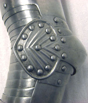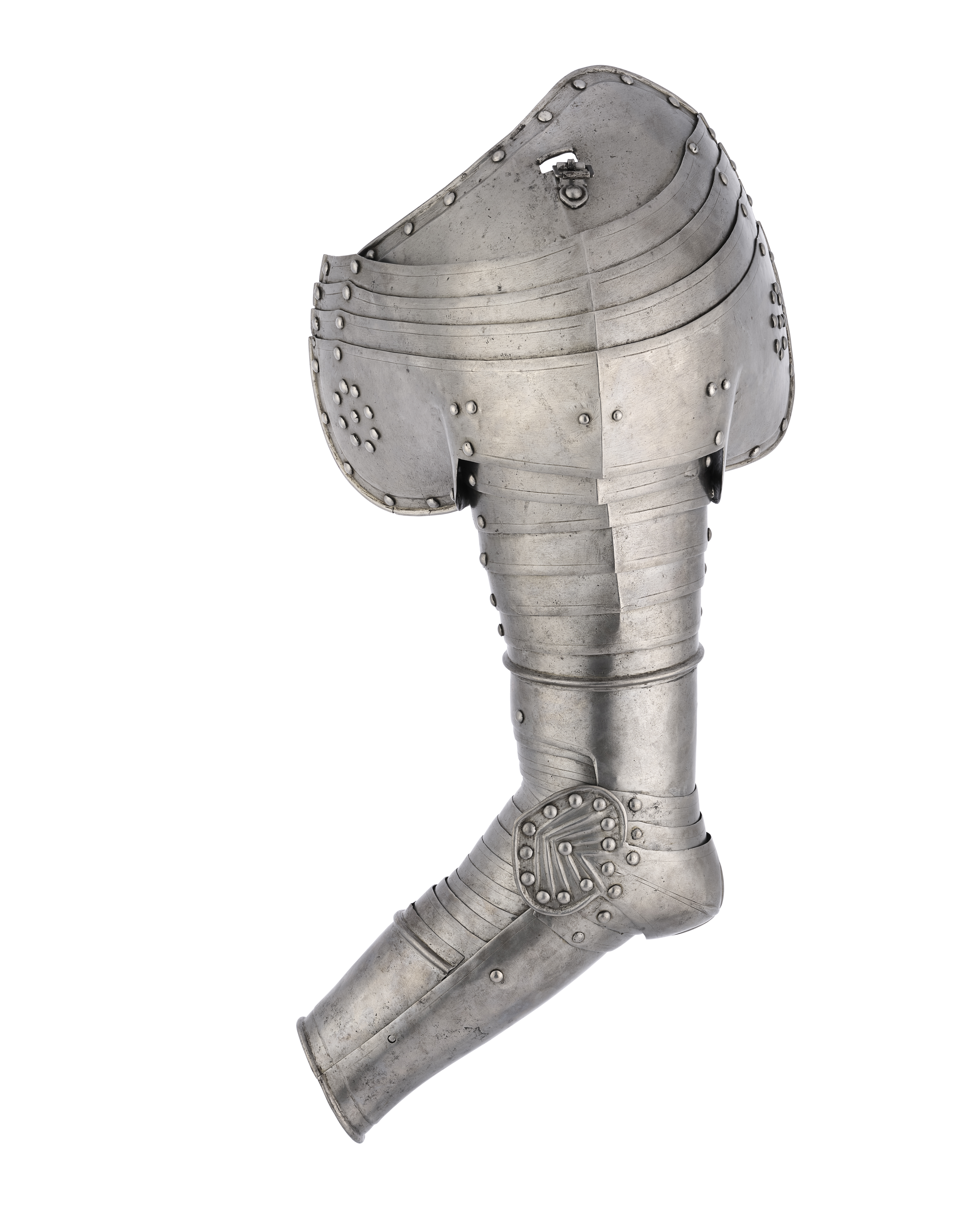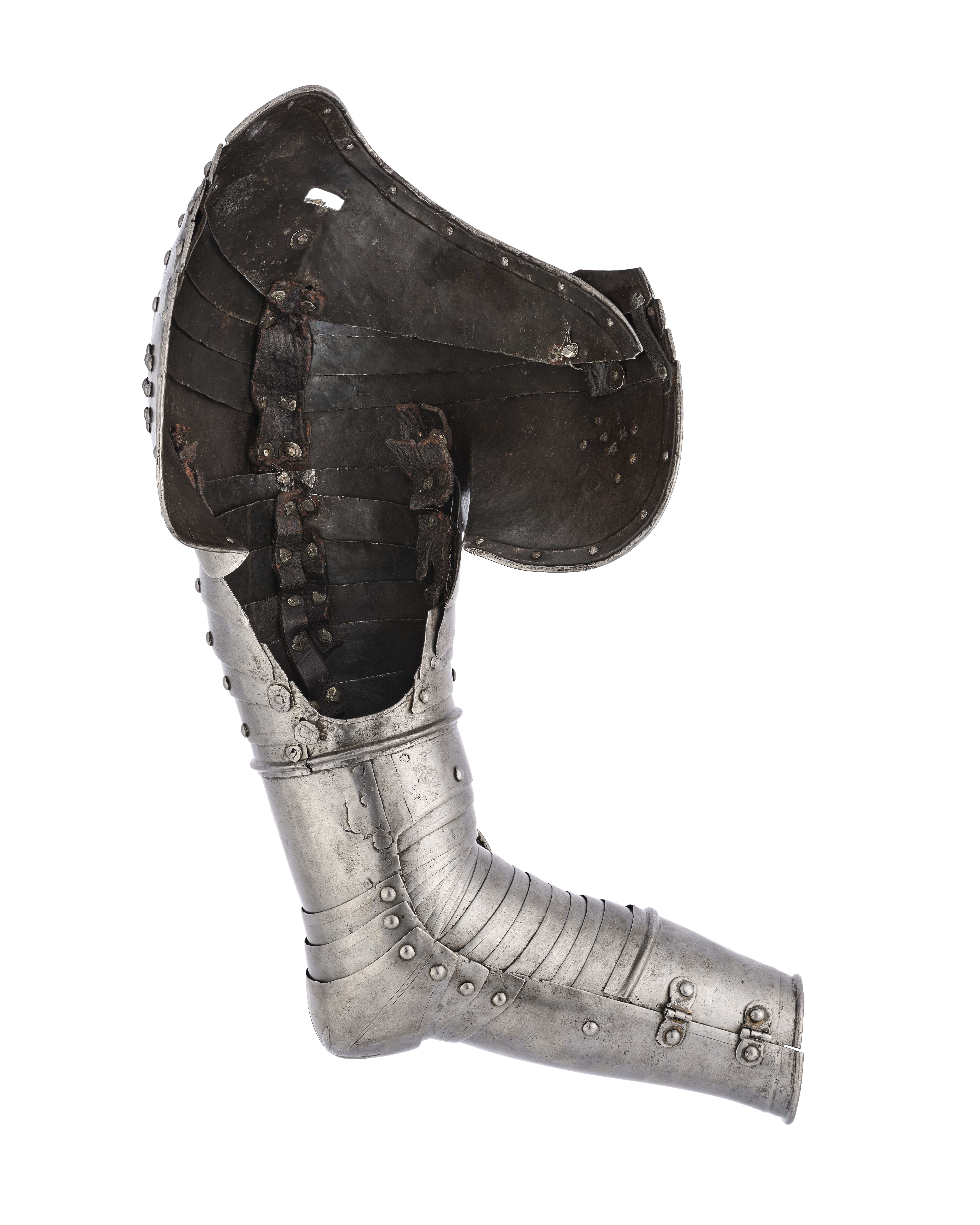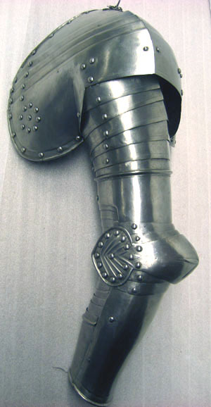 Av driven stålplåt med utidan blankpolerad och insidan brunsvart. Axelstycke av upptill och nertill två större skenor och mellan dessa tre mindre. Välvda med från axel och ner driven spetsig mittås. Övre skenan med rundad urtagning för nacken, över axeln rektangulärt hål med i övre kant pålödd klack och nedanför detta nitad sölja av stål. Nedersta skenan störst med utdragna rundade partier över skuldra och bröst. Urtagning mot armen med kanterna vinklade utåt. Över bröst och skuldra åtta dekorativa nitar, placerade i cirkel med en i mitten. Skenornas övre kant i mitten utdragen till svag spets. Överarmsdel, rörformig av två skenor i mitten sammanfogade med drivna koniska åsar löpande i varandra och bildandes en i sidled rörlig led. Mot insidan urtagningar för armen. I övre skenan sex välvda skenor placerade omlott, med mot insidan urtagning uppåt ökande i bredd. Armbuckla, välvd, b 65 mm, med dekor av driven fembladig blomma. Avsmalnande åt sidorna och utåt övergående i mussla. Musslan oval med yttre kanten utdragen till spets. Dekor av fem drivna V-formiga åsar och nitar längs kanten. Över och under bucklan två mindre skenor. Armvecket täcks av 14 mindre skenor, välvda med ristad kantlinje. Underarmsdel, rörformig av två halvor, nedåt svagt avsmalnande. Fästade i varandra med två gångjärn på insidan och tapp genom hål på utsidan. Inre skenan kortare med upptill rundad urtagning. Alla yttre kanter omvikta, rundsmidda och med nitar i rad. På insidan svärtade läderband.